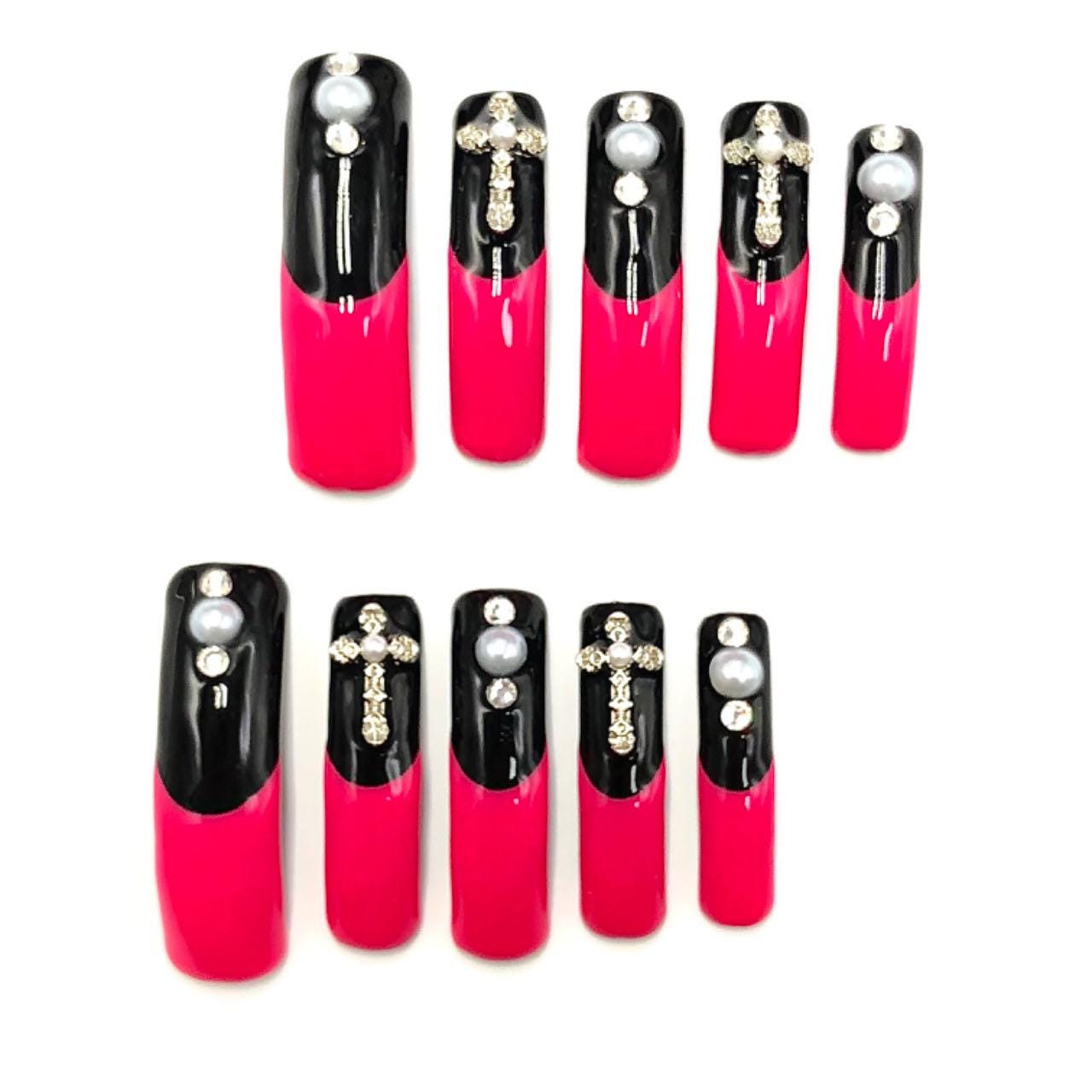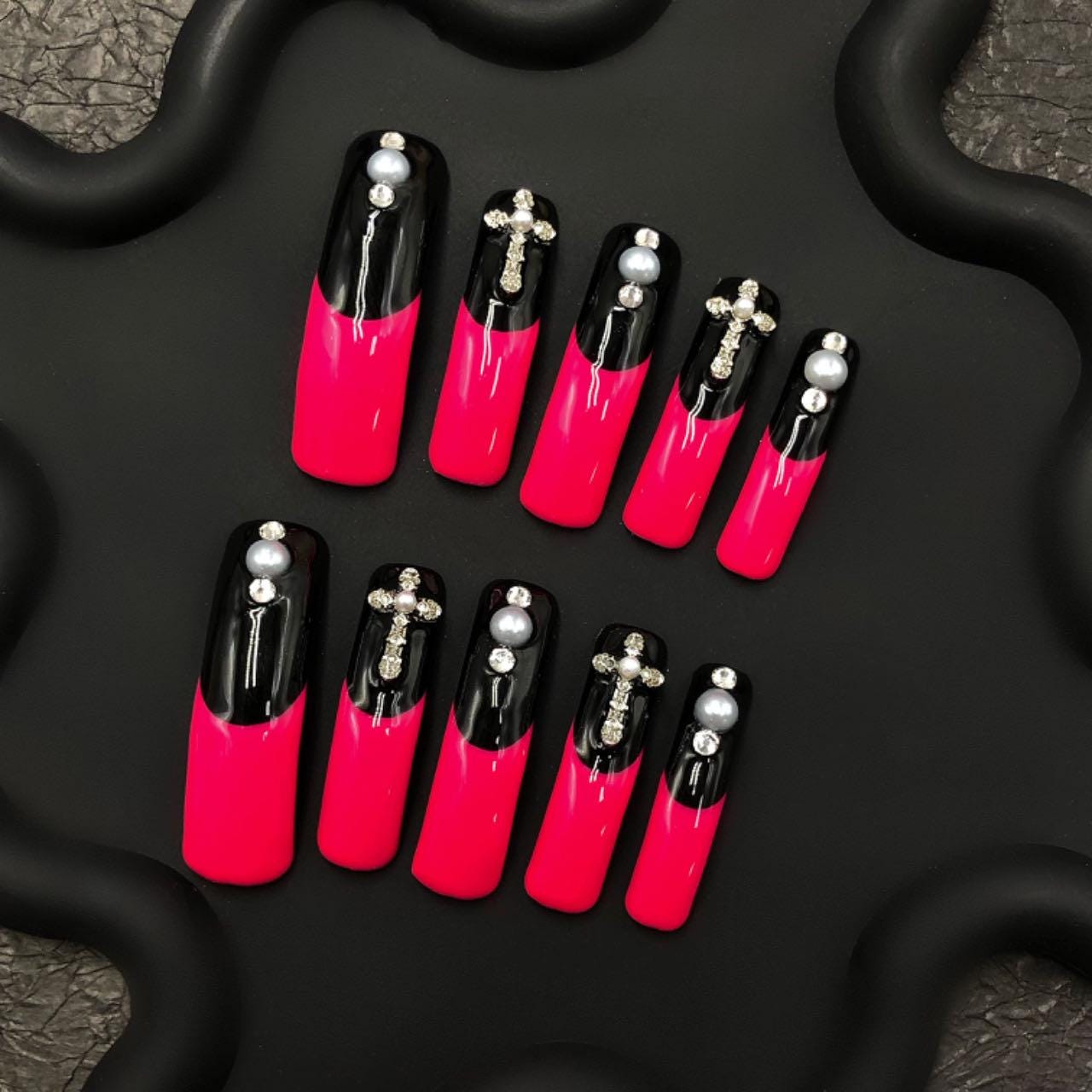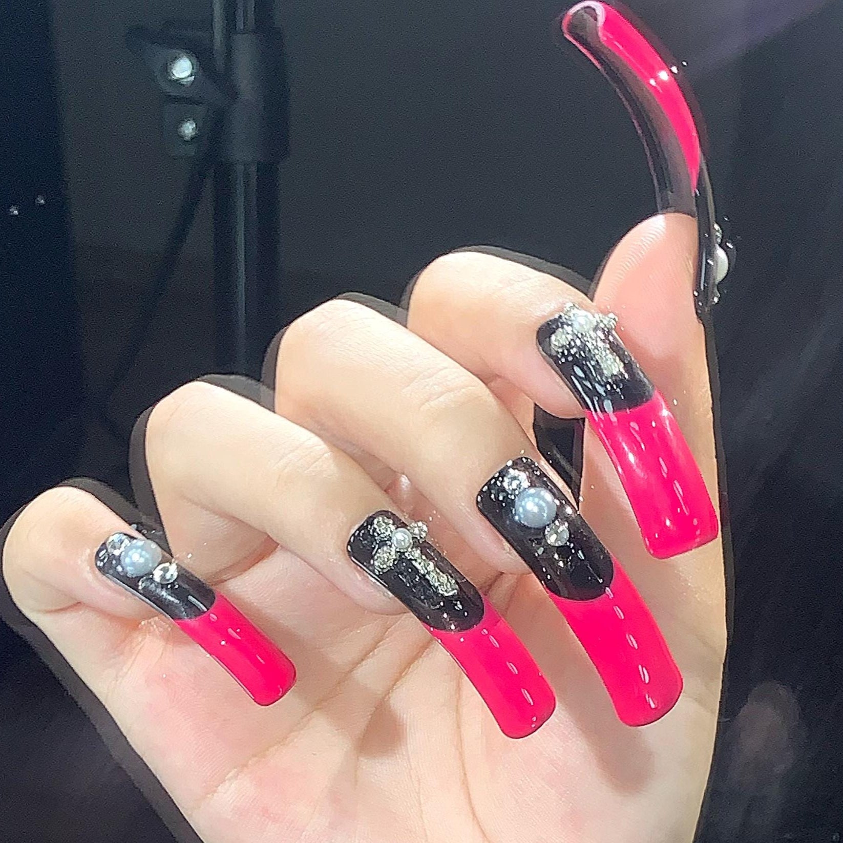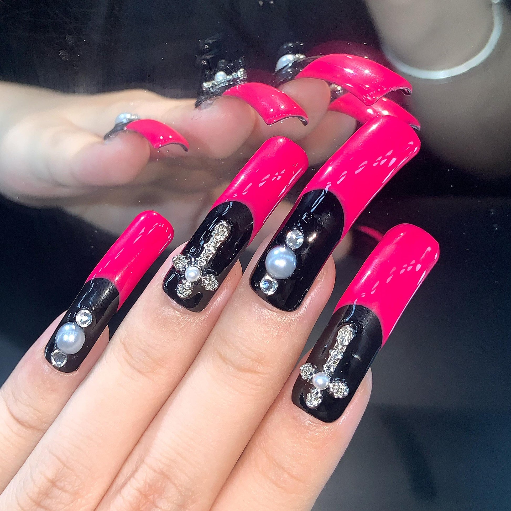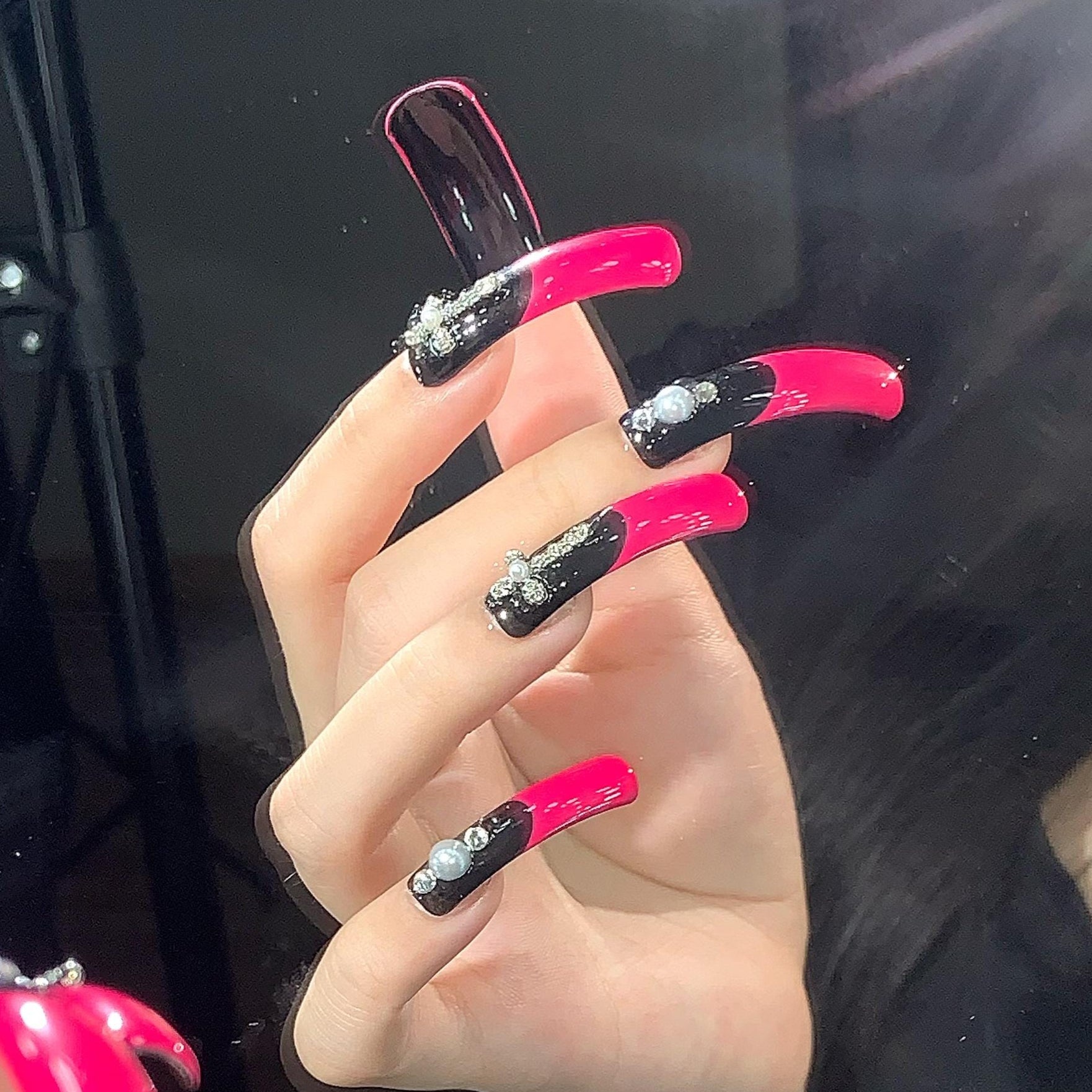 Fierce meets feminine with these dramatic hot pink and black curved press-on nails. Featuring a glossy two-tone design adorned with pearl and rhinestone embellishments, this long sculpted set channels major Y2K baddie vibes. Perfect for bold fashionistas who love to stand out with every gesture.