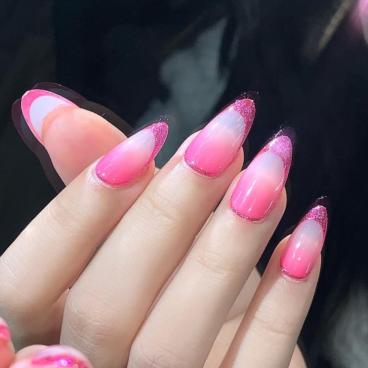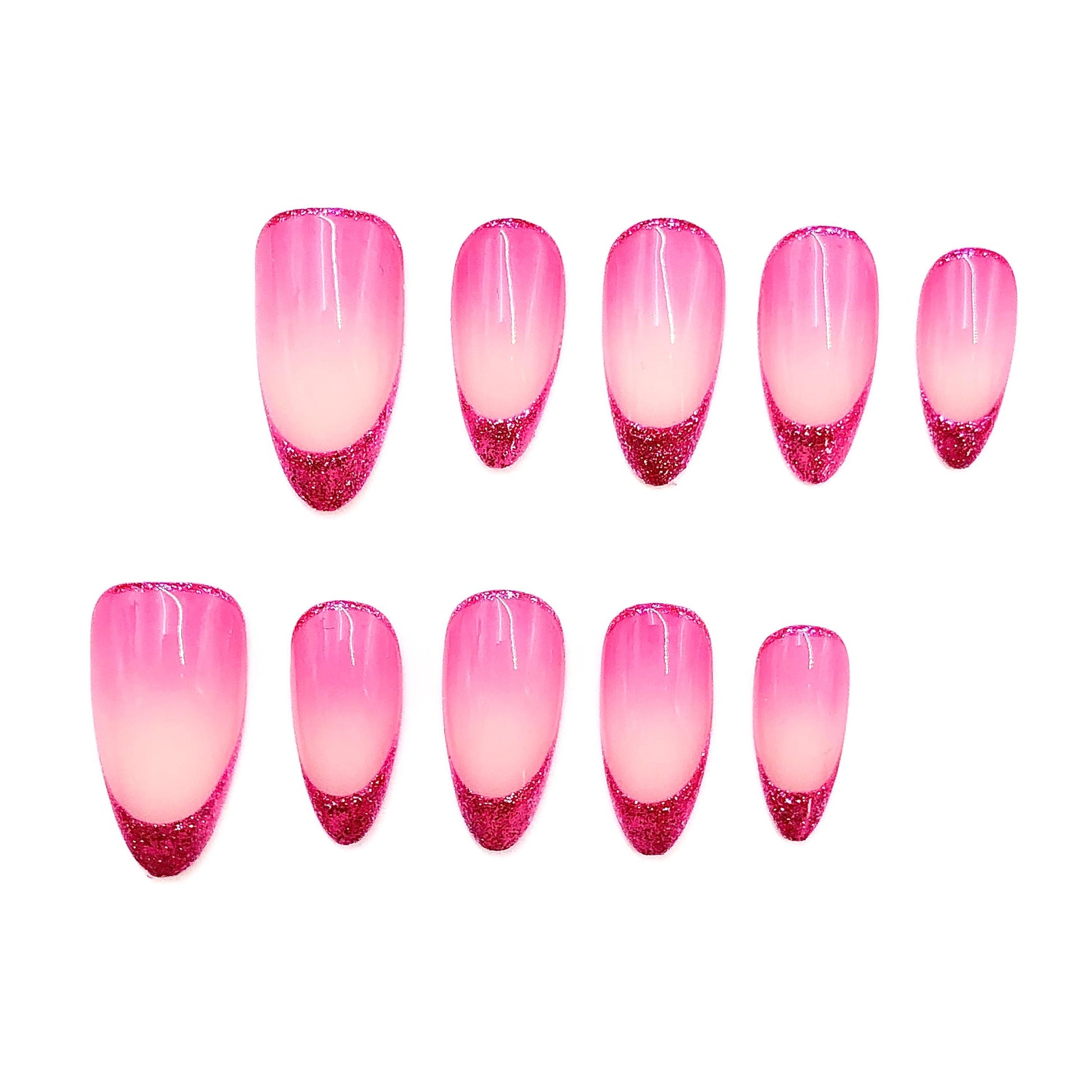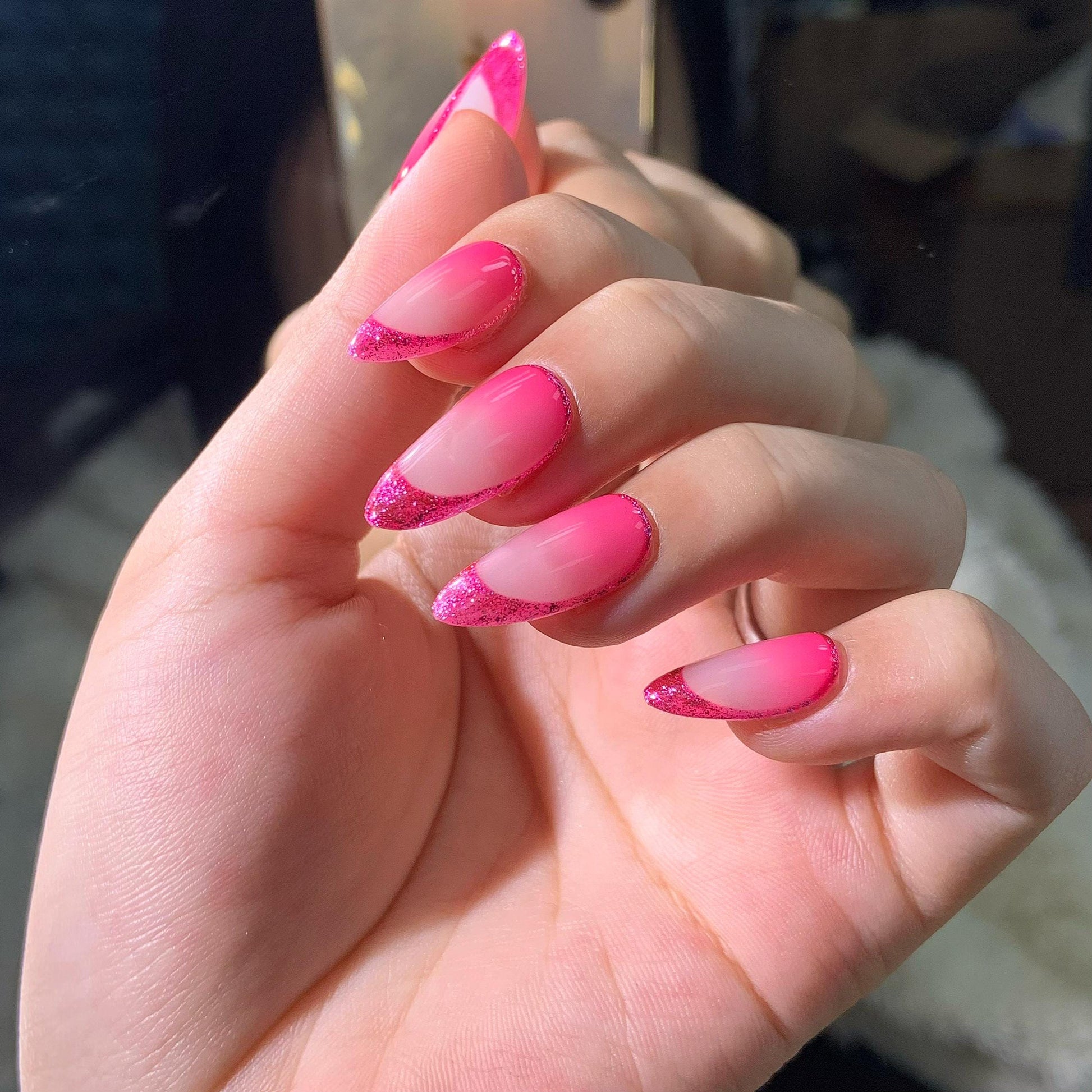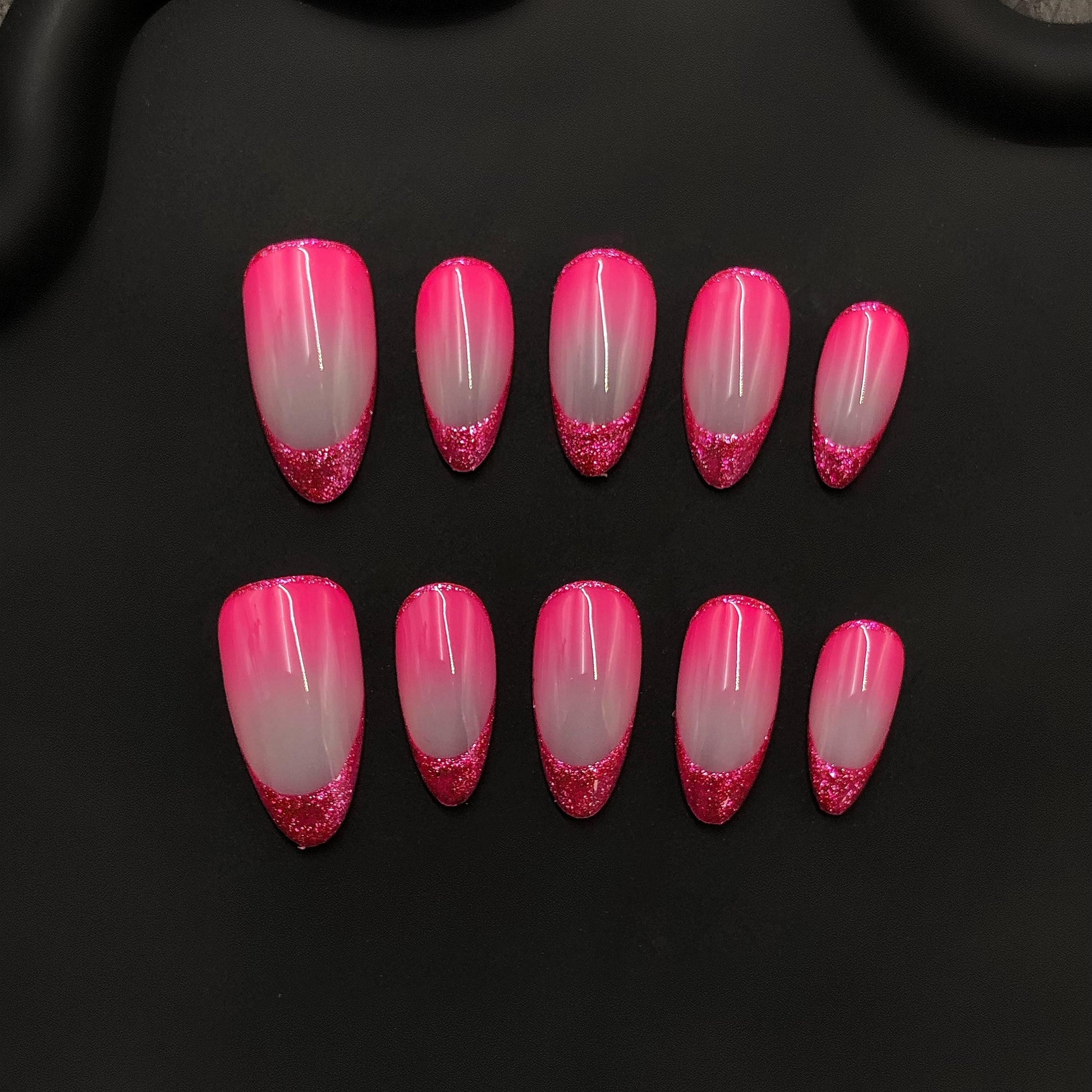 Hot Pink Glitter French Tip Press-On Nails, vibrant short almond nude base sparkling glitter bold babes and party ready artificial glue on