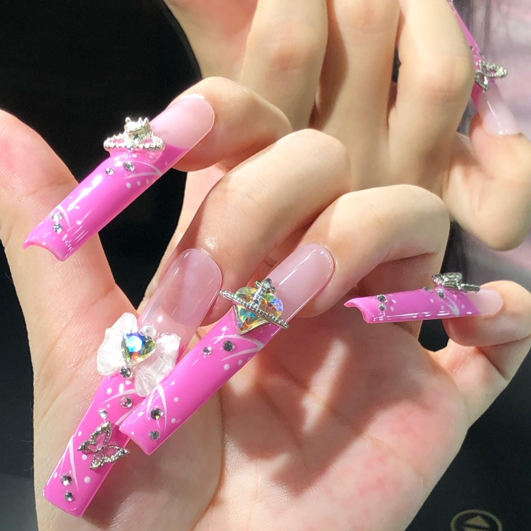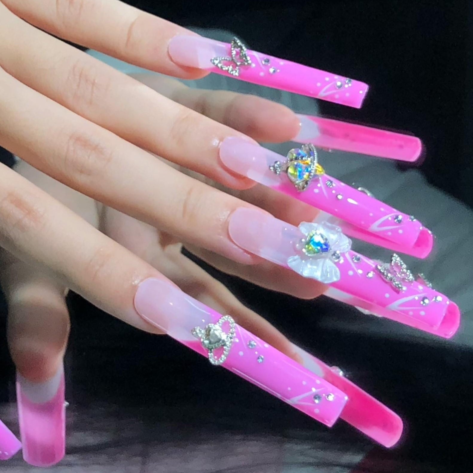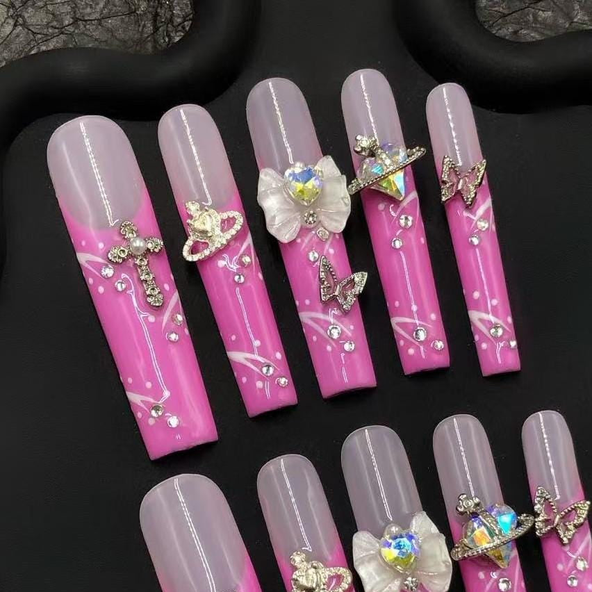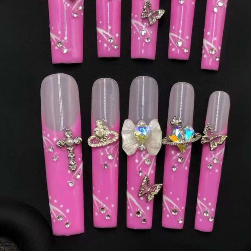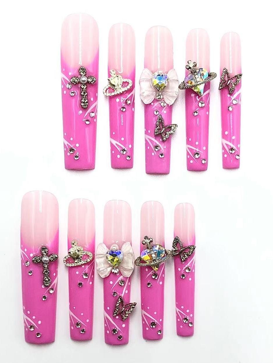 Bring the sparkle with this stunning hot pink ombre press-on nail set! Featuring crystal-studded crosses, butterflies, planets, and bows, each nail is a dazzling work of art. With rhinestones, cosmic elements, and dreamy accents, these long nails are perfect for Y2K glam, parties, or anyone craving bold, eye-catching beauty.