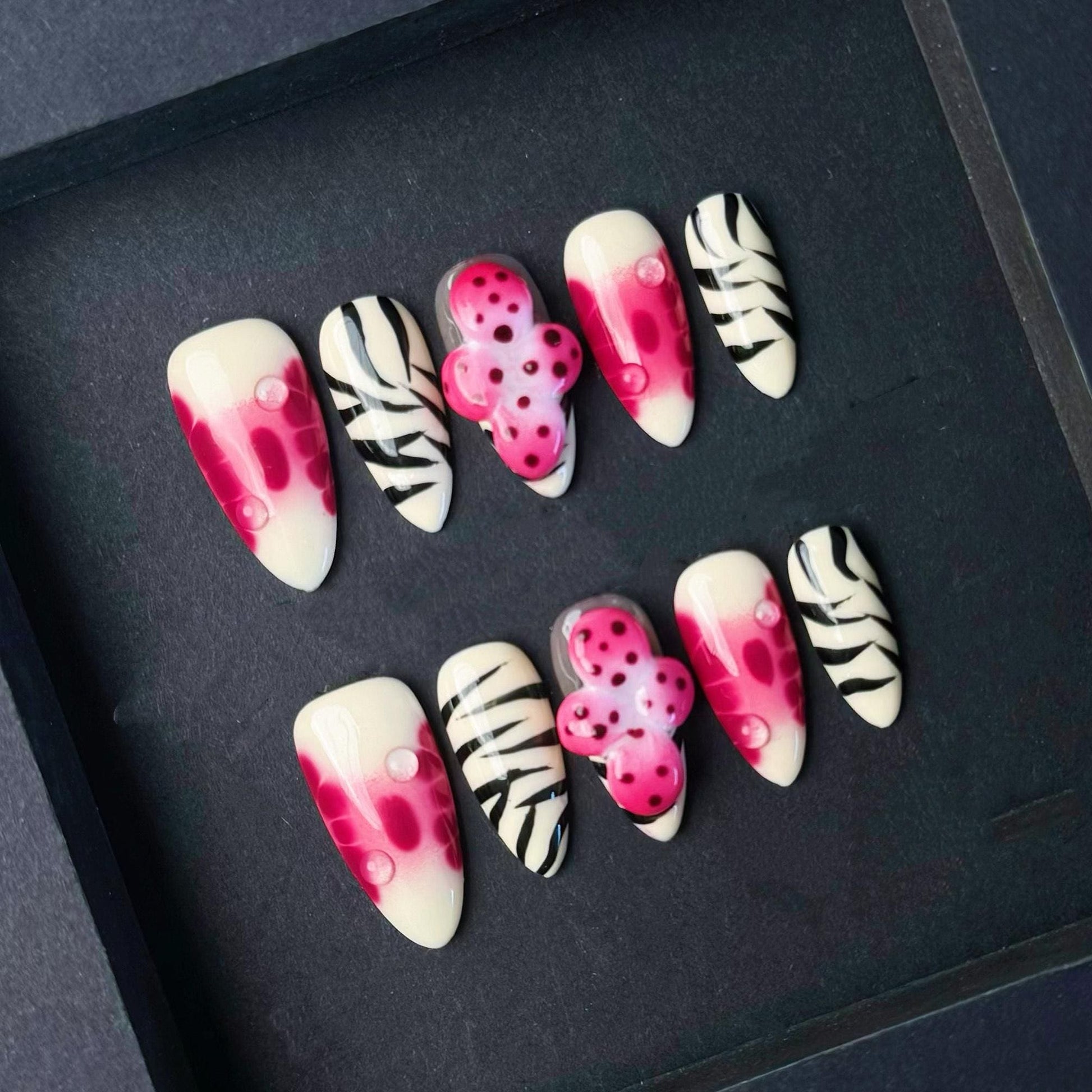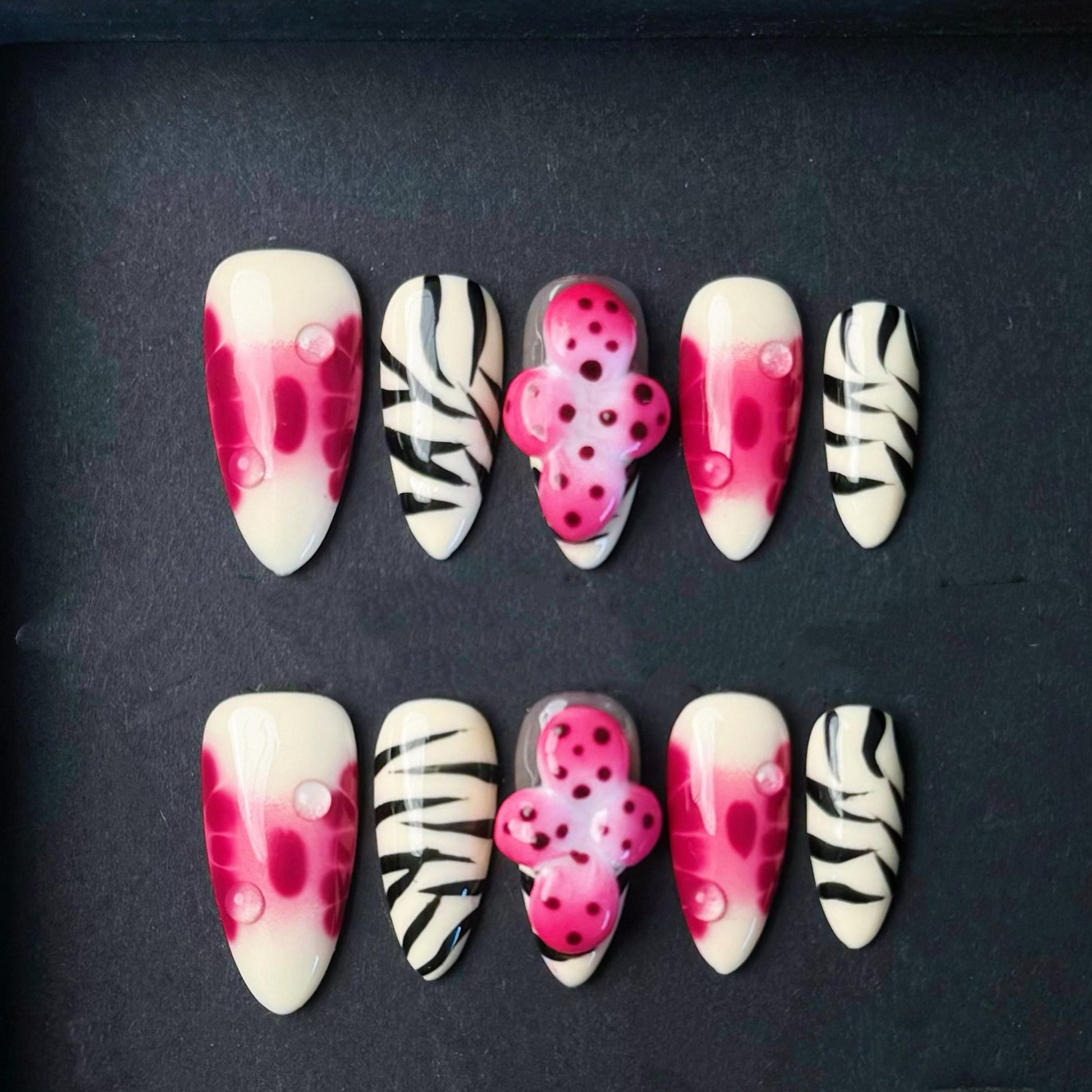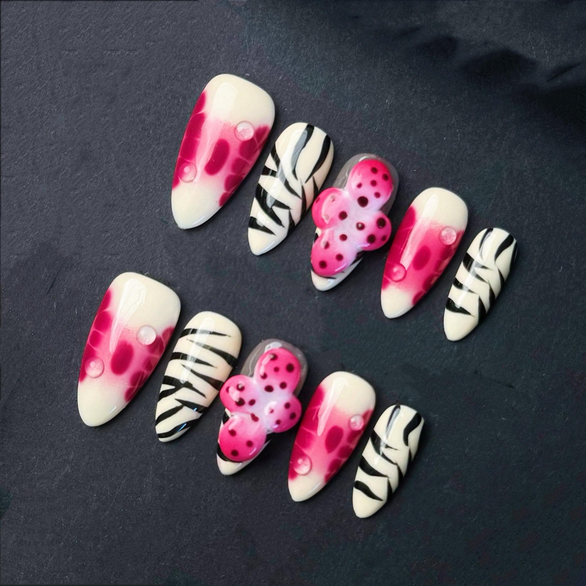 This fierce and funky press on nail set is a playful fusion of tropical flair and safari edge. Featuring alternating designs of black-and-white zebra stripes and hot pink to cream ombré gradients, the set is elevated by glossy bubble-like droplets and bold 3D flamingo charms. The vibrant flamingos are sculpted in high-gloss pink with polka-dot accents, adding a dramatic, textural contrast. Perfect for summer, vacation, or standout street-style looks, this handmade set delivers wild fun with an exotic twist in a chic almond shape.