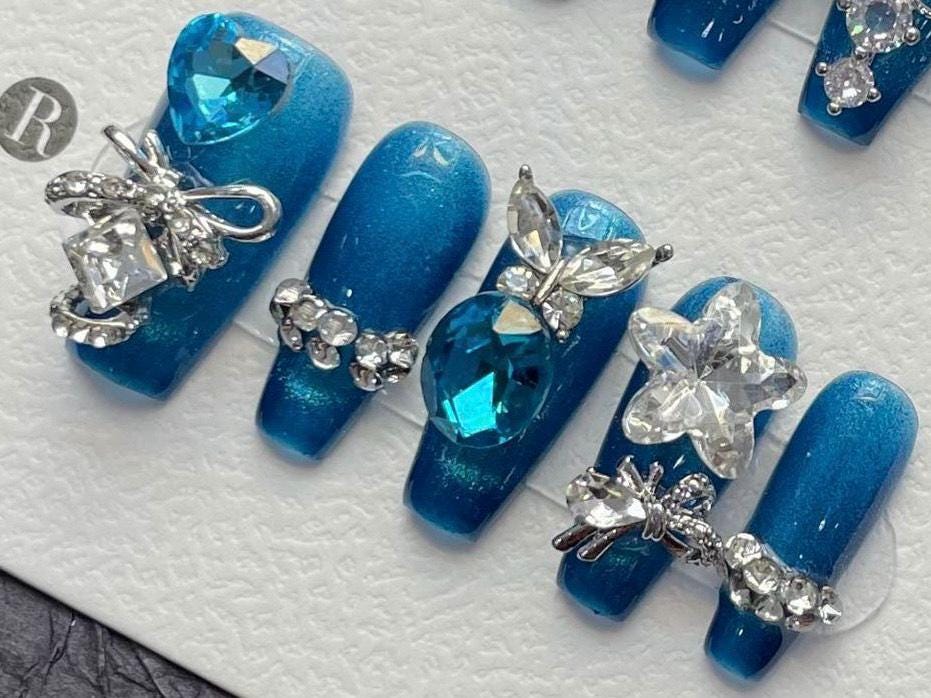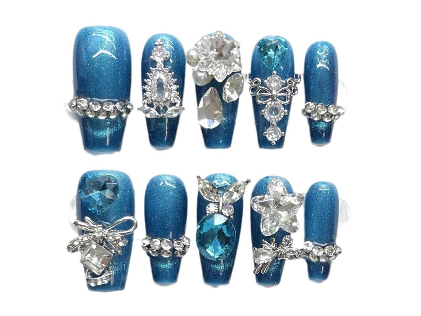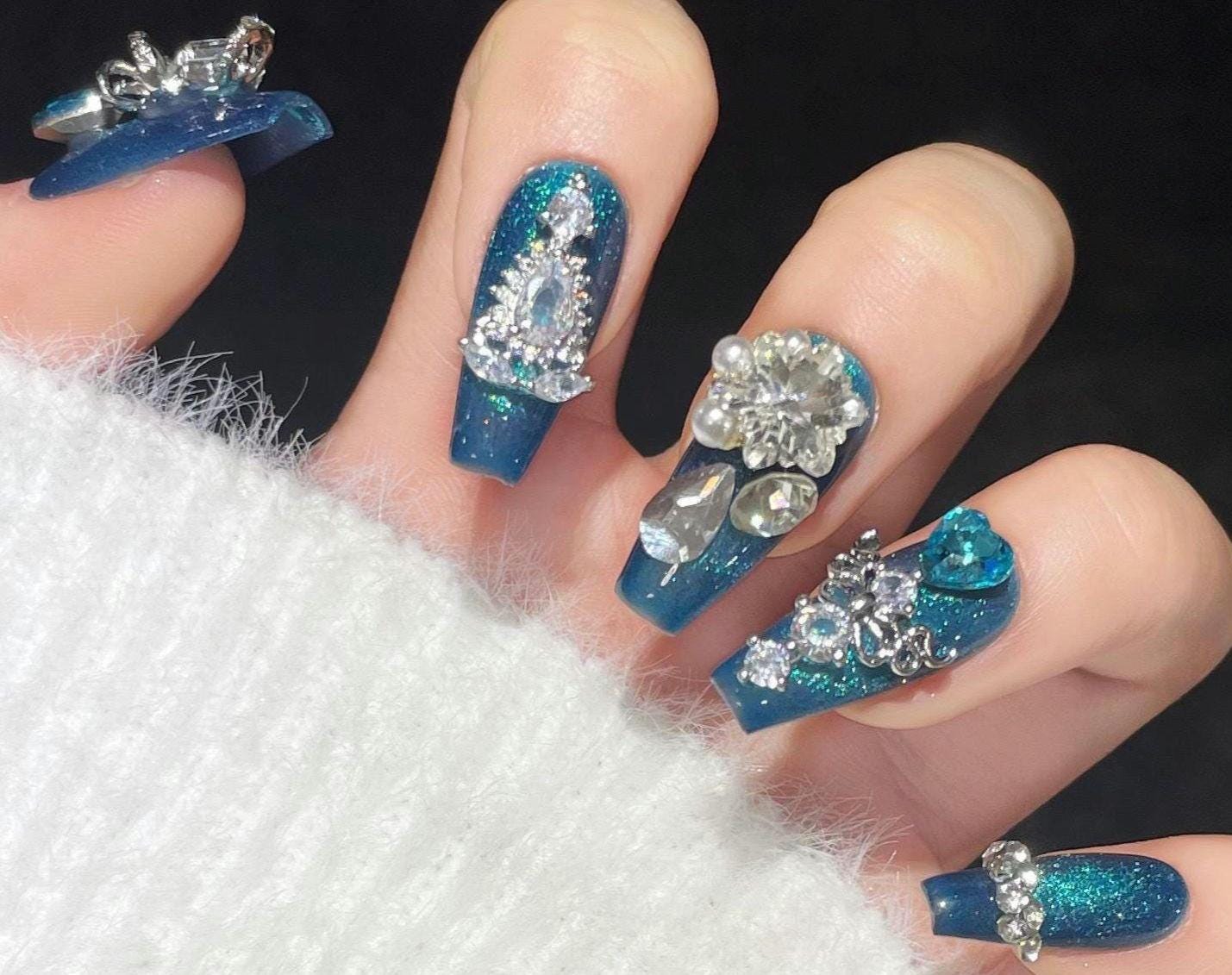 Ice Queen Press On Nails with 3D Crystals and Diamond Charms in Glitter Blue and Silver Rhinestone Luxury Long Handmade Nail Art Set