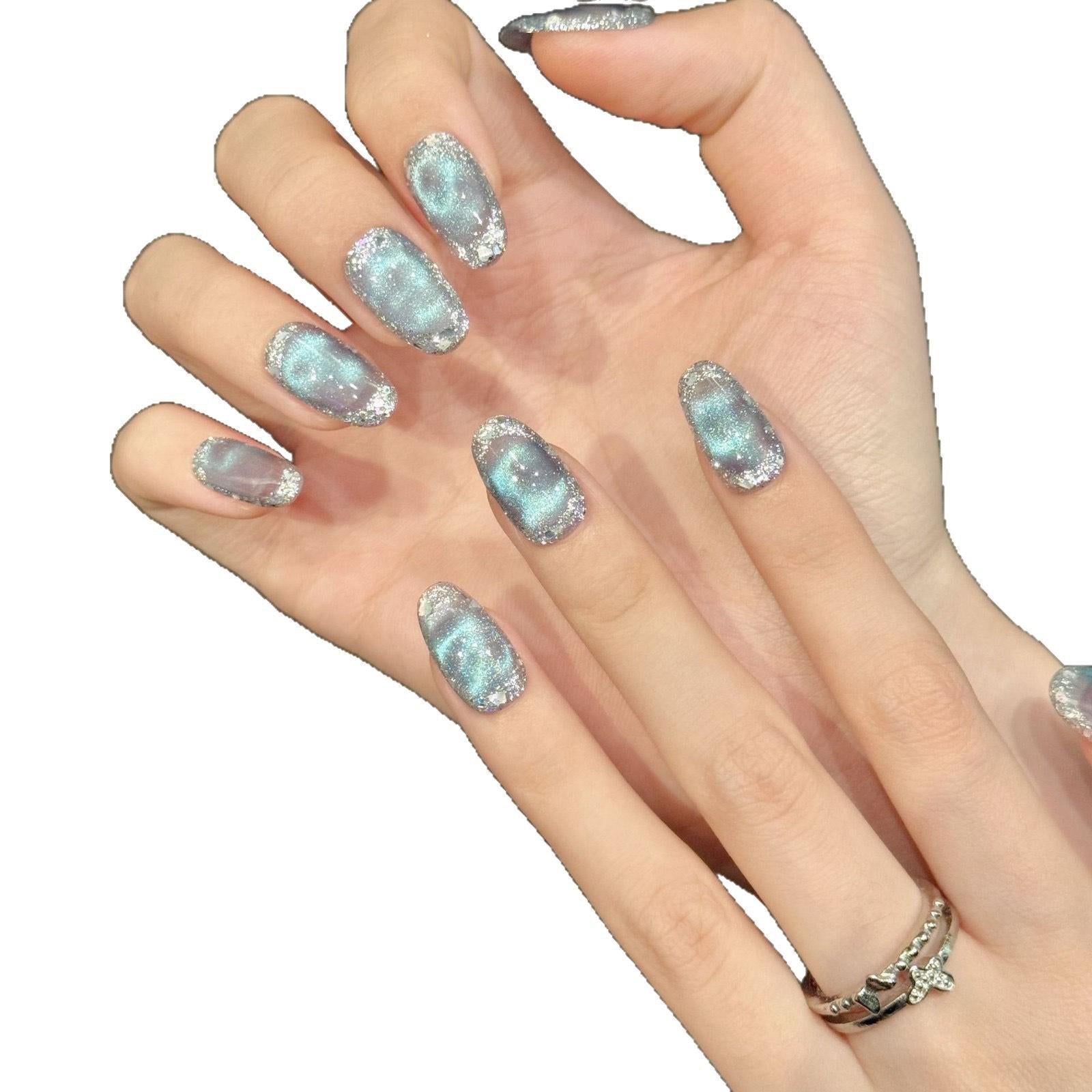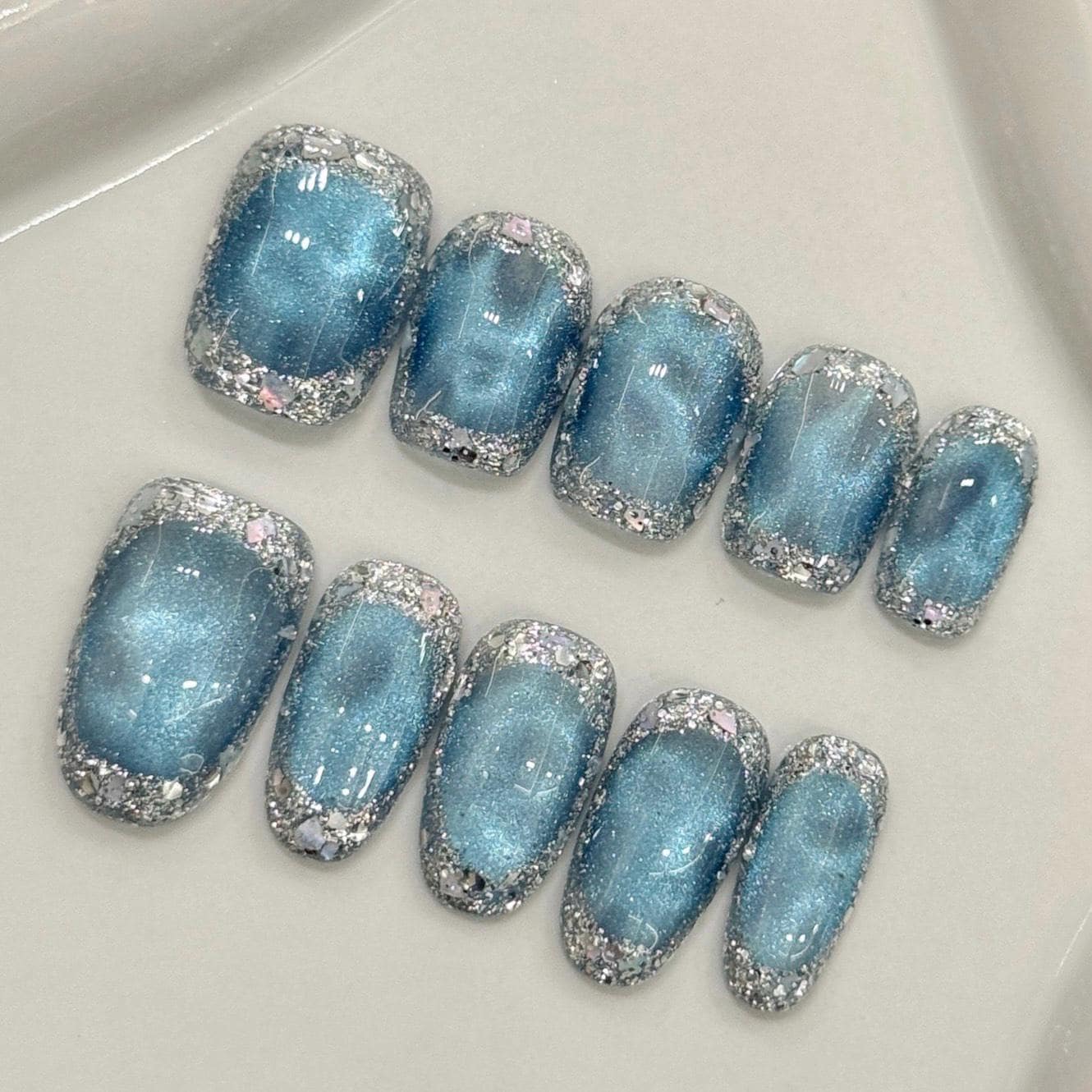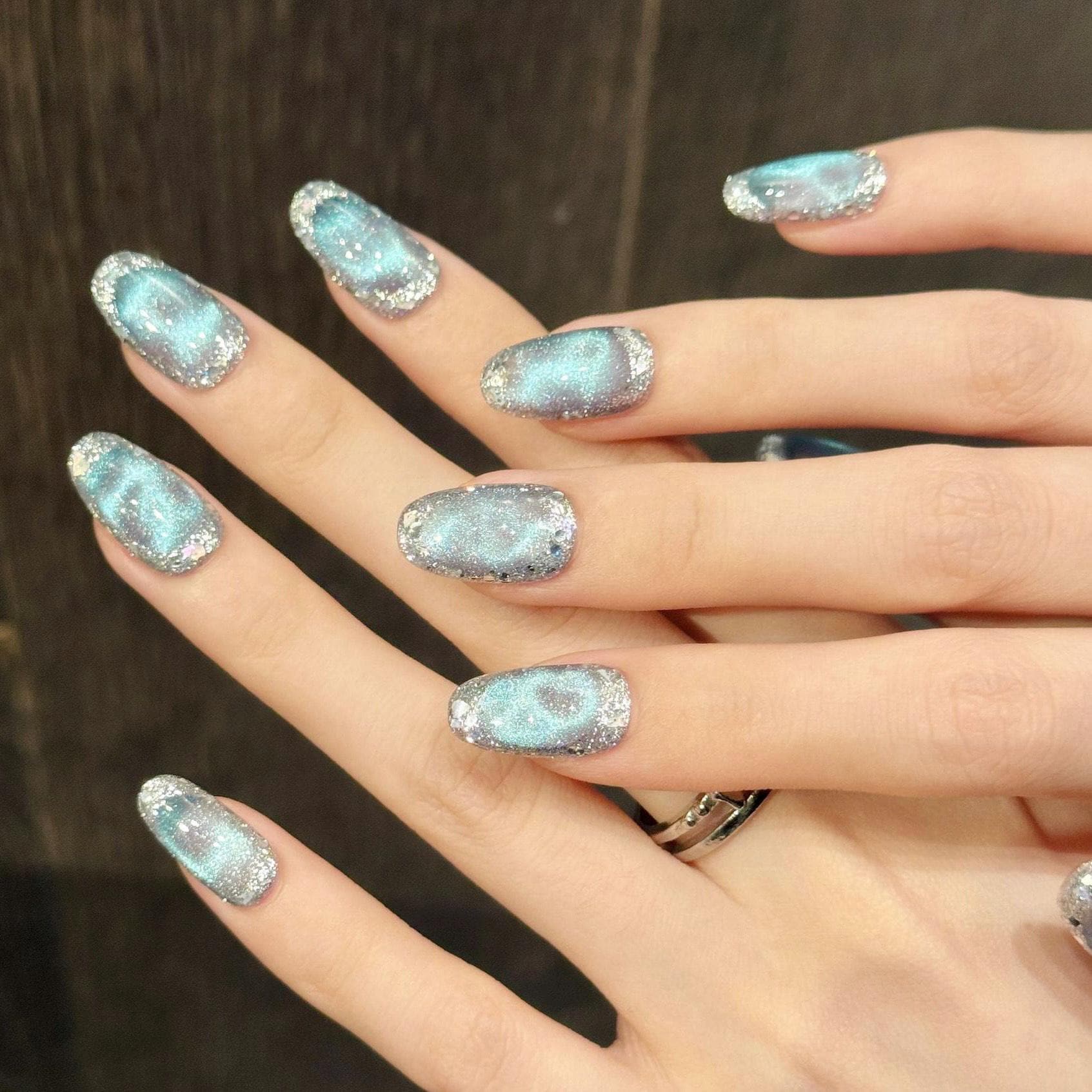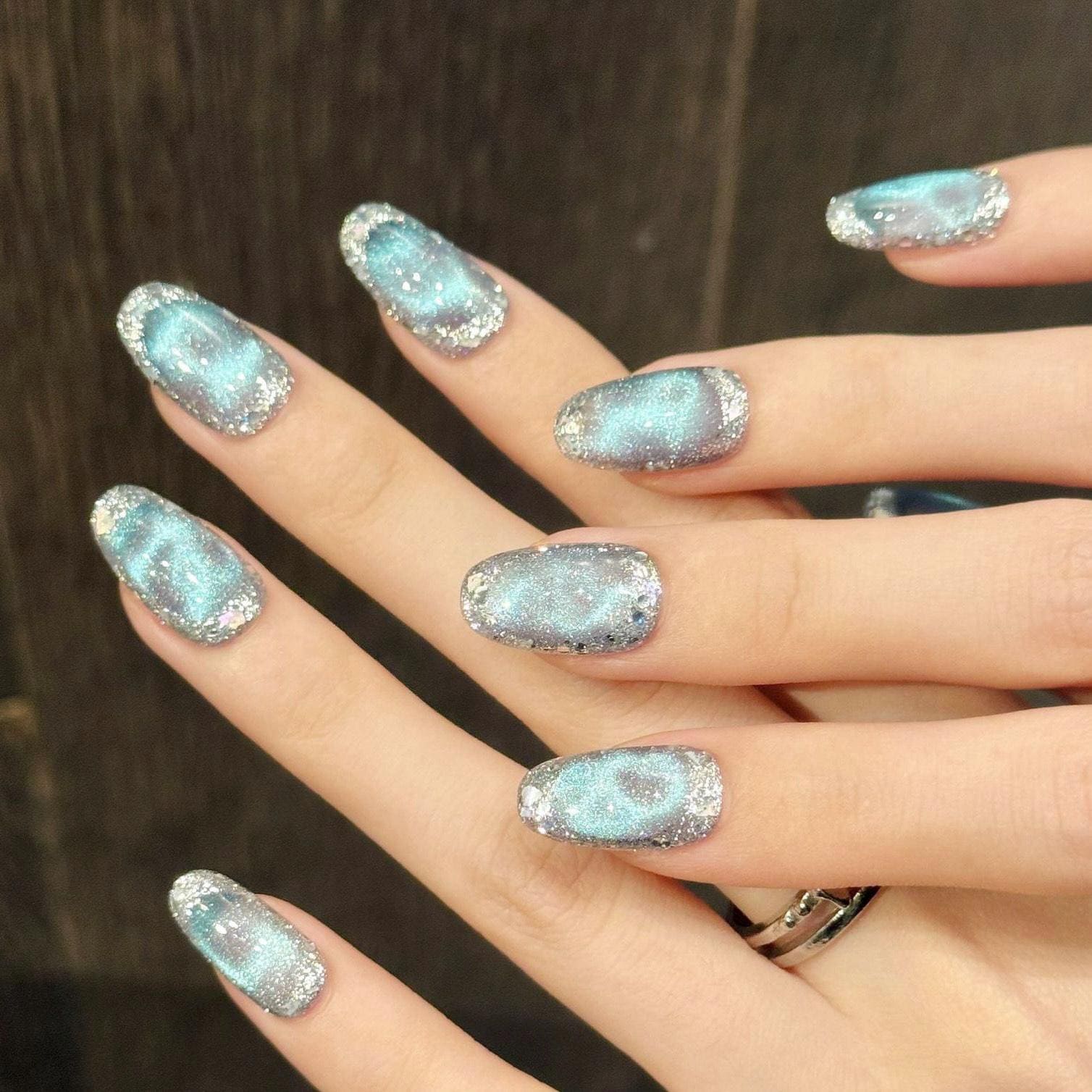 Icy Blue Cat Eye Press On Nails with Chunky Silver Glitter Border Square Shape. Artificial reusable glue on faux manicure nails trendy art.