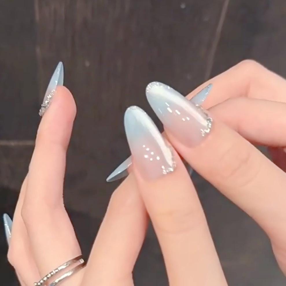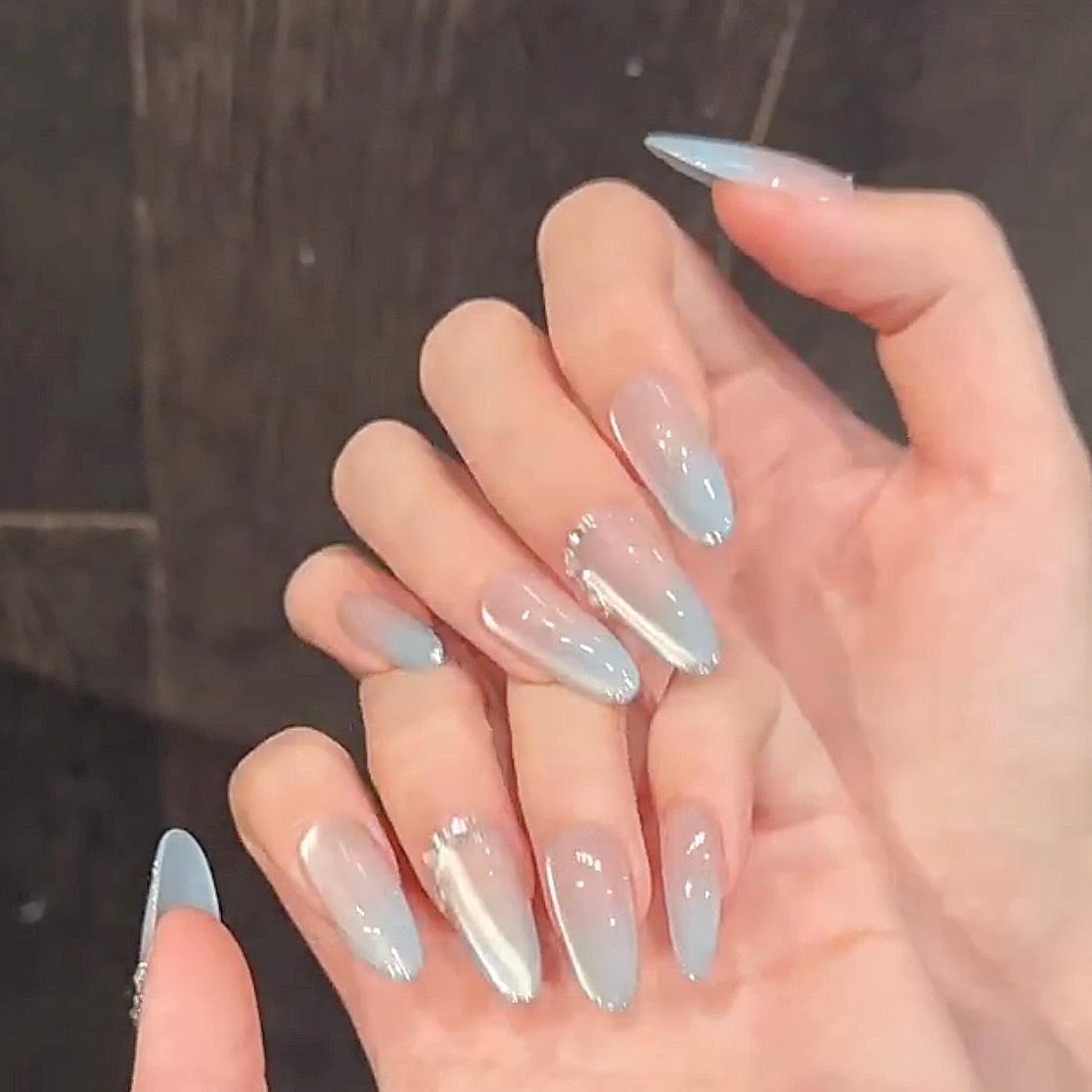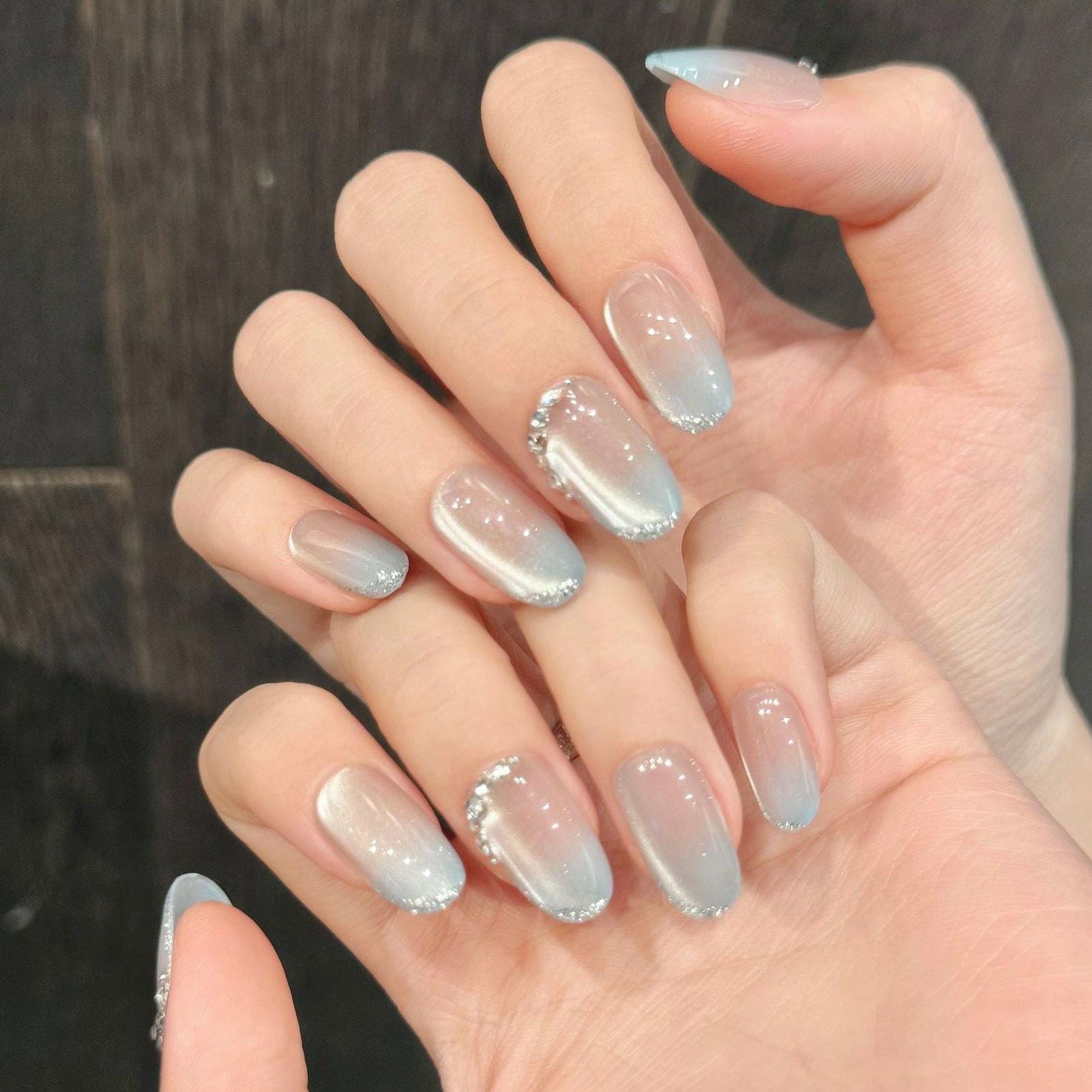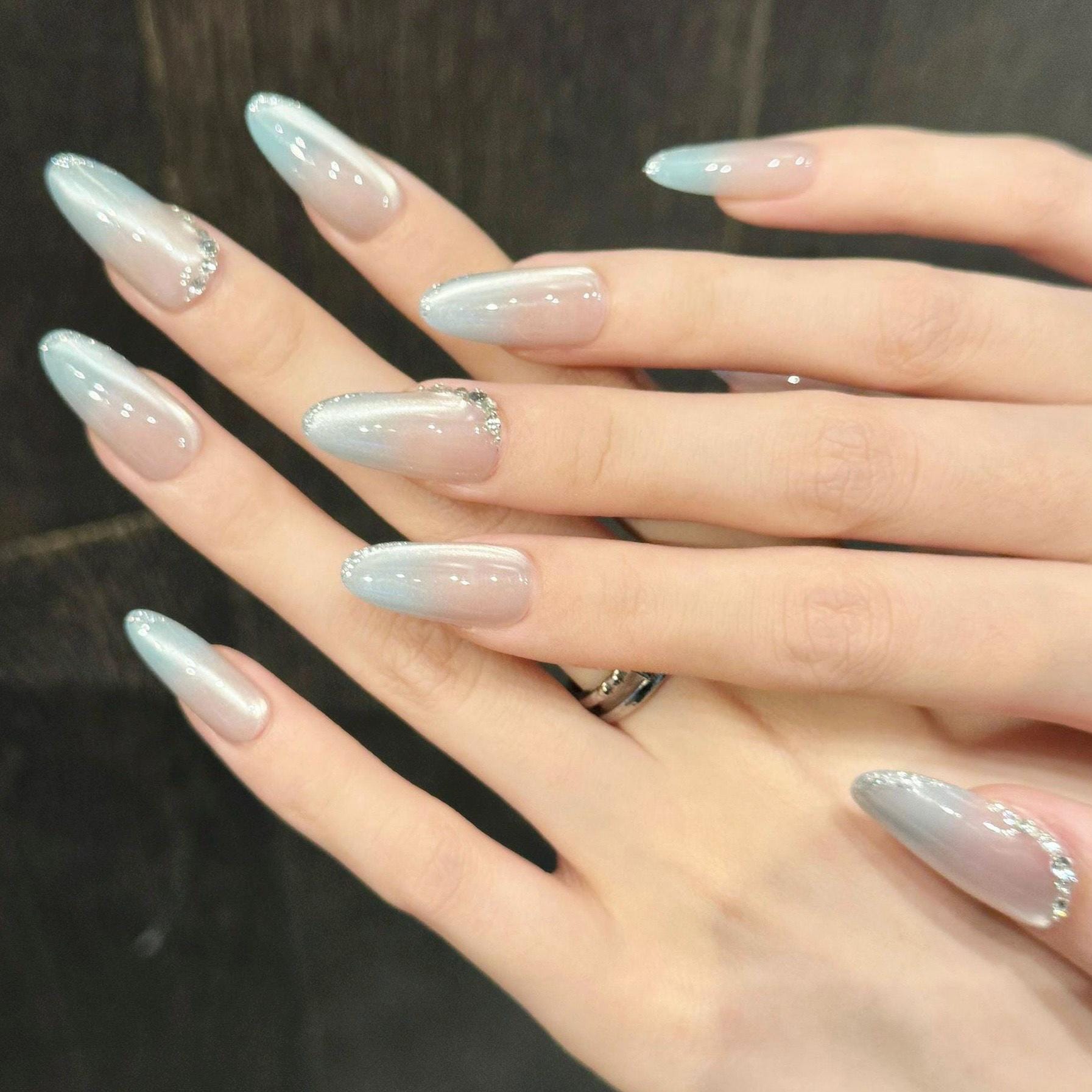 This sophisticated set of press on nails features an ethereal icy blue cat-eye effect that shifts with the light, paired with a smooth ombré fade into a soft nude-pink base. Delicate silver gradients highlight the tips for a frosted finish, while clear rhinestones along the cuticles add a subtle sparkle and luxurious dimension. Perfect for winter occasions, formal events, or everyday elegance, these almond-shaped nails offer a graceful, modern look. Handcrafted with precision, they combine shimmer, softness, and charm into a wearable work of art.