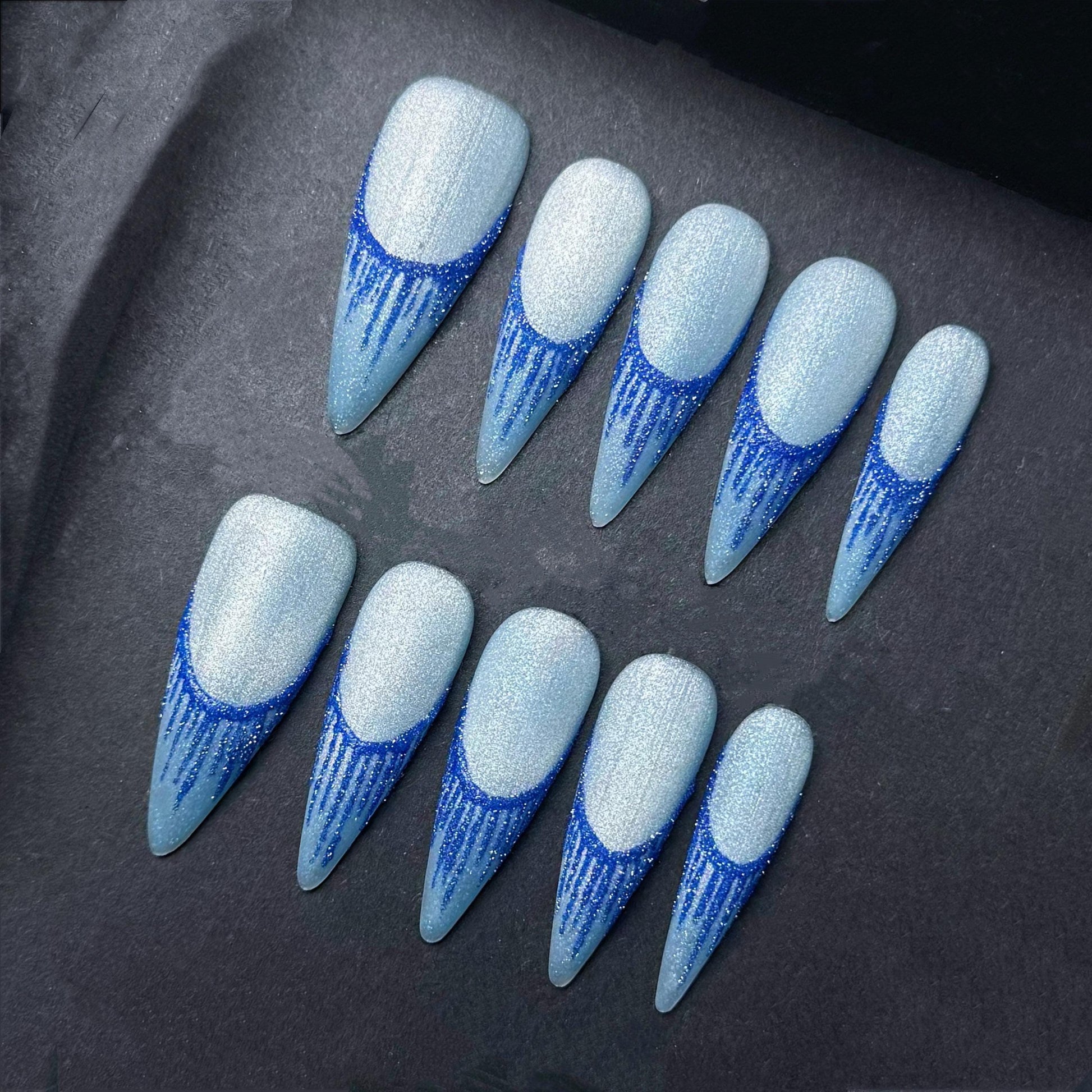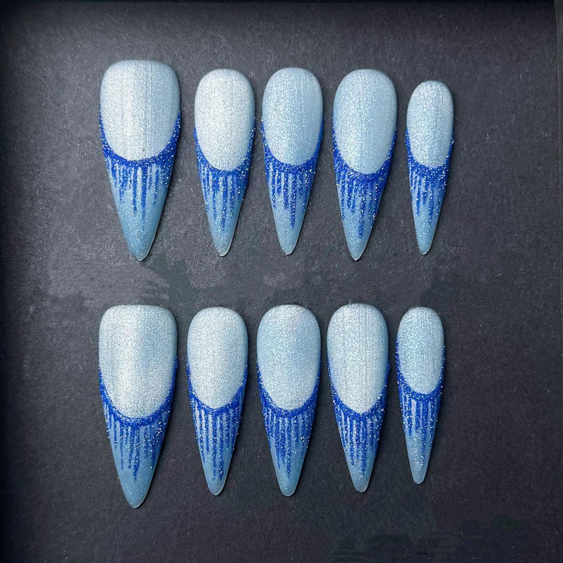 Icy Blue Glitter French Drip Press-On Nails – Stiletto Sparkle Set. Artificial reusable fake glue on faux manicure nails trendy art.