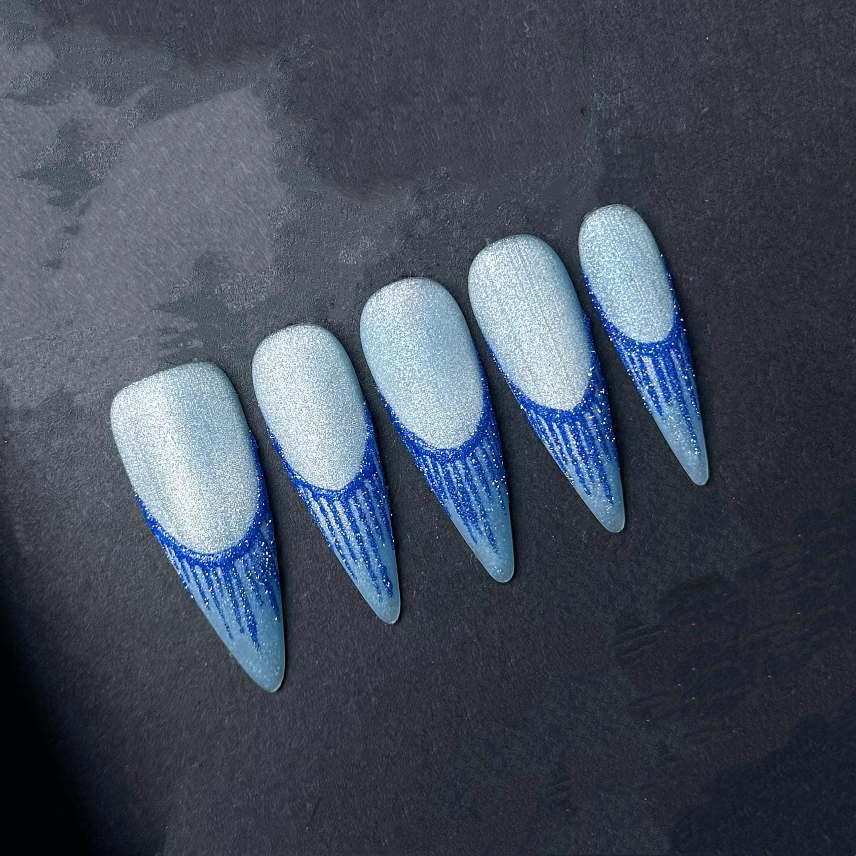 This stunning set of press-on nails features a sleek icy blue base with an eye-catching French tip design that "drips" in shimmering sapphire glitter. The bold stiletto shape adds elegance and drama, perfect for winter glam, parties, or anyone wanting a fierce frosted look. The glitter drip design creates the illusion of melting icicles or frozen waterfalls, catching light from every angle. Whether you're styling for a cold-weather event or want a bold everyday nail, this set combines cool sophistication with show-stopping sparkle.