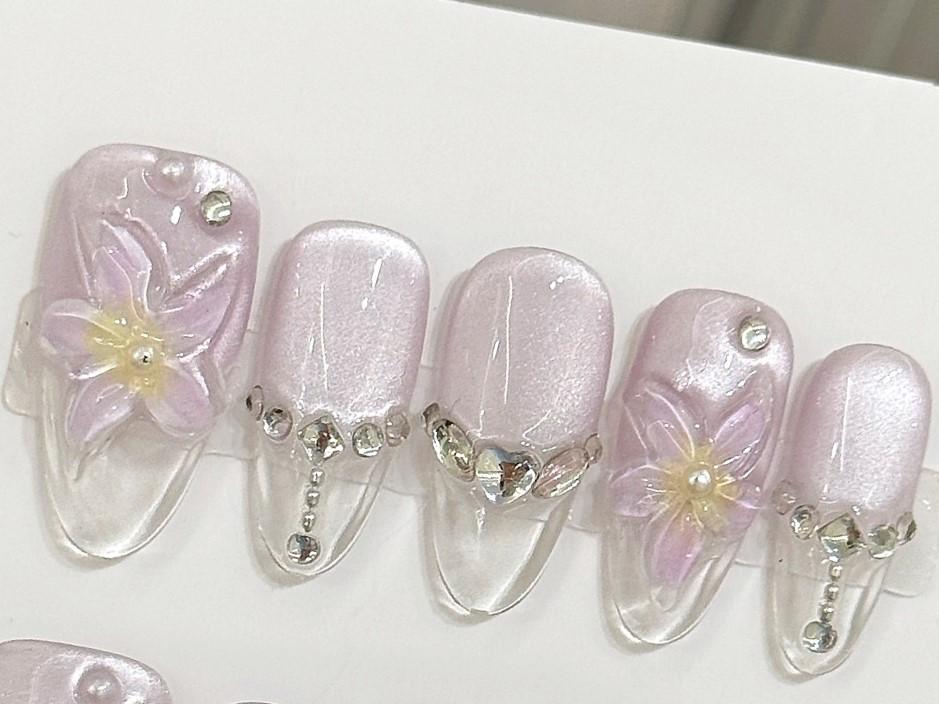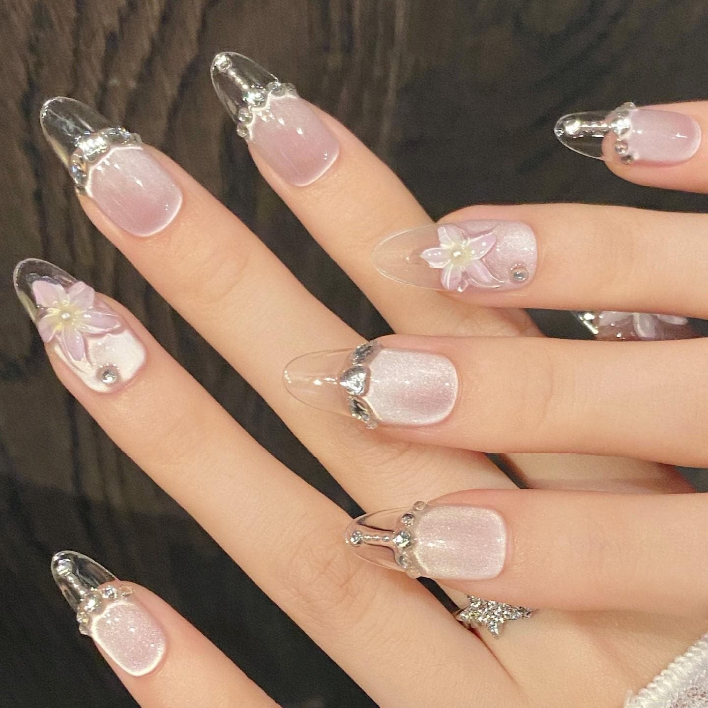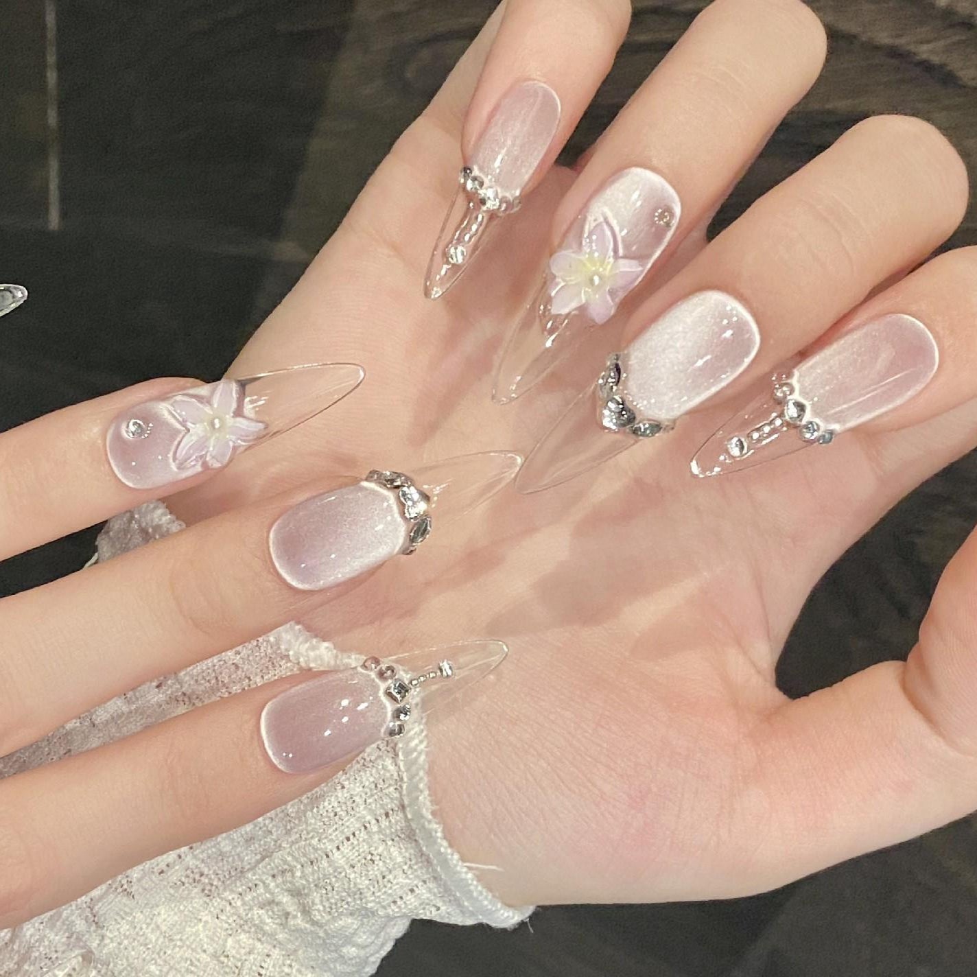 These ethereal press-on nails blend soft shimmering white with clear acrylic, 3D butterflies, flowers, and silver crystal charms. A dreamy design perfect for winter glam, bridal elegance, or fairycore vibes.