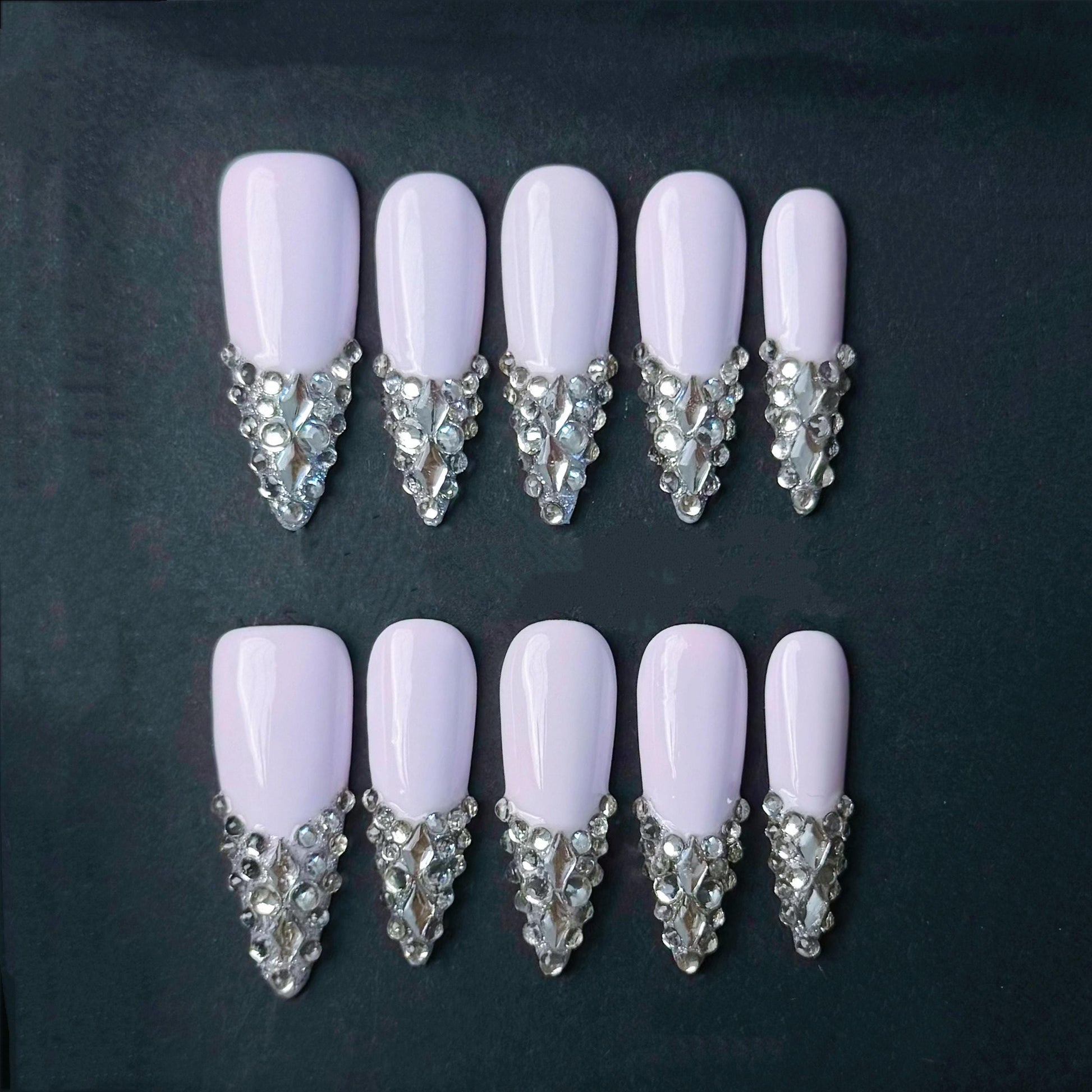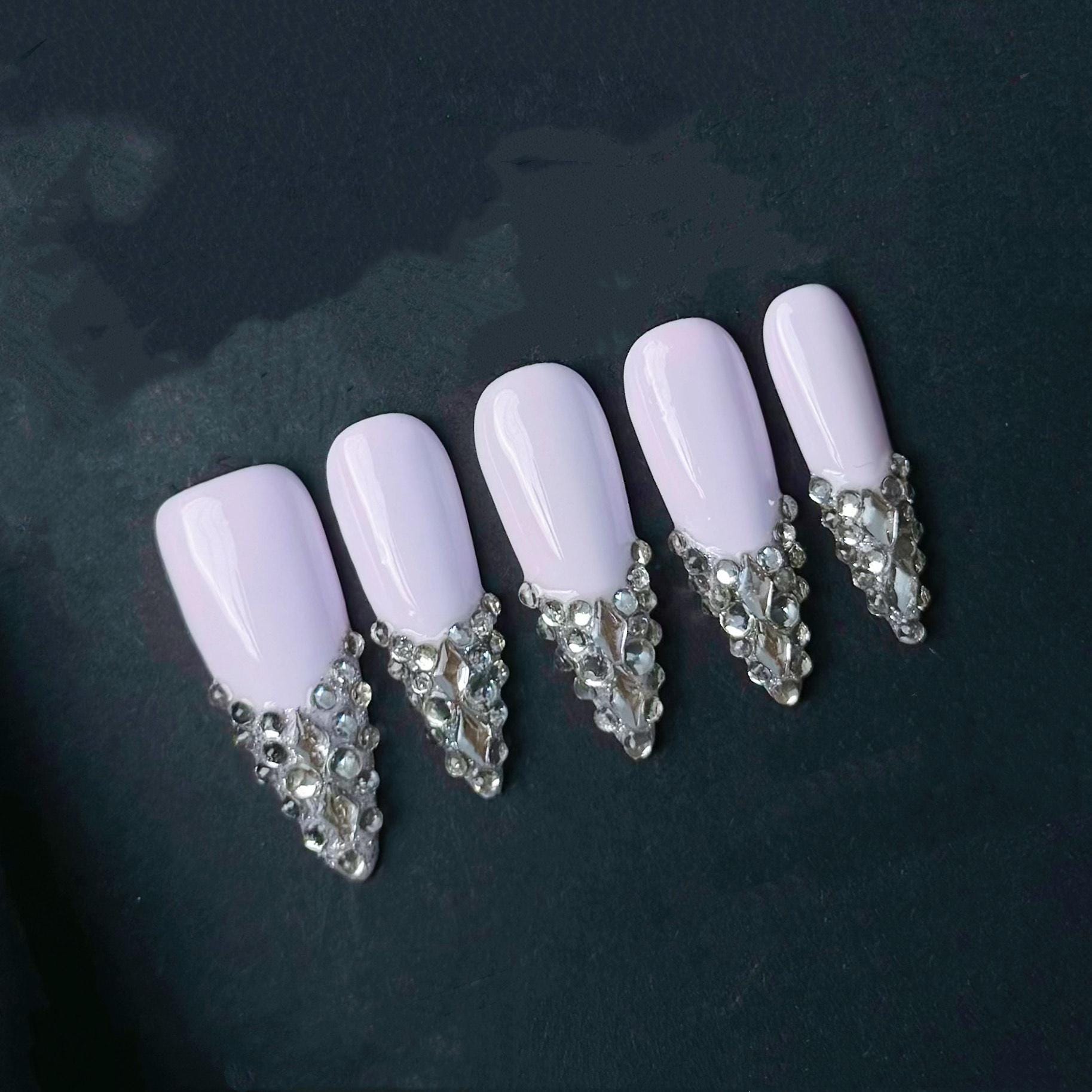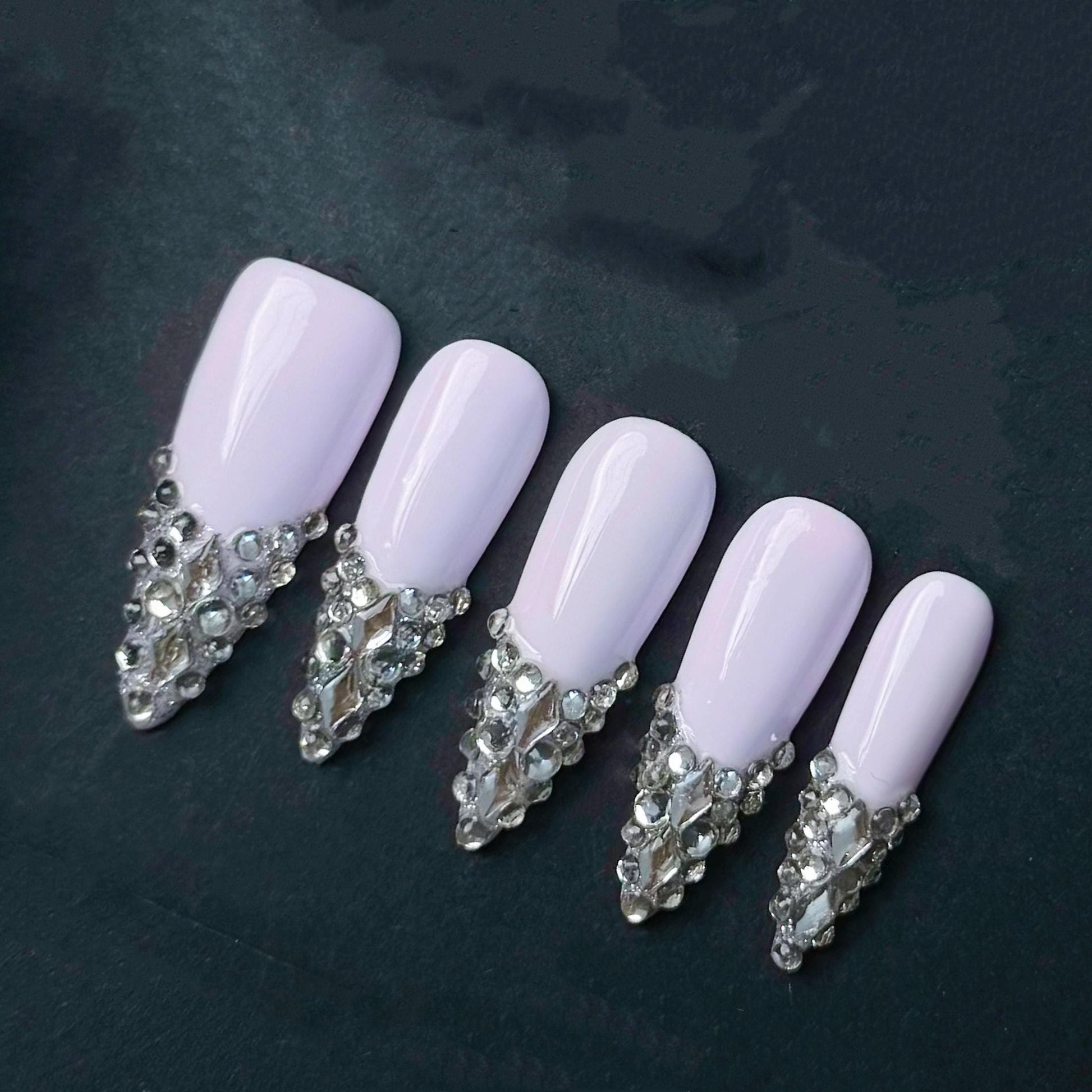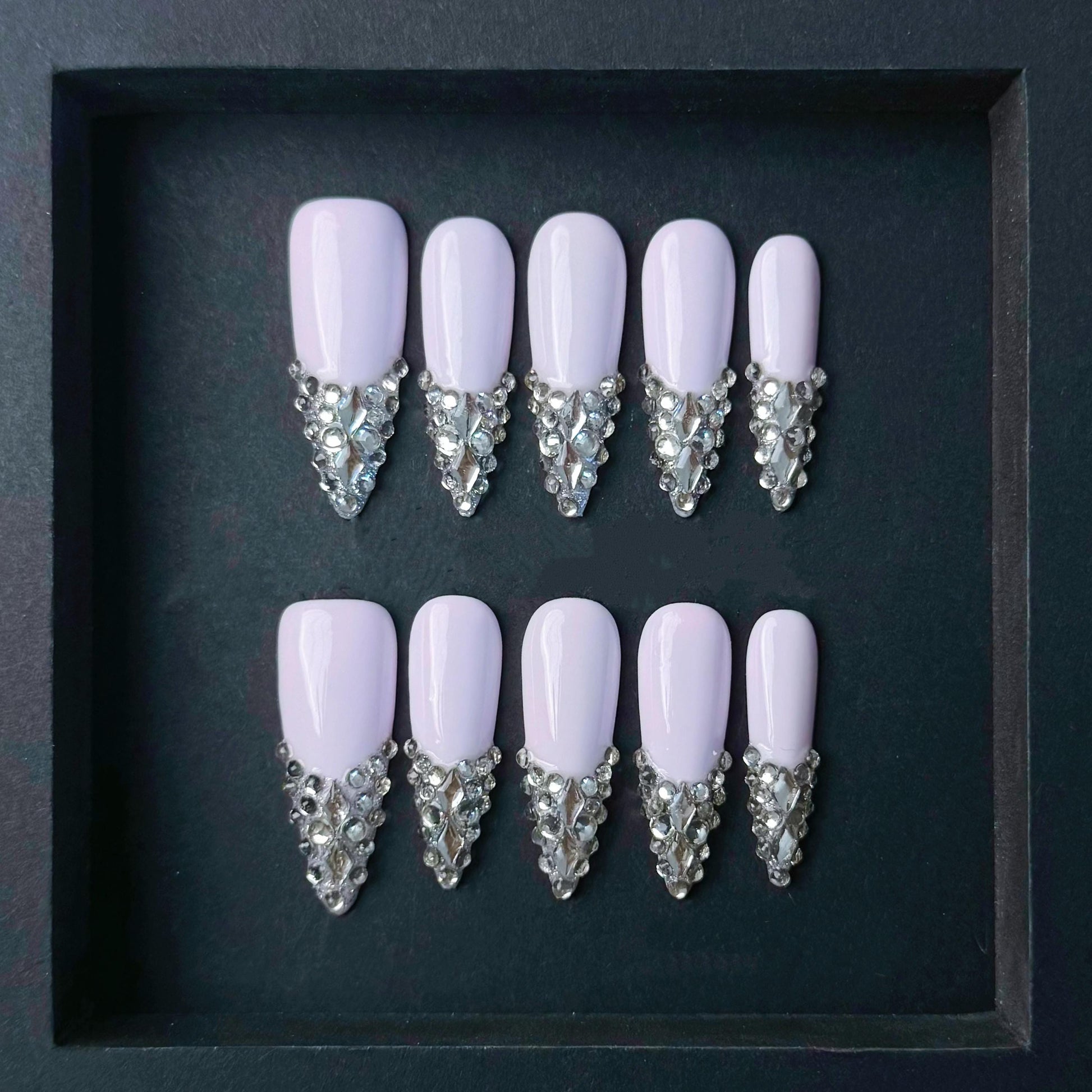 This dazzling set of press-on nails features a glossy pastel lavender base, perfectly complemented by dramatic V-cut tips encrusted with multi-size diamond-like rhinestones. The rhinestone clusters form an intricate, icy design that reflects light from every angle, giving the nails a high-shine, luxurious finish. Ideal for glam events, bridal looks, or anyone who wants to add an extravagant sparkle to their manicure. Each nail is handcrafted for bold brilliance and a statement look that doesn’t go unnoticed.