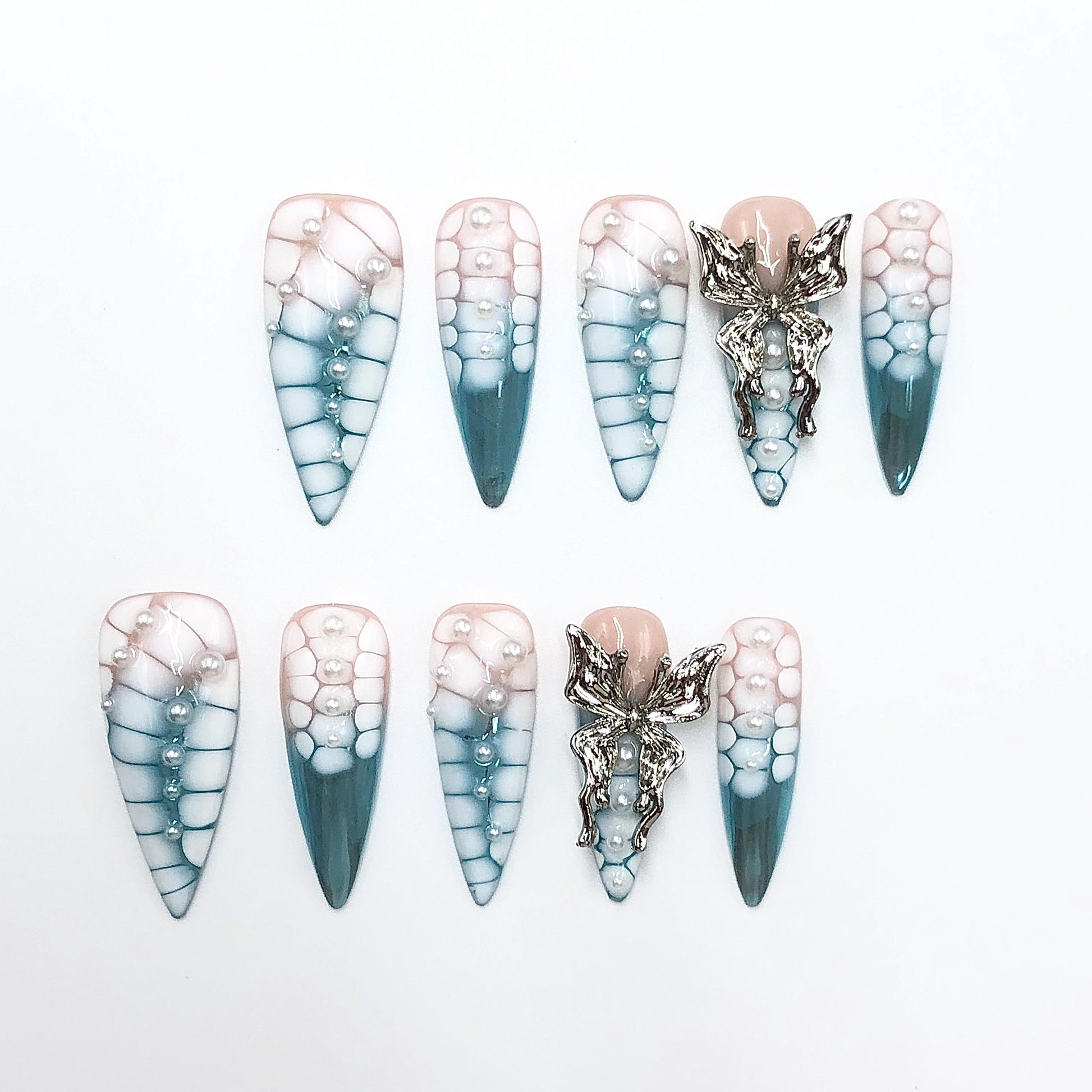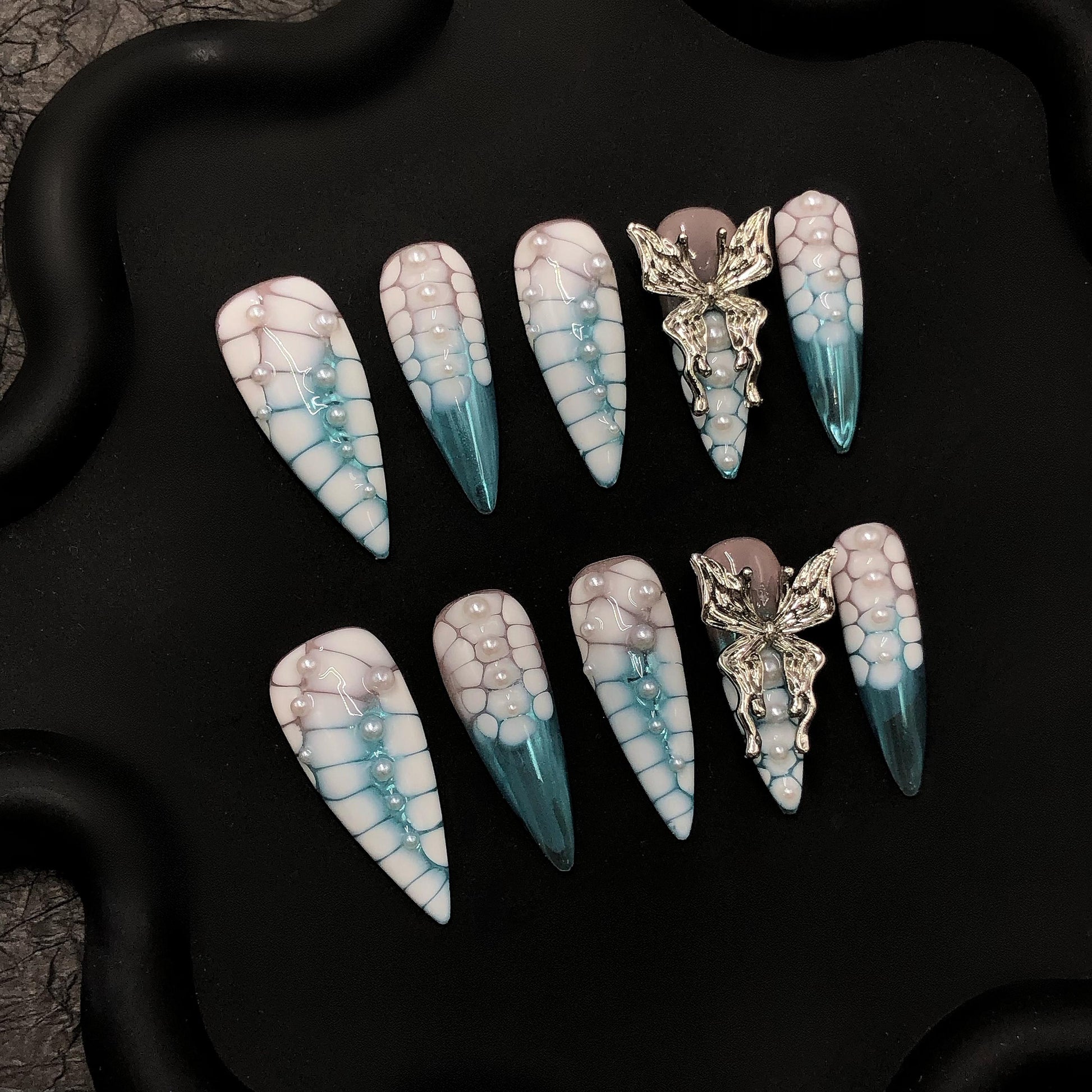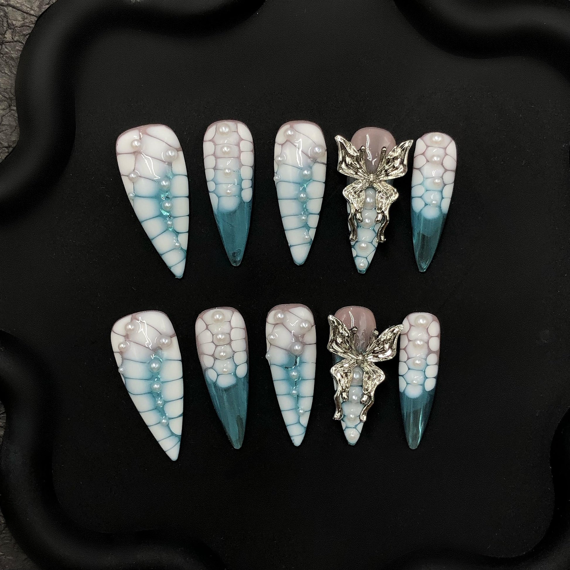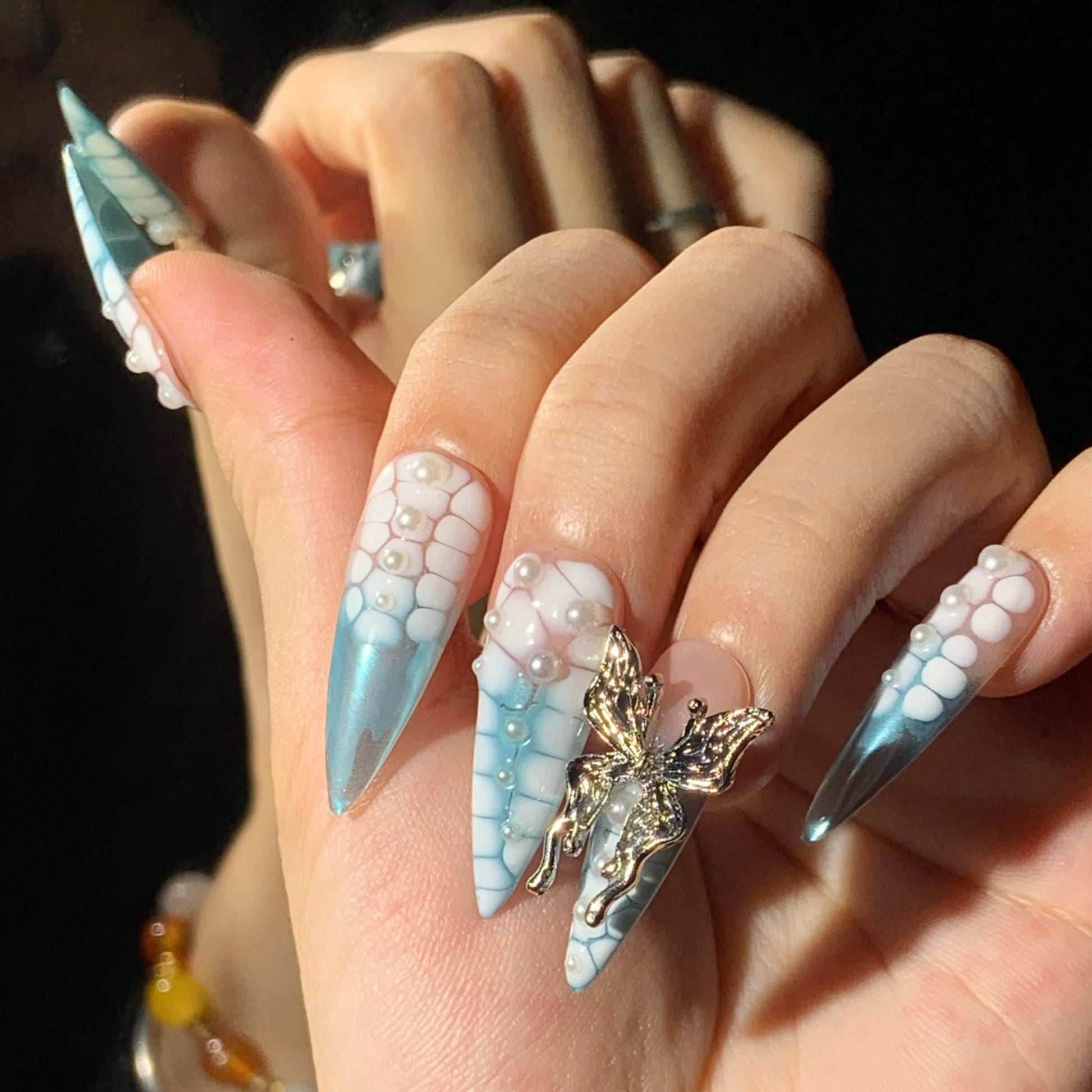 Dive into fantasy with this magical press-on nail set featuring shimmering blue chrome tips, iridescent pearls, and dragon-scale-inspired textures. The standout silver fairy charm adds a whimsical, ethereal touch to this mermaid-meets-mystic look. Perfect for cosplay, fairytale lovers, or enchanted winter vibes.