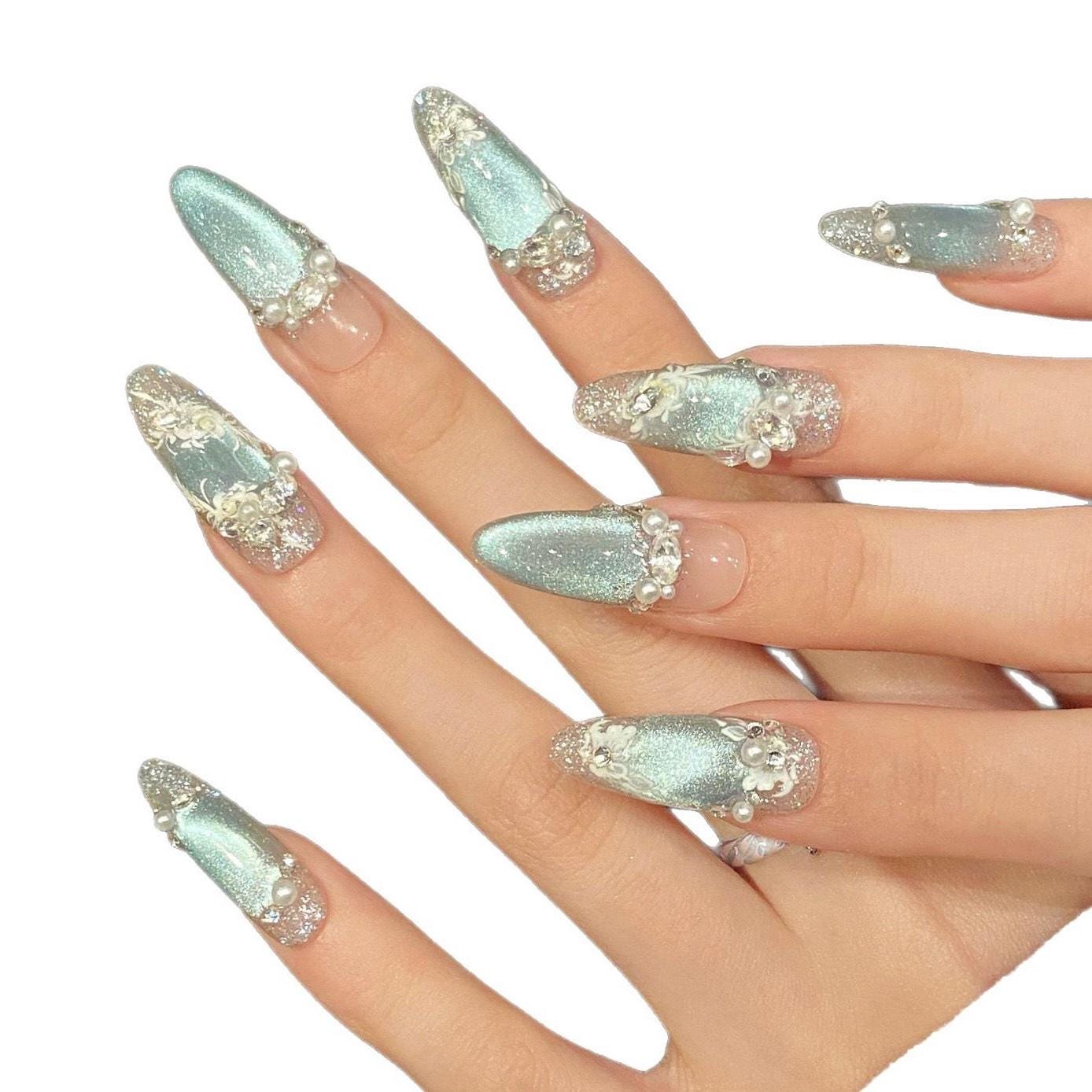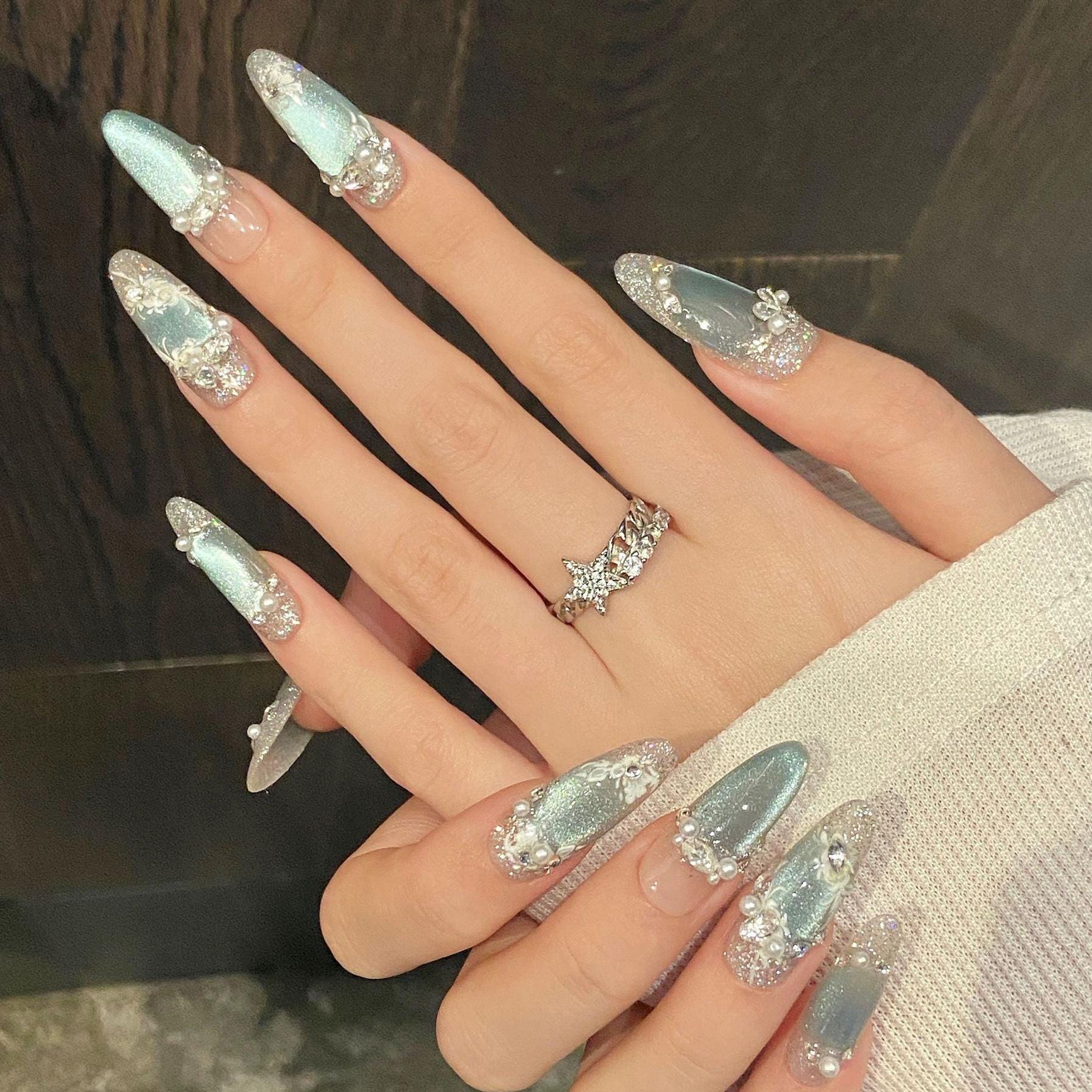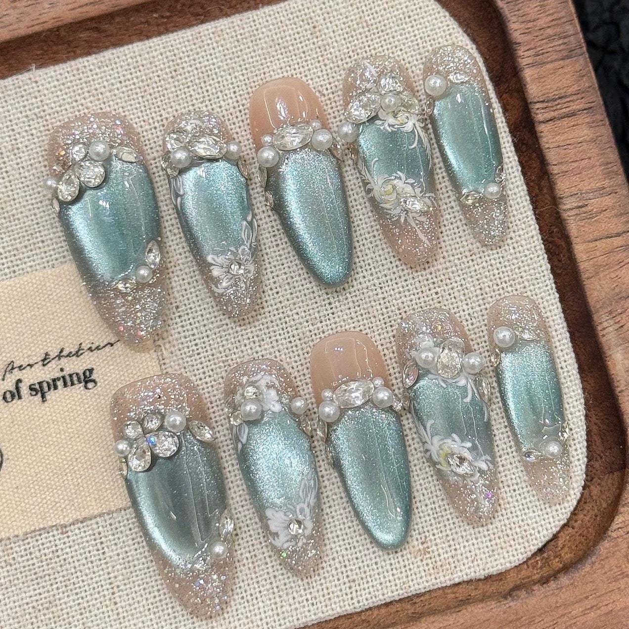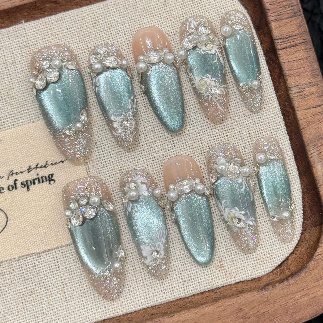 Elevate your manicure with these luxurious mint green press-on nails, featuring a shimmering chrome finish, clear glitter tips, and delicate white floral accents. Embellished with 3D pearls and rhinestones, this elegant set is perfect for weddings, parties, or glam everyday looks. It has a beautiful name -sky mirror.