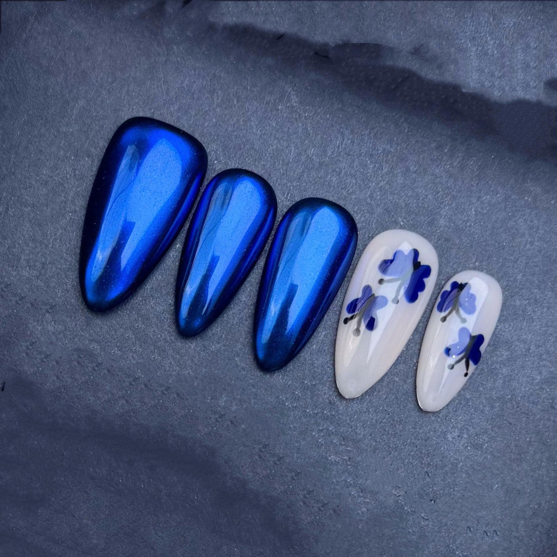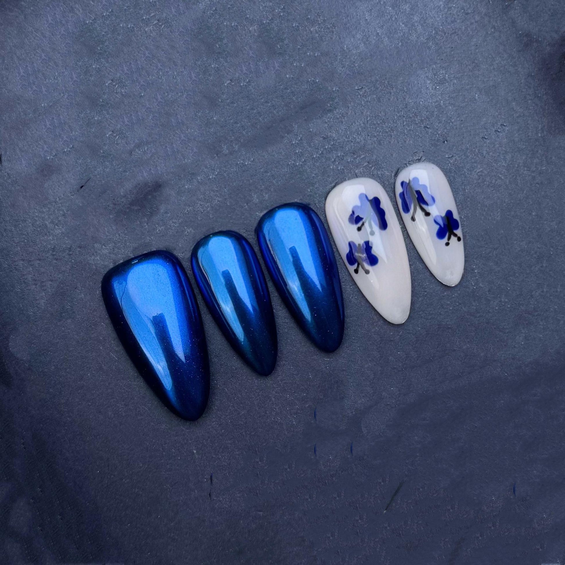 This stunning set of press-on nails features a striking contrast between high-gloss sapphire blue chrome and soft ivory with hand-painted floral accents. The blue nails boast a metallic mirror finish that radiates bold sophistication, while the white nails are delicately adorned with blue and violet blossom motifs, evoking a fresh, botanical charm. Perfect for those who love combining fierce glam with gentle elegance, this set is ideal for special occasions, spring and summer events, or everyday wear with flair.