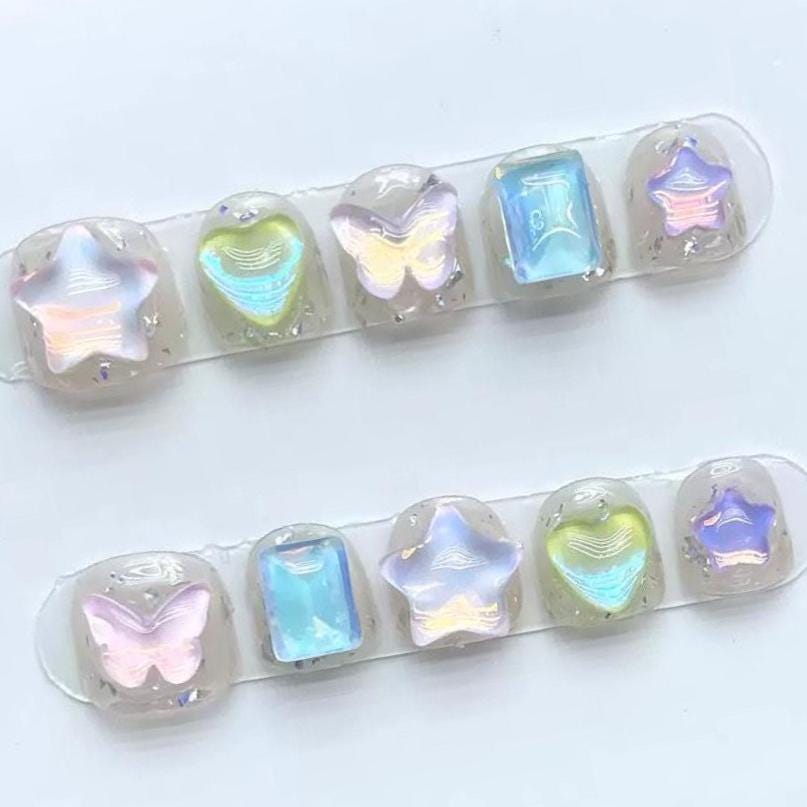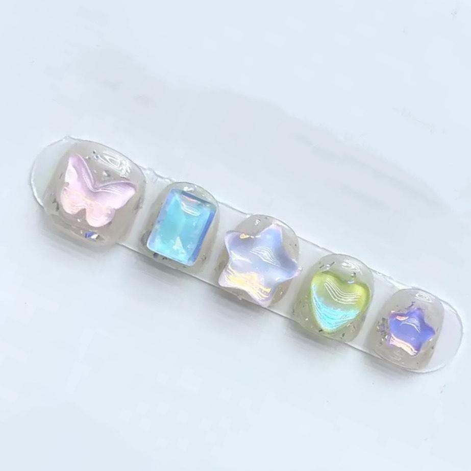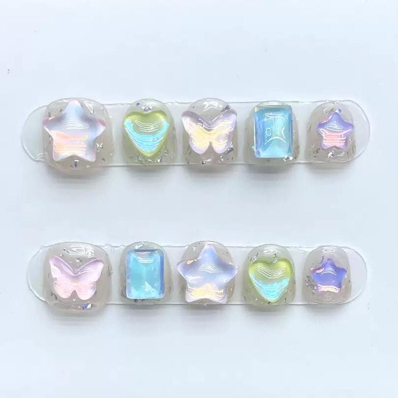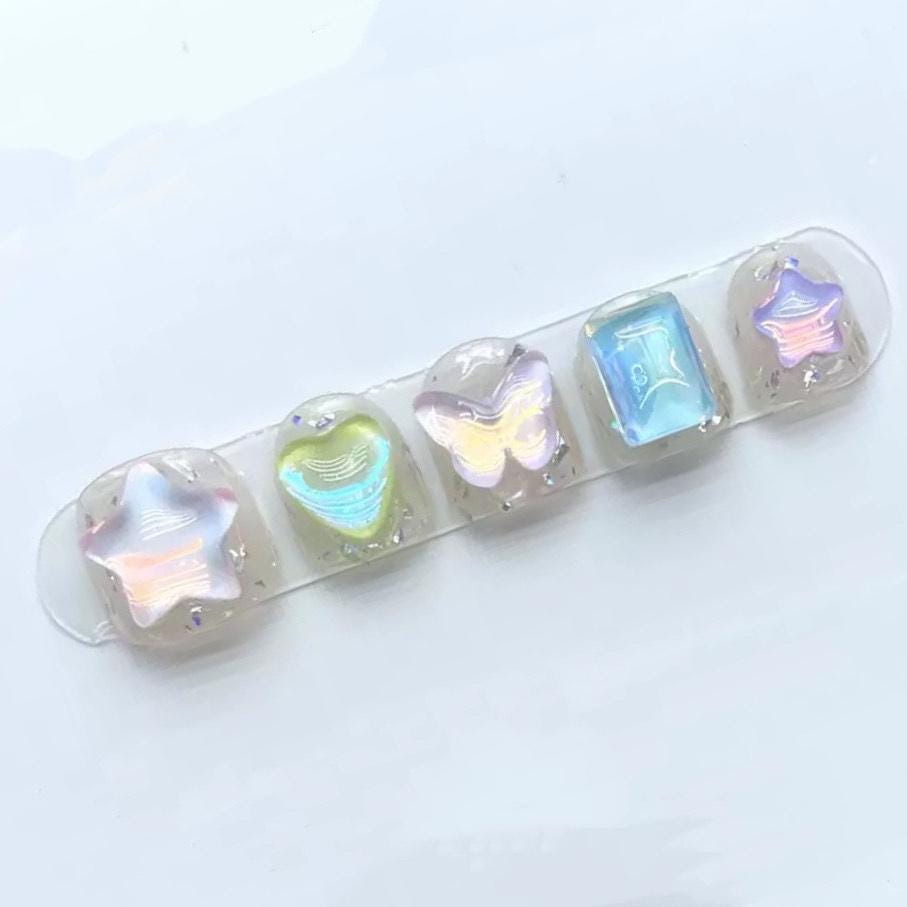 Iridescent Star Butterfly Heart Kids Press On Nails–Rainbow Candy Jelly Set. Artificial reusable fake glue on faux manicure nail trendy art.