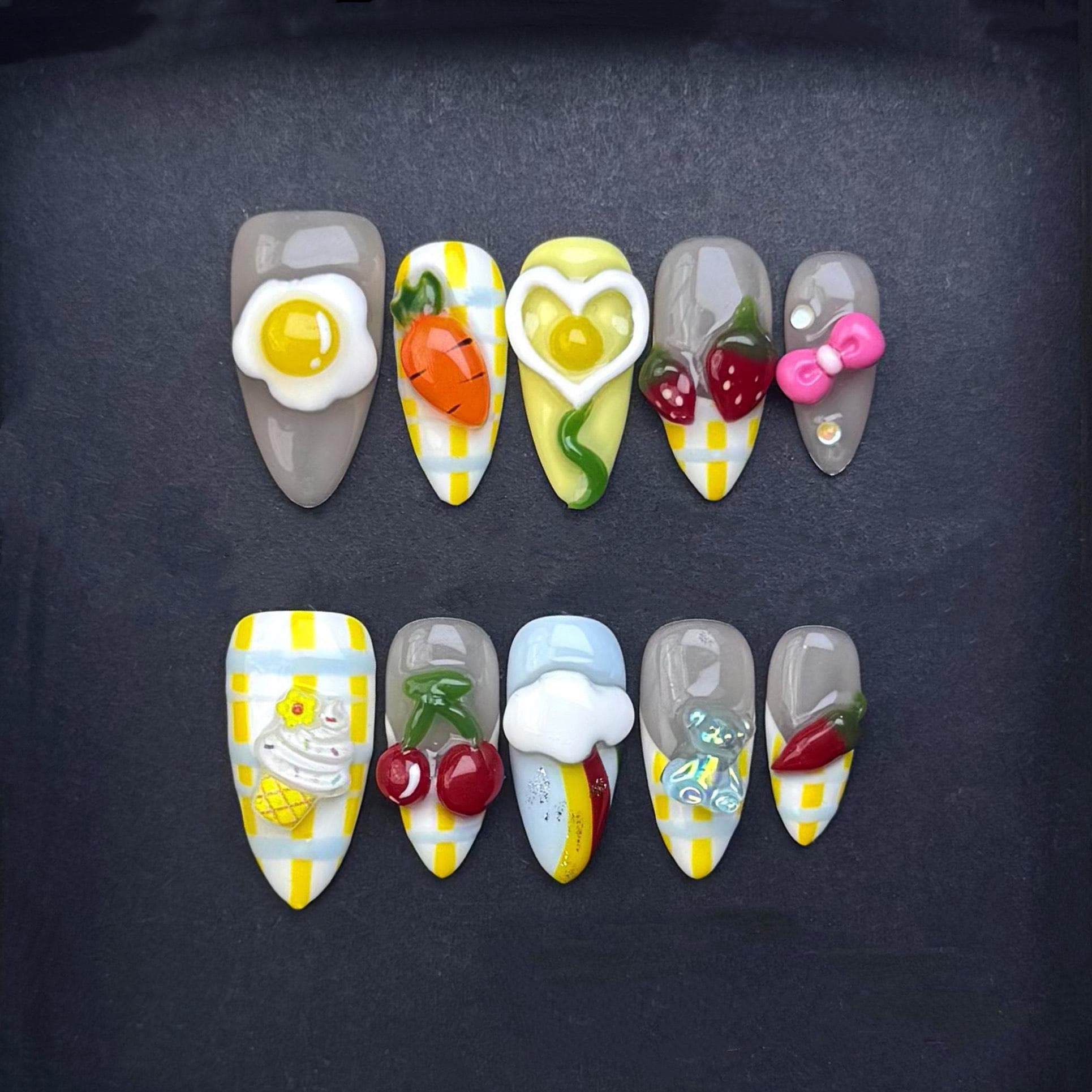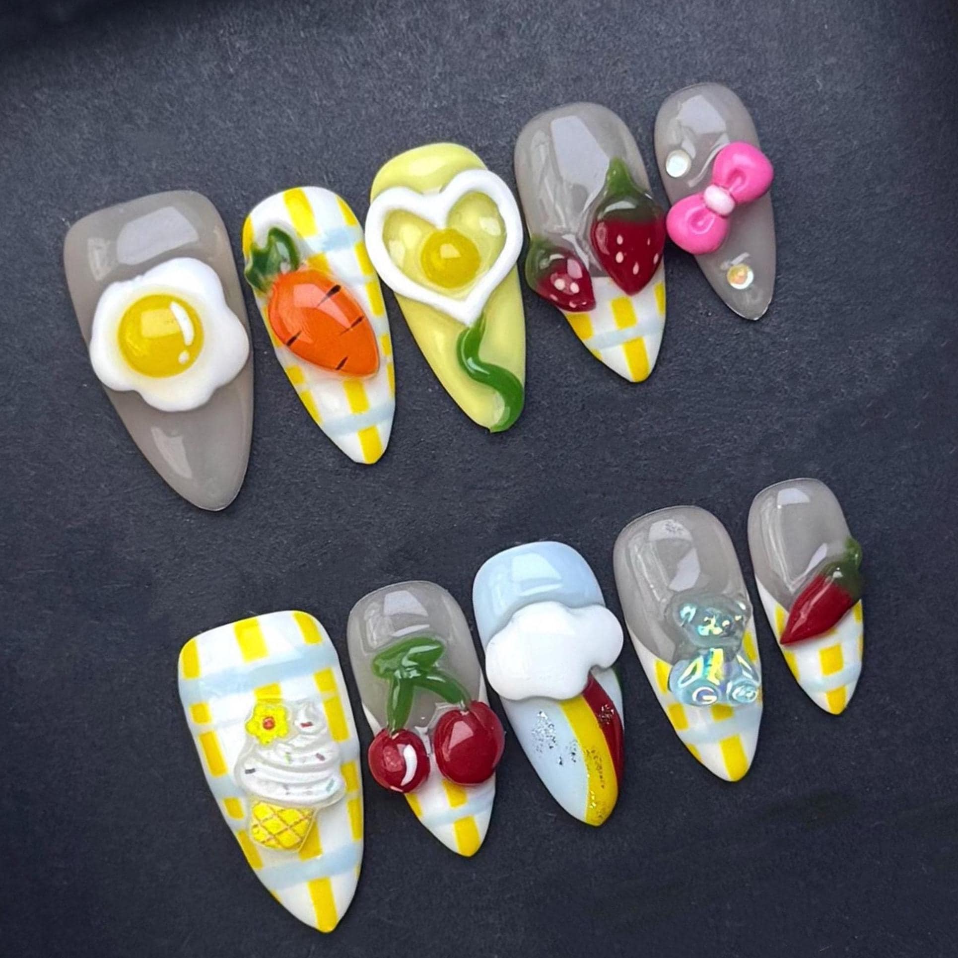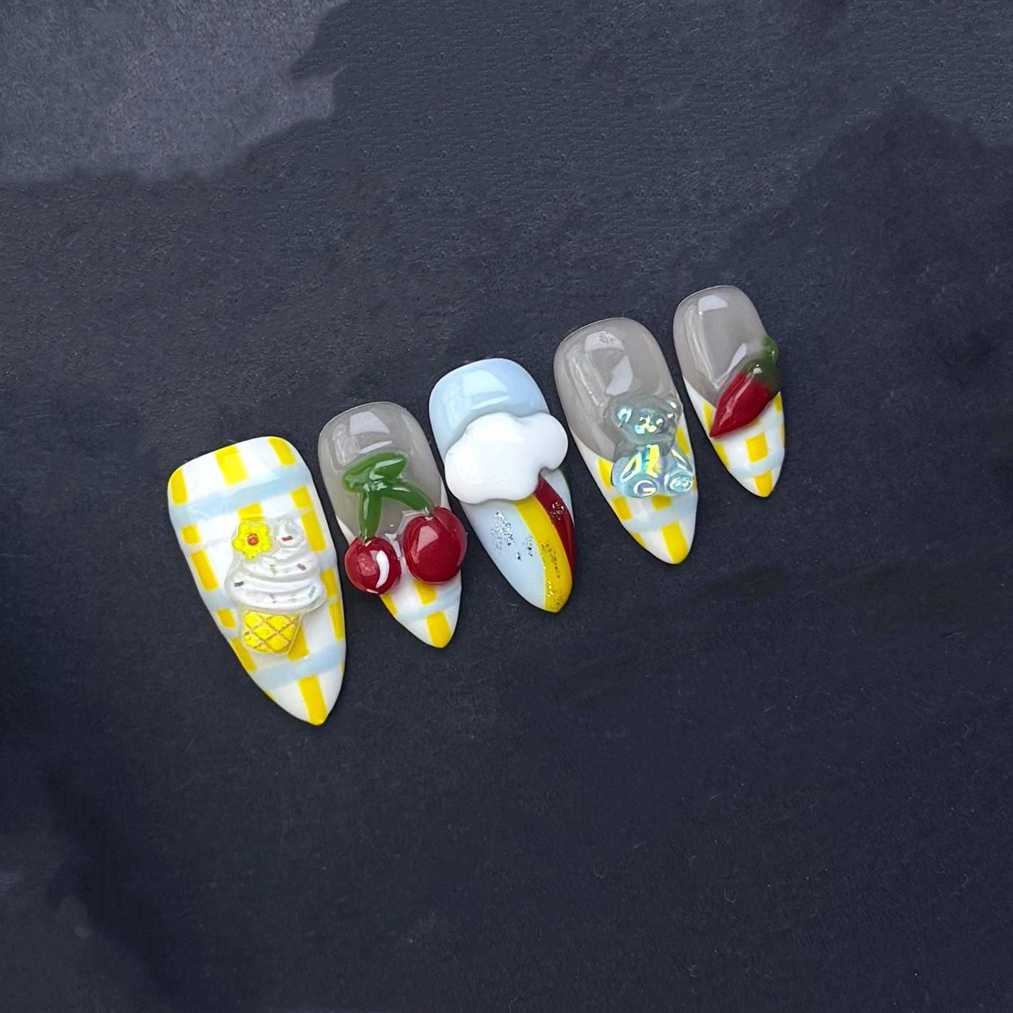 This playful and colorful press-on nail set is bursting with personality and nostalgic charm! Designed with a bright yellow-and-white gingham base and neutral grey accents, the nails are adorned with 3D kawaii breakfast and picnic-inspired embellishments including a sunny-side-up egg, carrot, heart-shaped yolk, cherries, strawberries, ice cream, bow, and more. A cheerful mix of cute food and summer sky details like clouds and rainbows adds a dreamy vibe. Perfect for fun outings, themed shoots, or adding a statement to your day.