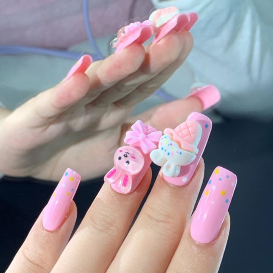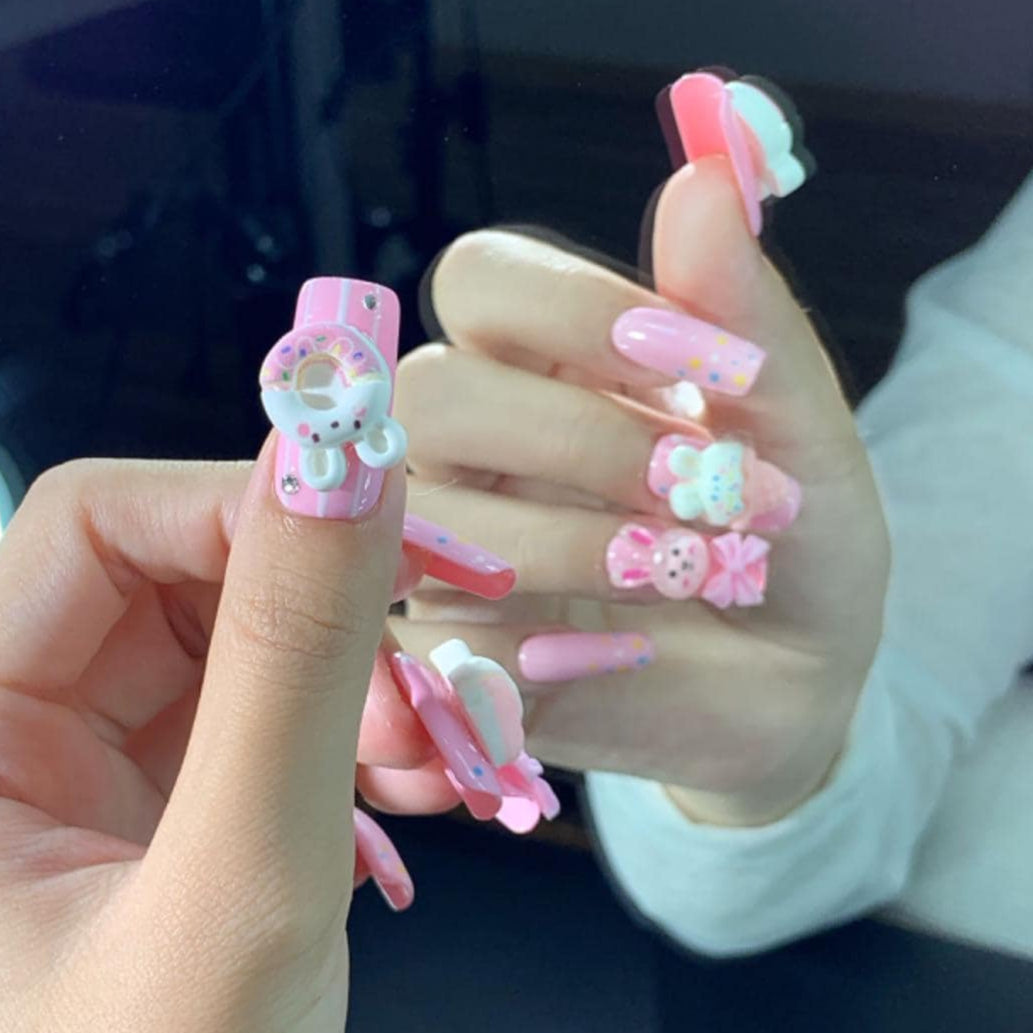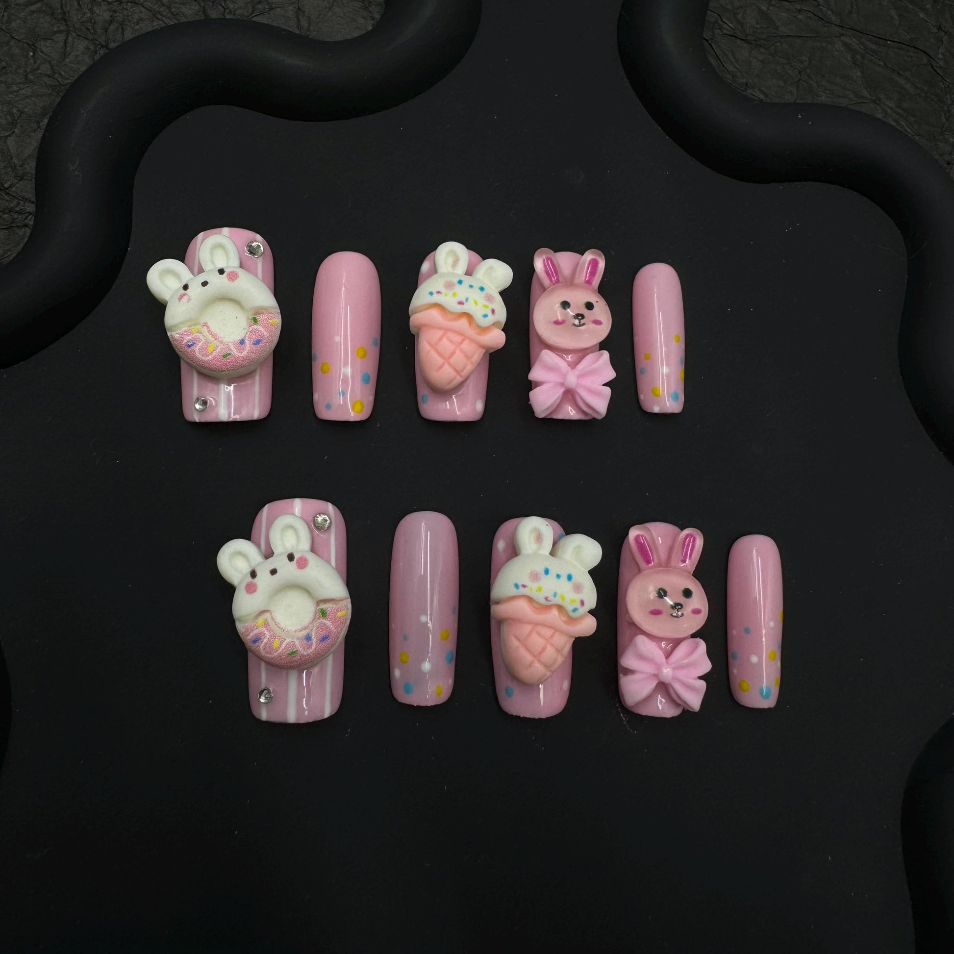 Kawaii Bunny Dessert Press On Nails – 3D Ice Cream & Donut Cutie Set Artificial reusable fake glue on faux manicure nails trendy art