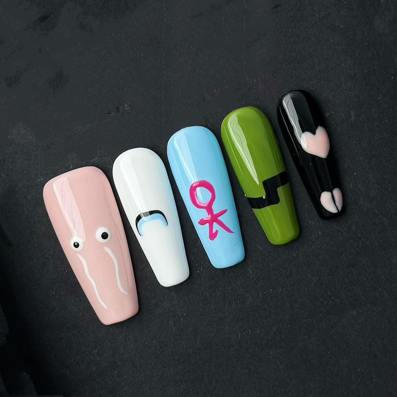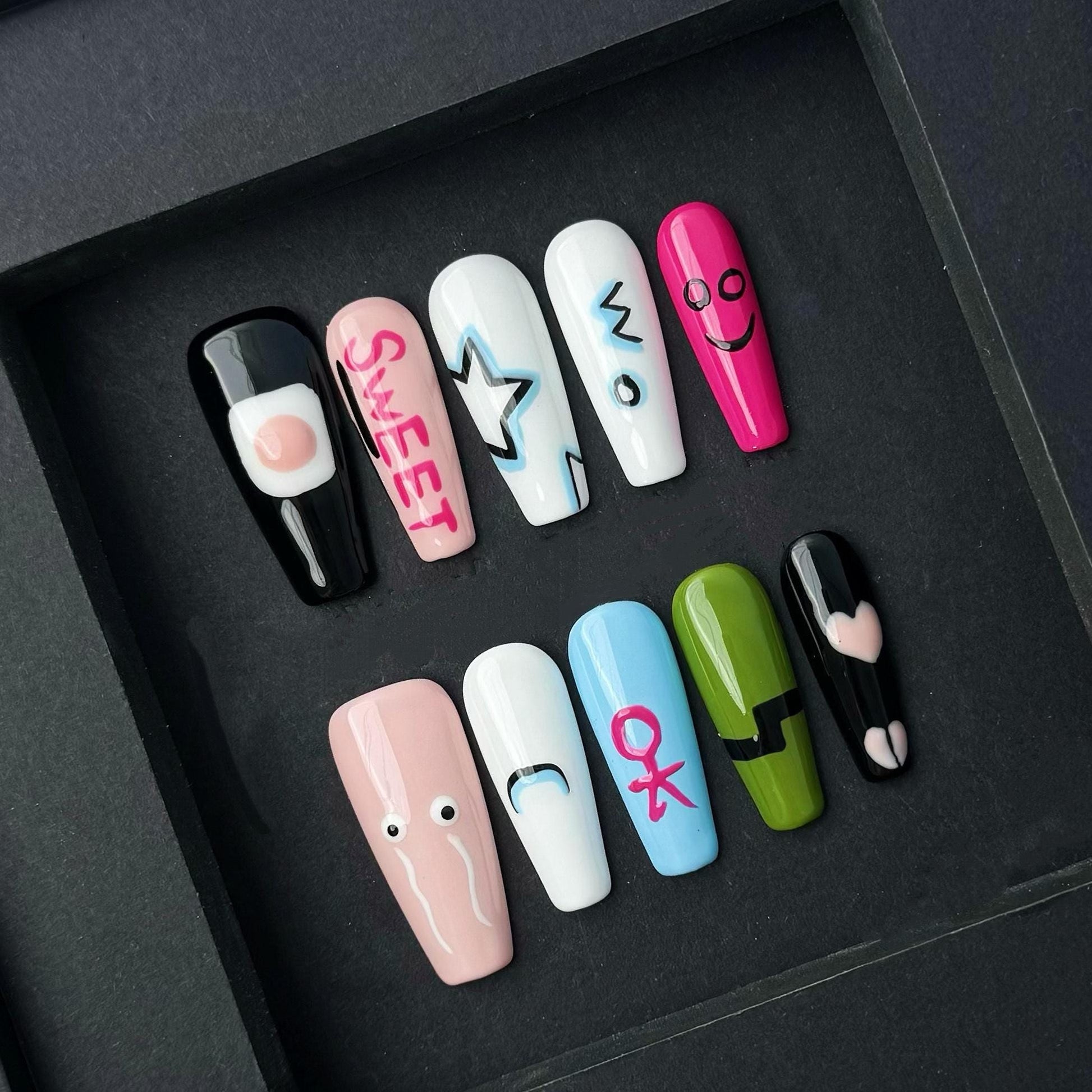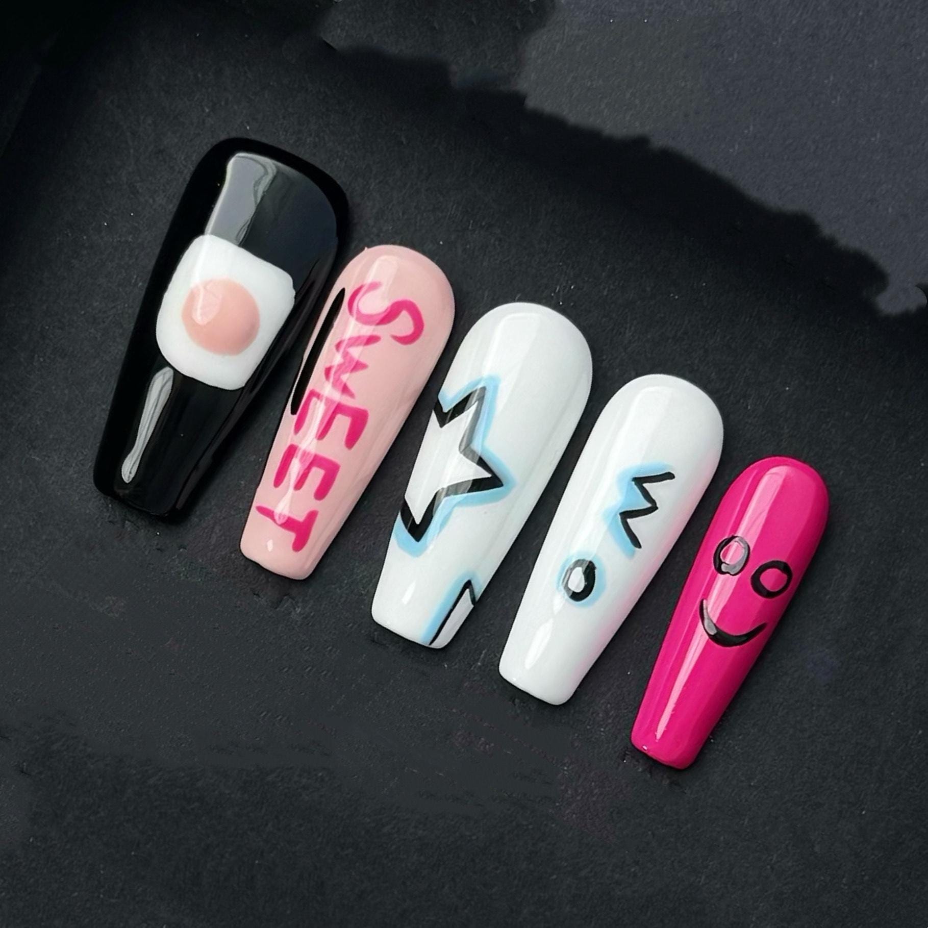 This playful press-on nail set features a vibrant mix of comic-style art and sweet motifs. From a bold black and white design to pastel pink, glossy fuchsia, and eye-catching star and smiley face accents, these nails bring personality and fun to your fingertips. Perfect for lovers of kawaii style and quirky nail art.