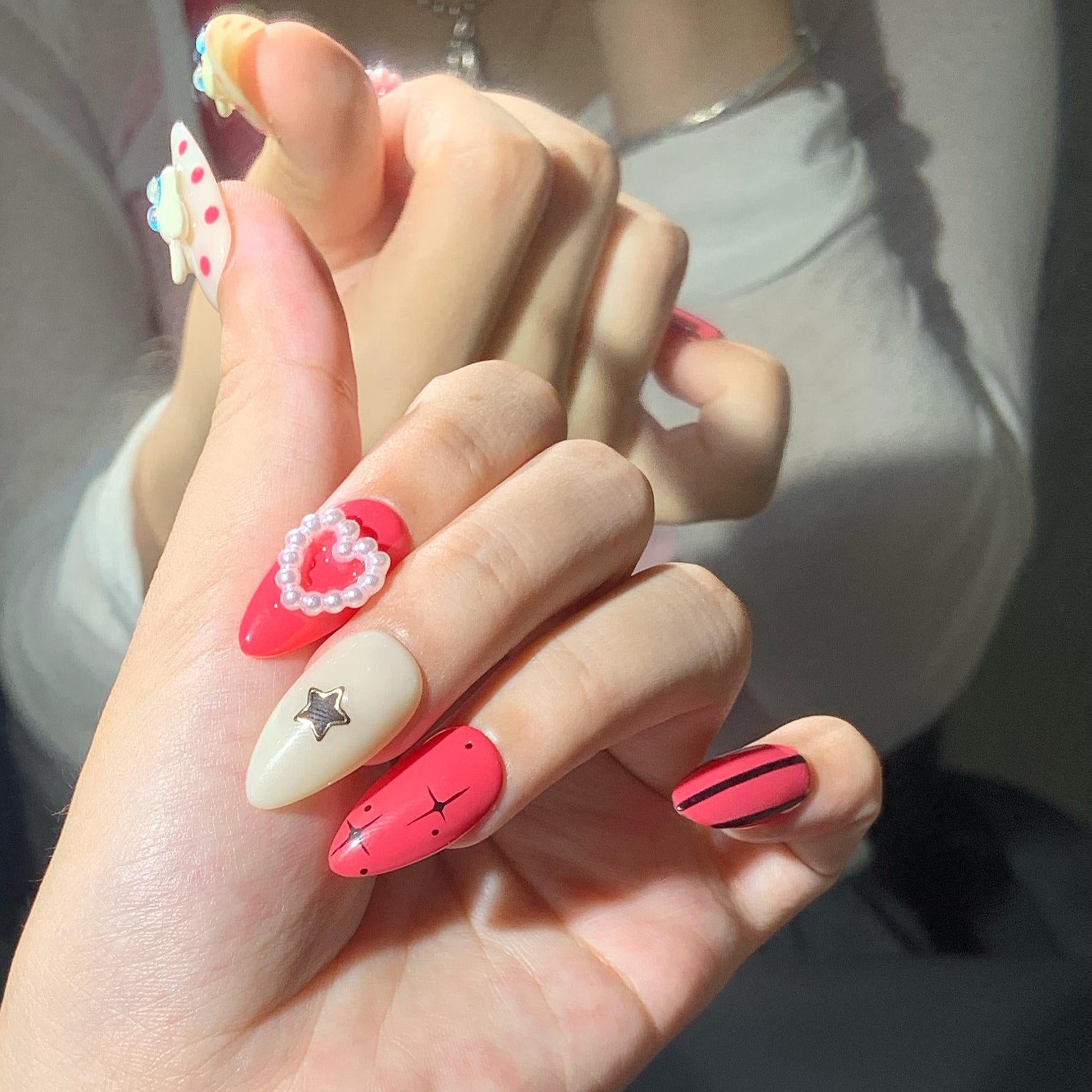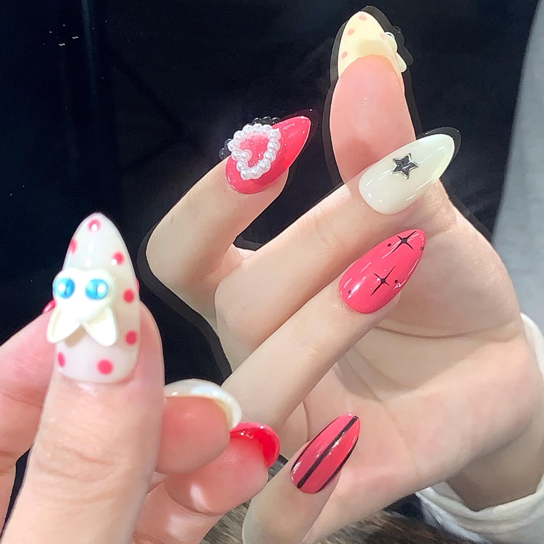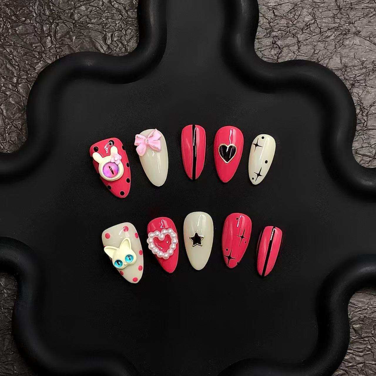 Kawaii Gothic Heart Press-On Nails Red & Cream Mix with 3D Charms glue on artificial faux nails heart bows cats pearls stars y2k lolita art