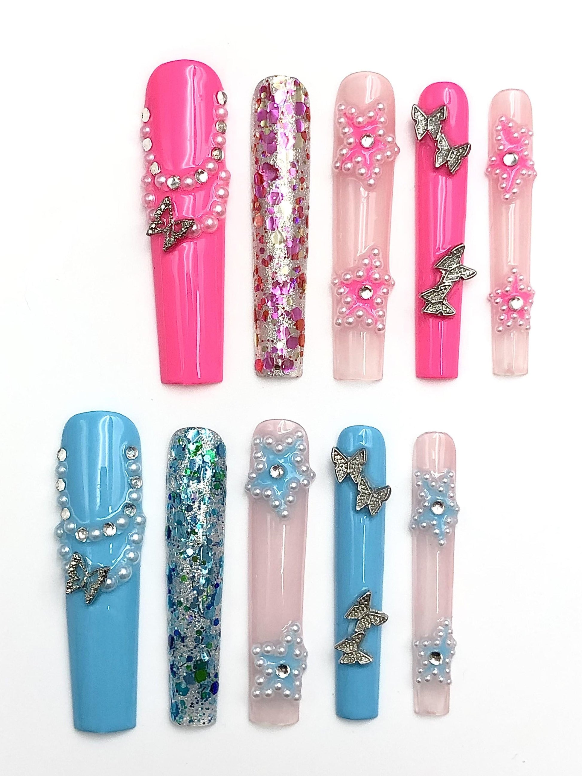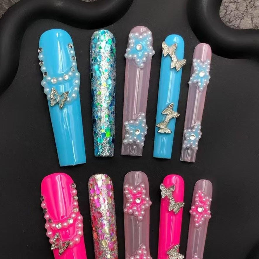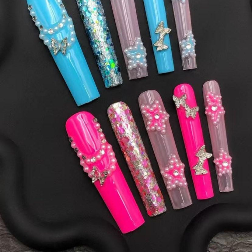 Kawaii Pearl Glitter Press-On Nails with Butterfly Charms–Pink&Blue Extra Long Nail Set Artificial reusable fake glue on manicure nails art