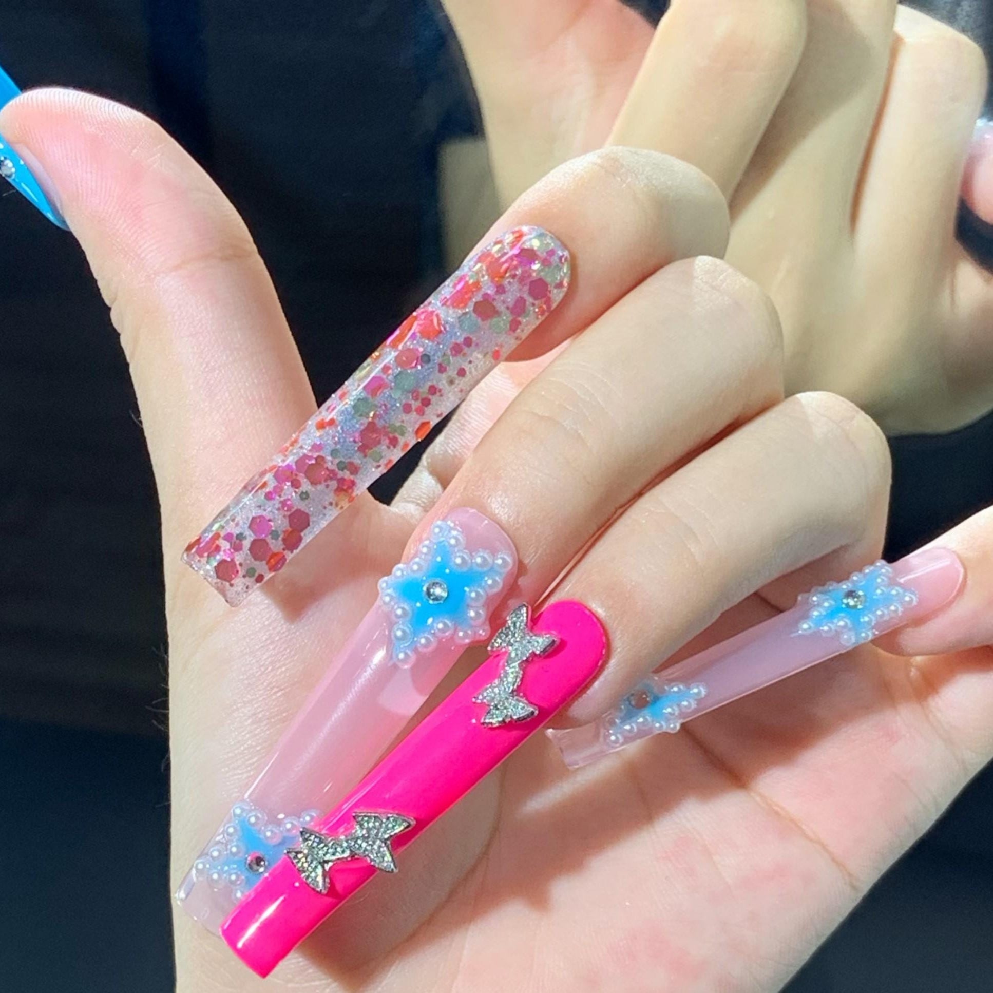 This eye-catching kawaii press-on nail set features a dreamy combo of glossy pink and baby blue tones, embellished with 3D pearls, glitter, and metallic butterfly charms. Star-shaped pearl clusters and dazzling confetti glitter nails add a playful, fairytale vibe. Perfect for bold styles, cosplay, or anyone who loves statement glam with a cute twist.