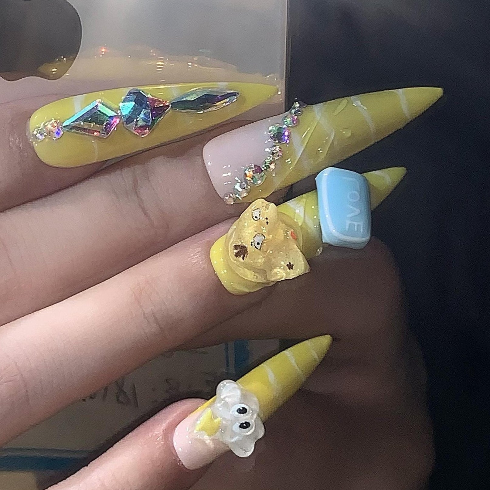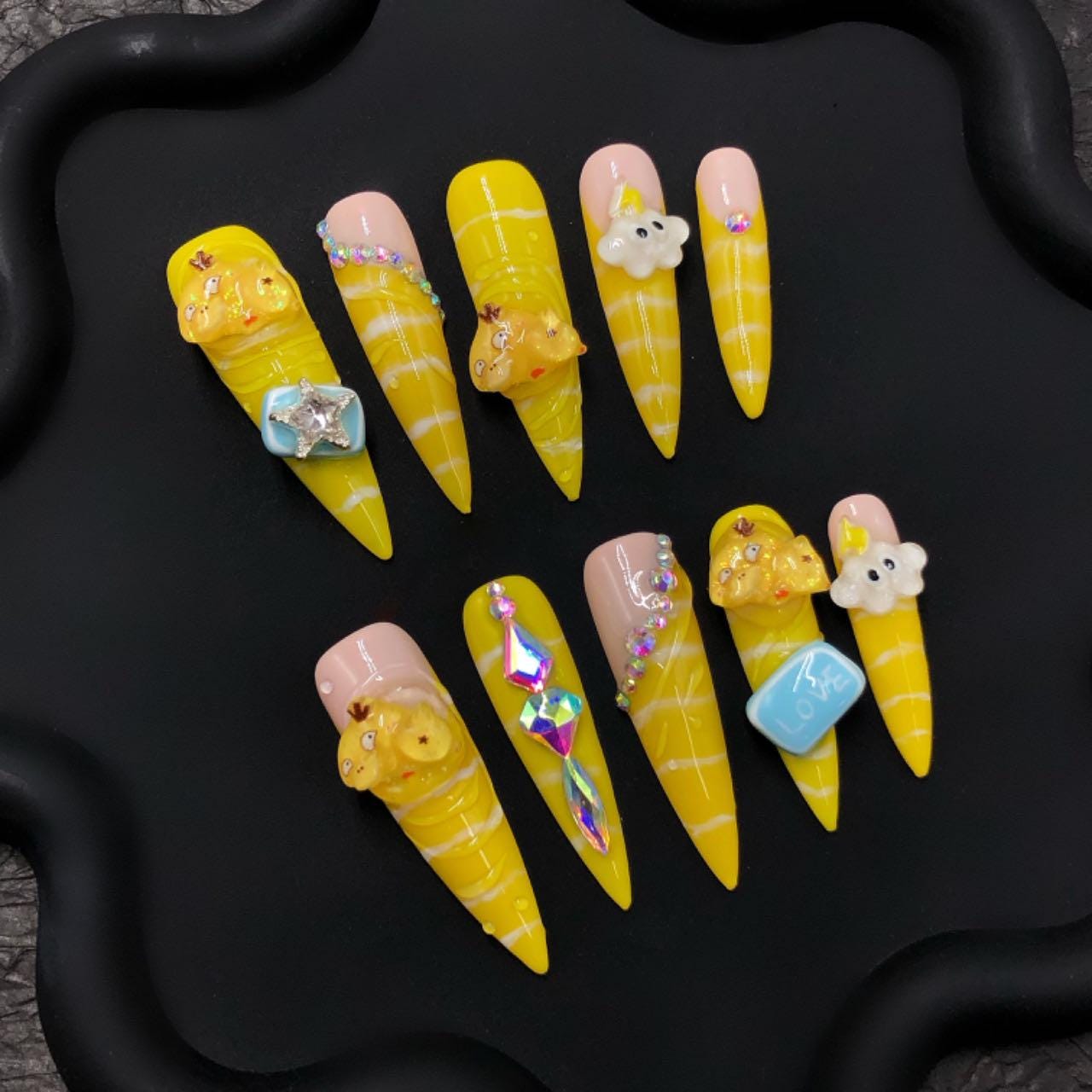 kawaii press on nails cute yellow 3D cartoon stiletto press on cloud art, bear charms, pastel long glam anime inspired bling fun character