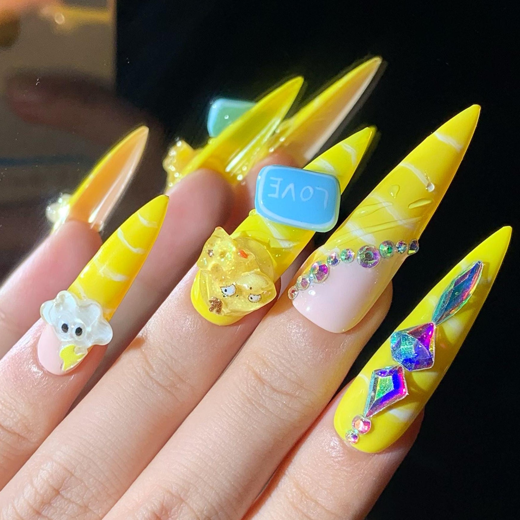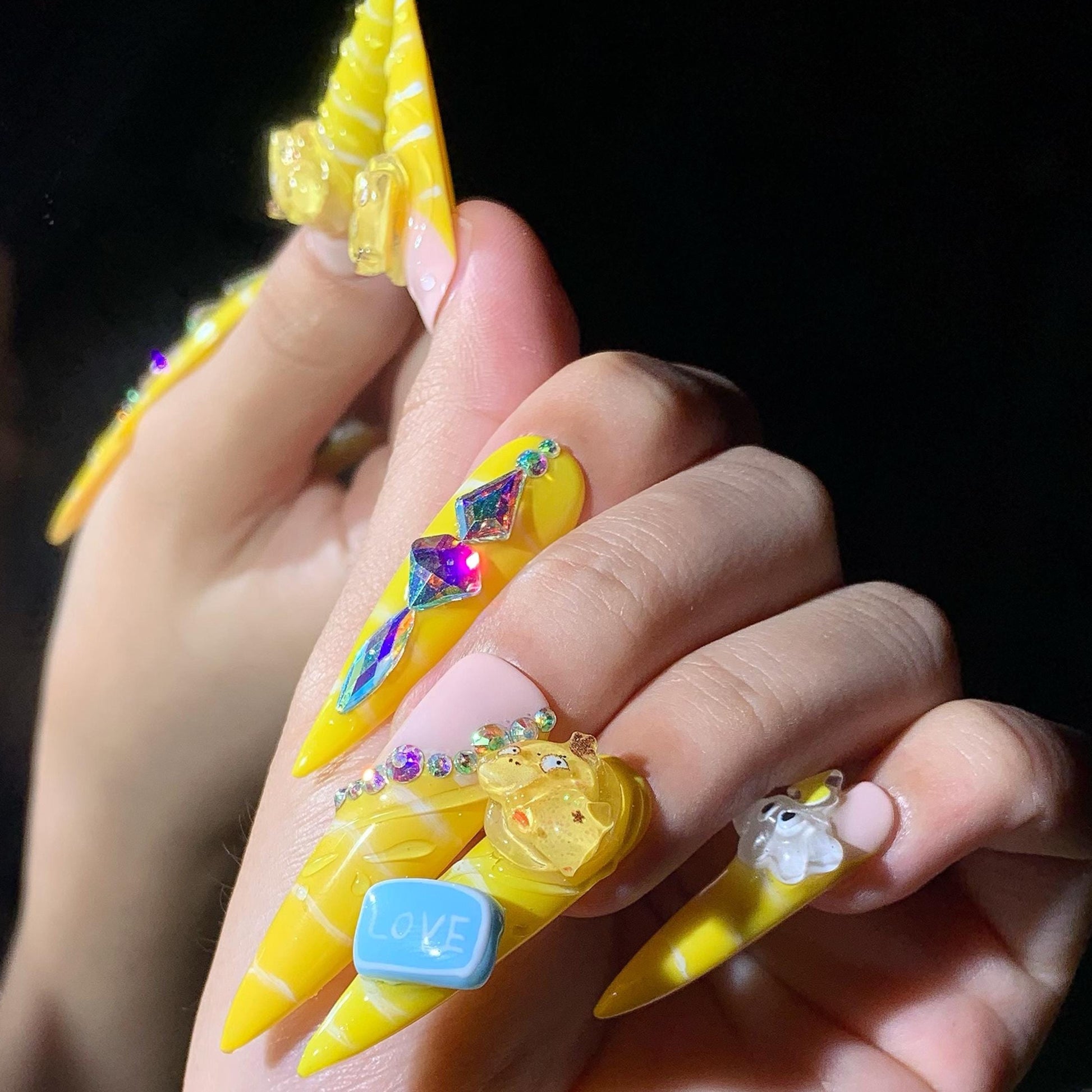 Add a pop of playful energy with these bright yellow kawaii press-on nails! Featuring 3D cartoon bears, clouds, hearts, and sparkly gem accents, this long stiletto set is a cheerful blend of fun and charm. With swirled candy-like patterns and pastel touches, they’re perfect for anime lovers, cute-core fans, or anyone who loves statement nails with personality.