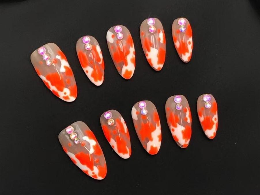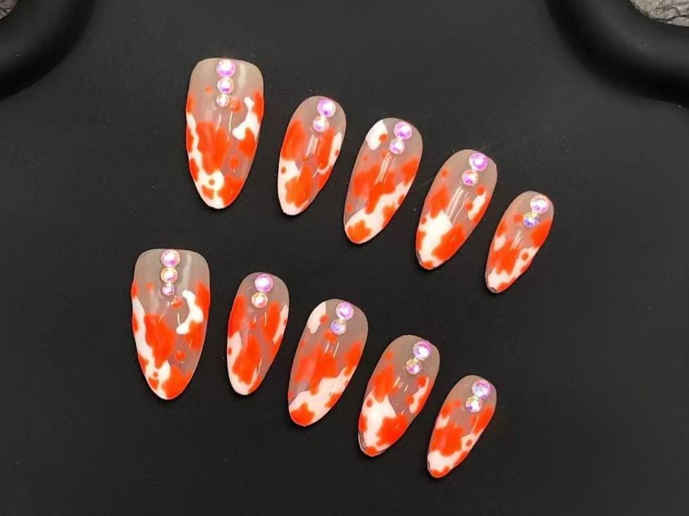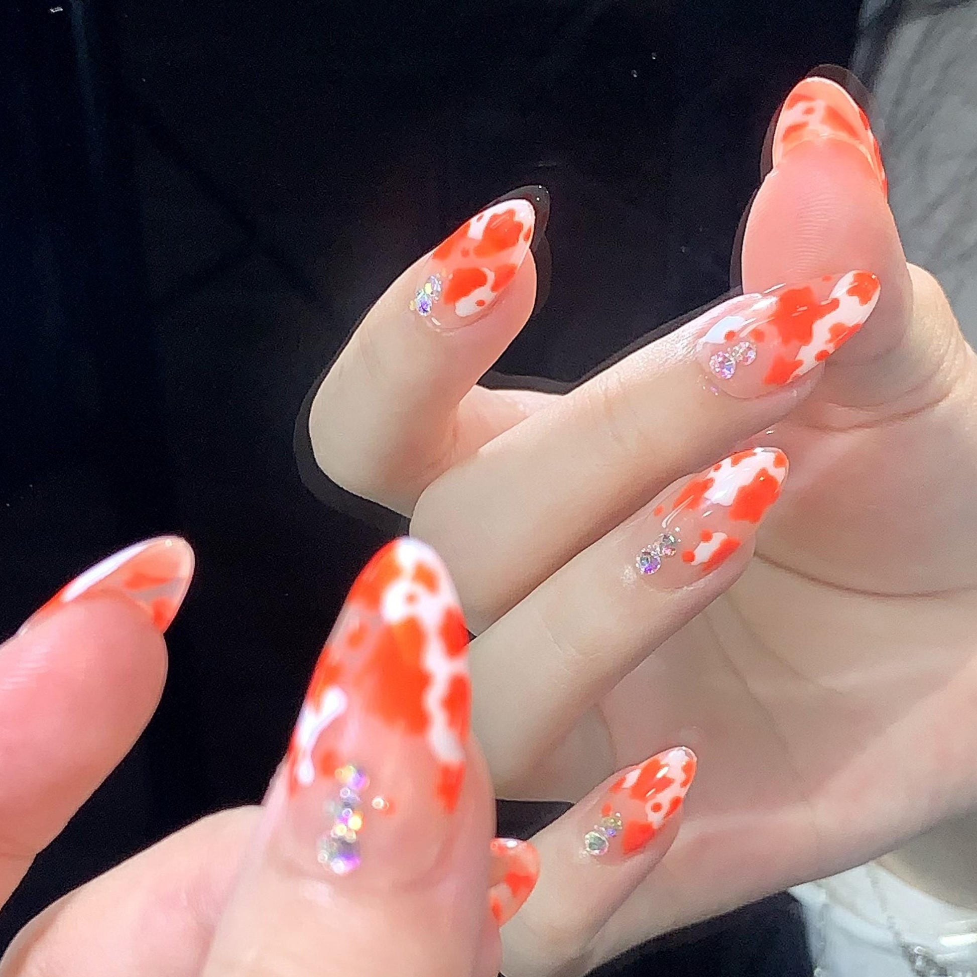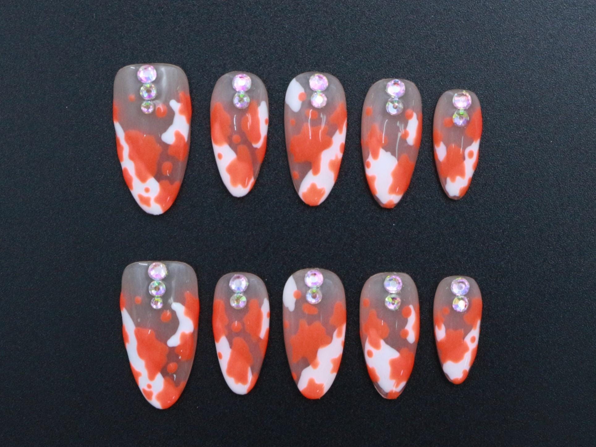 Channel the beauty of koi fish with this eye-catching press-on nail set, featuring a smoky gray base layered with vibrant red and white abstract splashes. Each nail is topped with shimmering rhinestones for an extra touch of glam. These nails are perfect for those who love artistic, nature-inspired designs with a bold, modern edge.