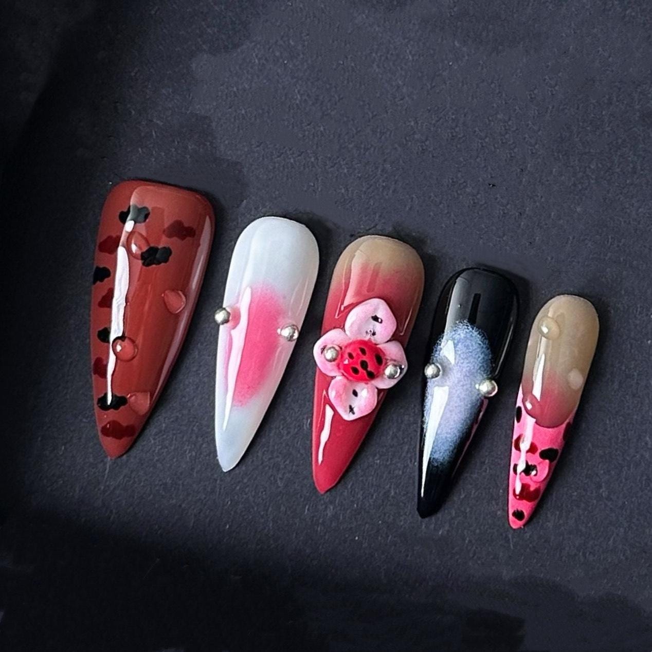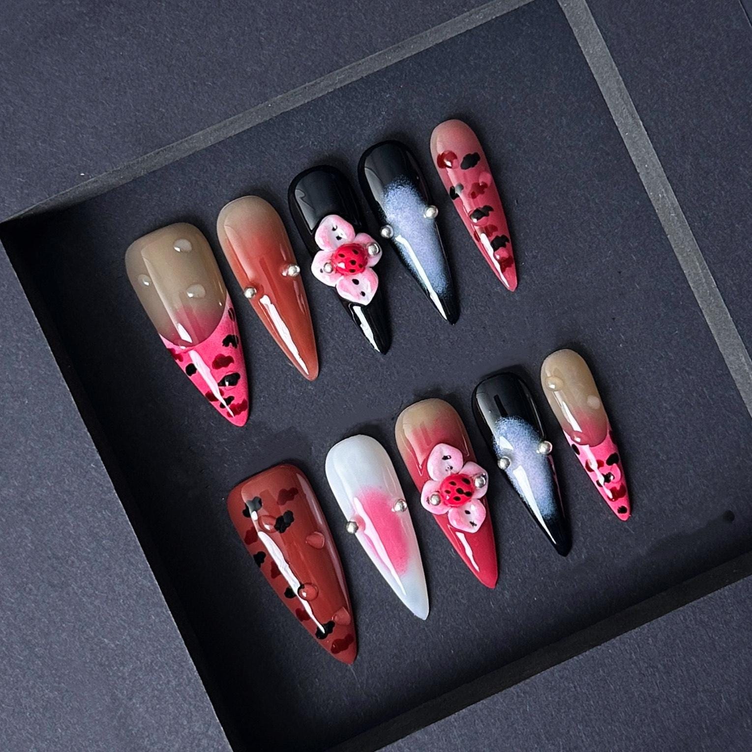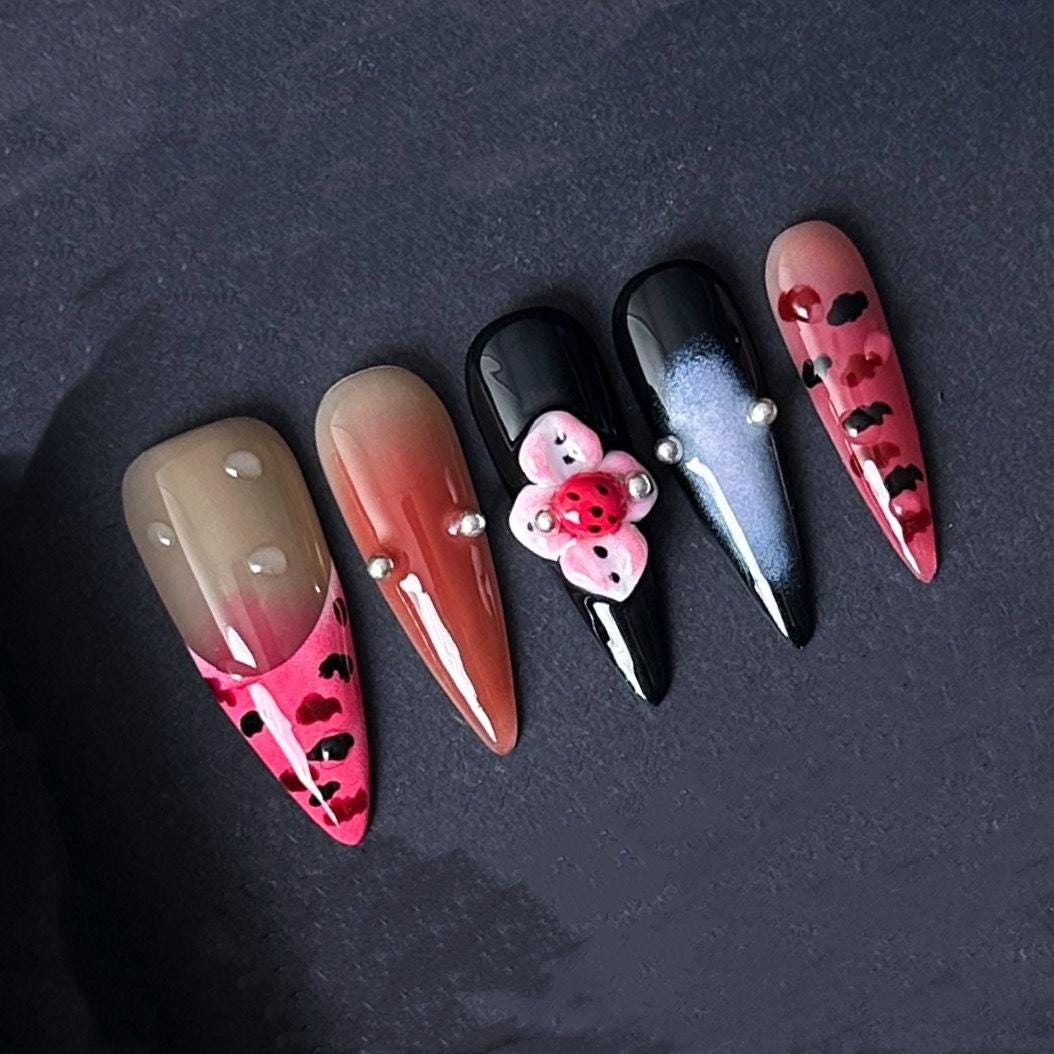 This fun and fierce press on nail set features bold leopard spots soft gradients and adorable 3d ladybugs for a playful twist on edgy glam perfect for springtime flair or nature lovers.