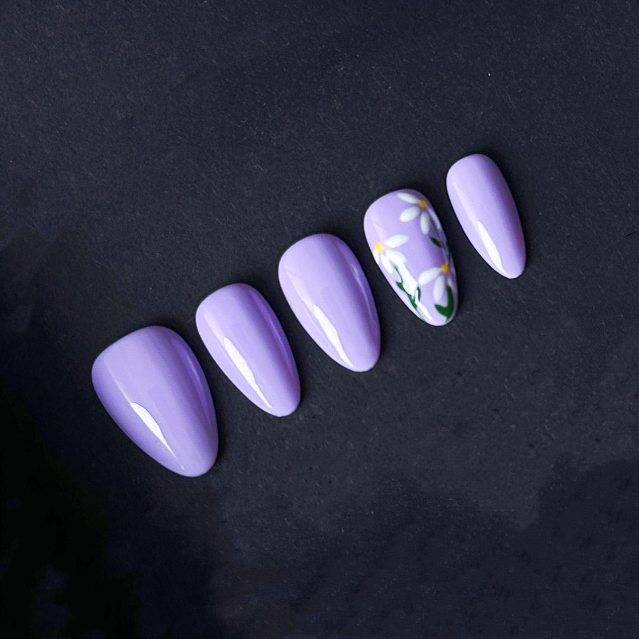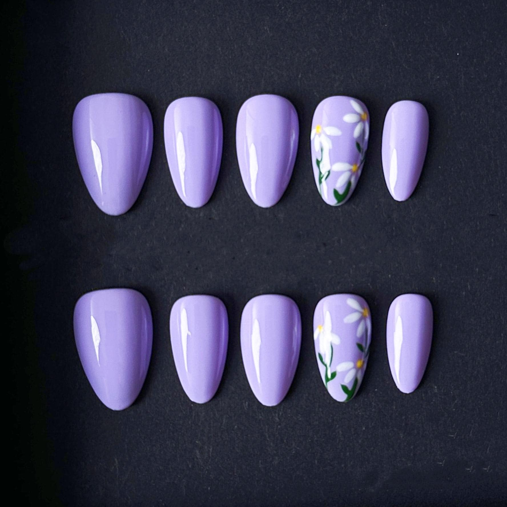Lavender Daisy Press-On Nails – Soft Purple Floral Spring Set. Artificial reusable fake glue on faux manicure nails trendy art.