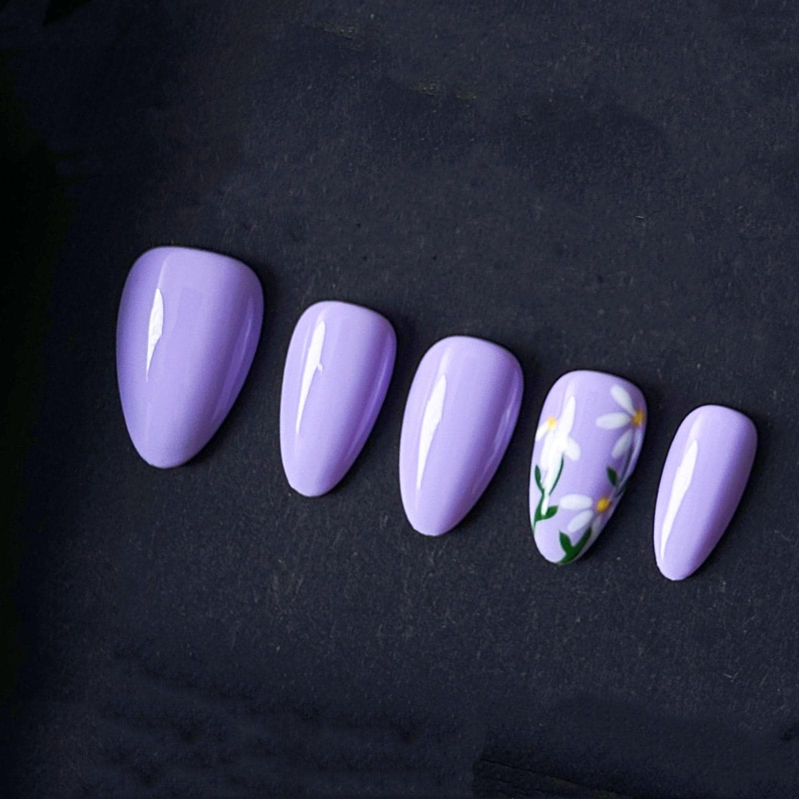 Bring a touch of springtime charm to your fingertips with this lavender daisy press-on nail set. Featuring a stunning glossy lavender base, this elegant almond-shaped set includes hand-painted white daisies with sunny yellow centers and leafy green stems on two accent nails. Perfect for floral lovers or those who enjoy a cheerful and clean aesthetic, these nails offer a sweet, feminine vibe suitable for everyday wear, brunches, garden parties, or spring and summer celebrations.
