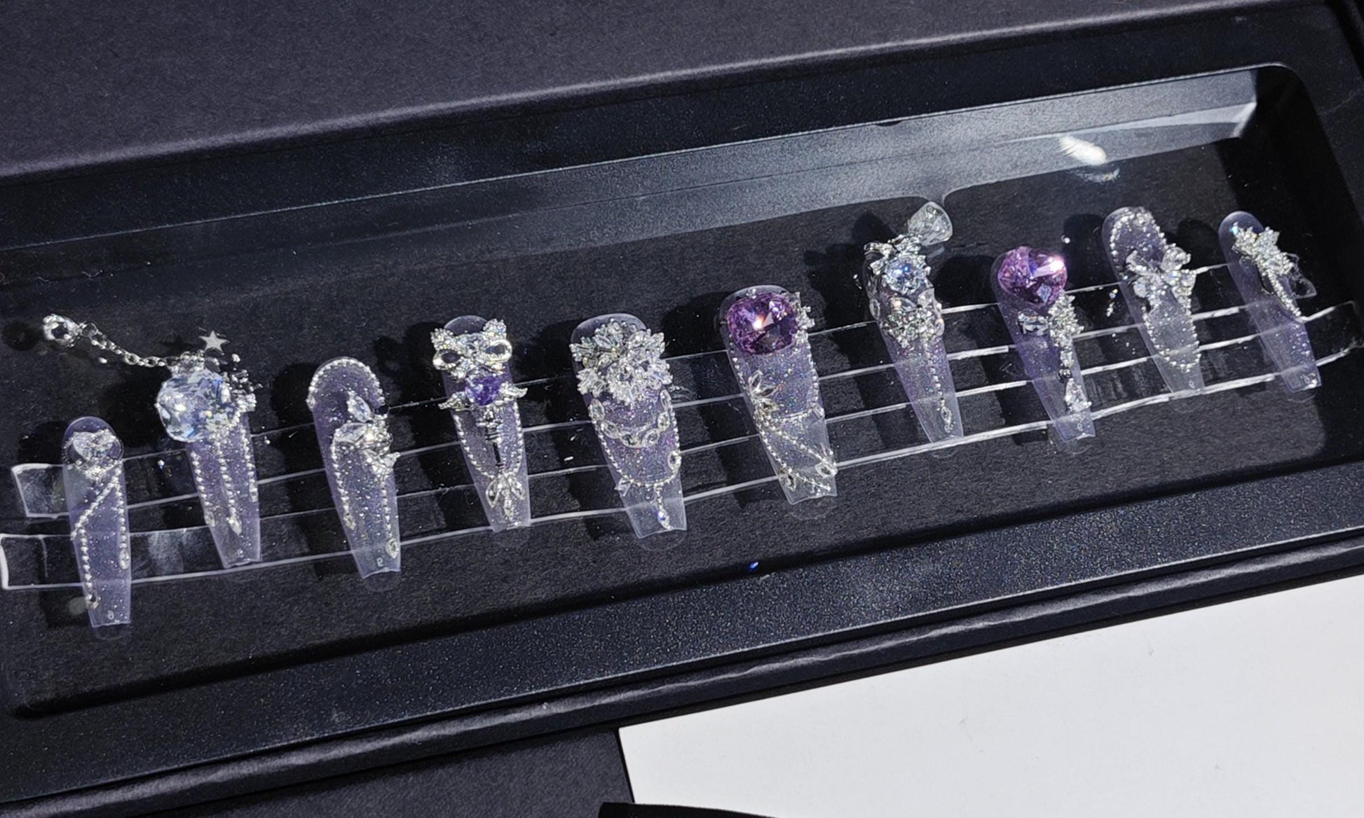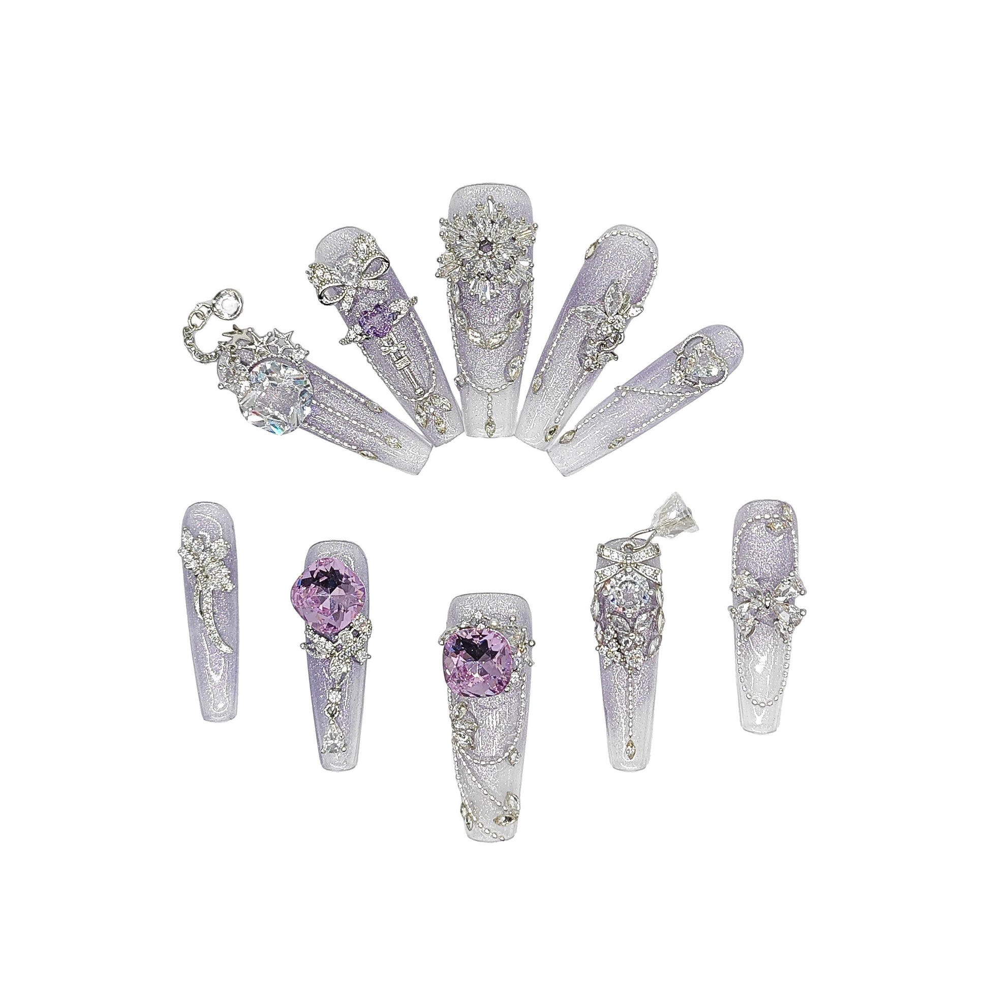 Lavender Luxury Press-On Nails | 3D Crystal Nails with Chains & Charms | Fairycore Glam | Reusable Nail Art