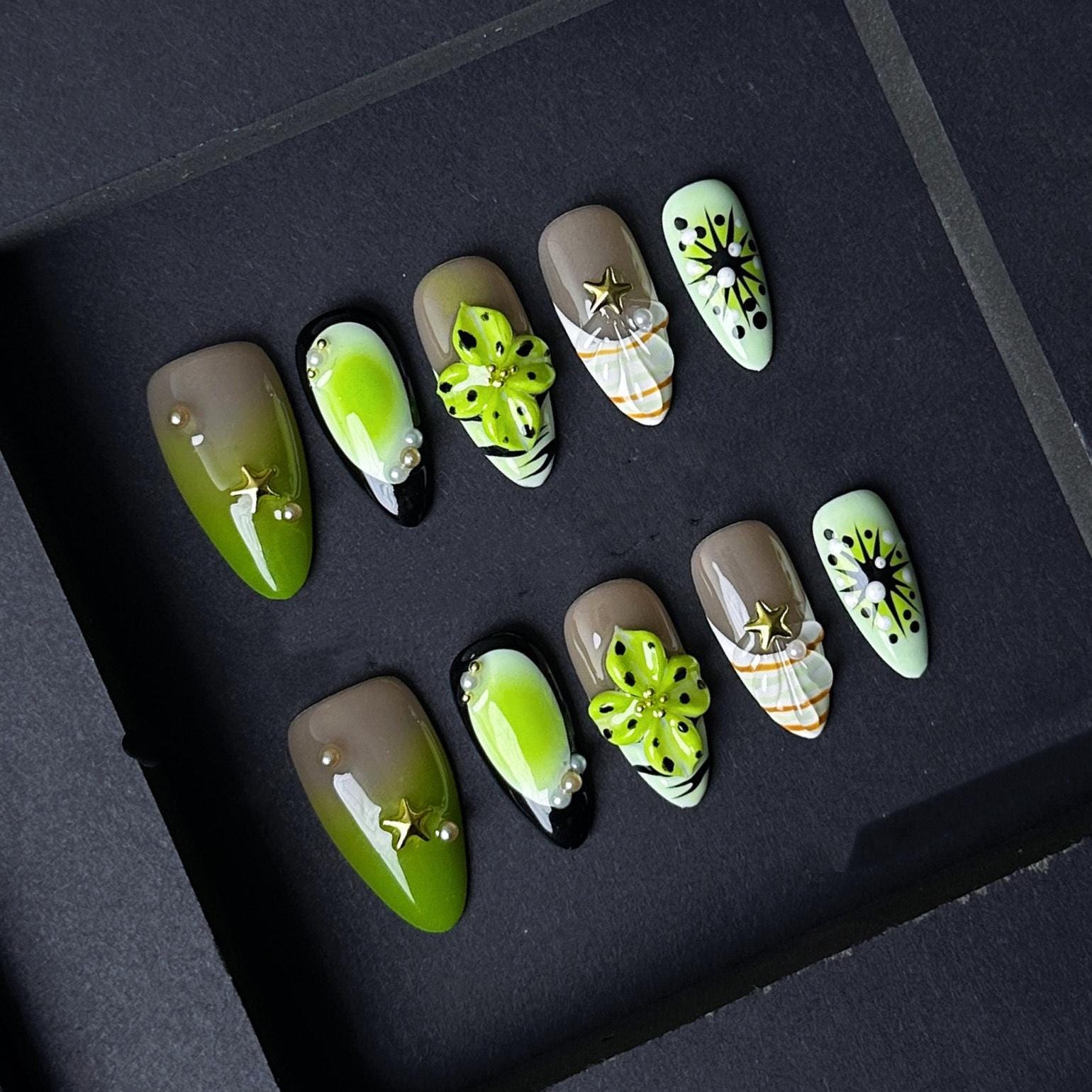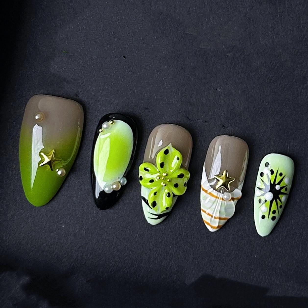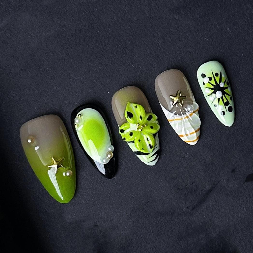 This vibrant jungle-inspired nail set features rich shades of lime green taupe and black with detailed 3D floral accents star and pearl charms and striking abstract patterns. A perfect bold statement for summer vacations tropical events or standing out in everyday style.
