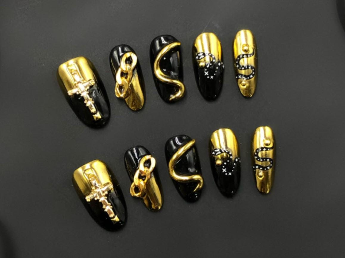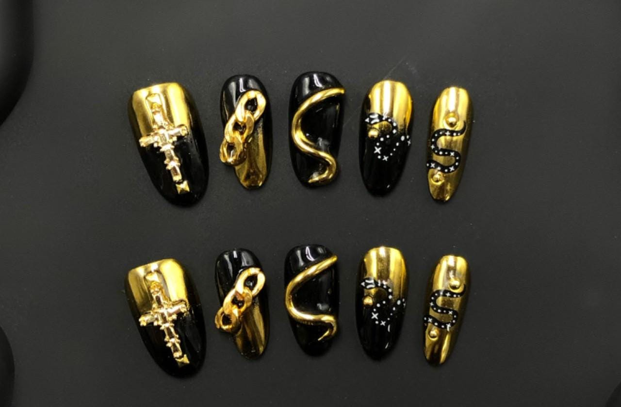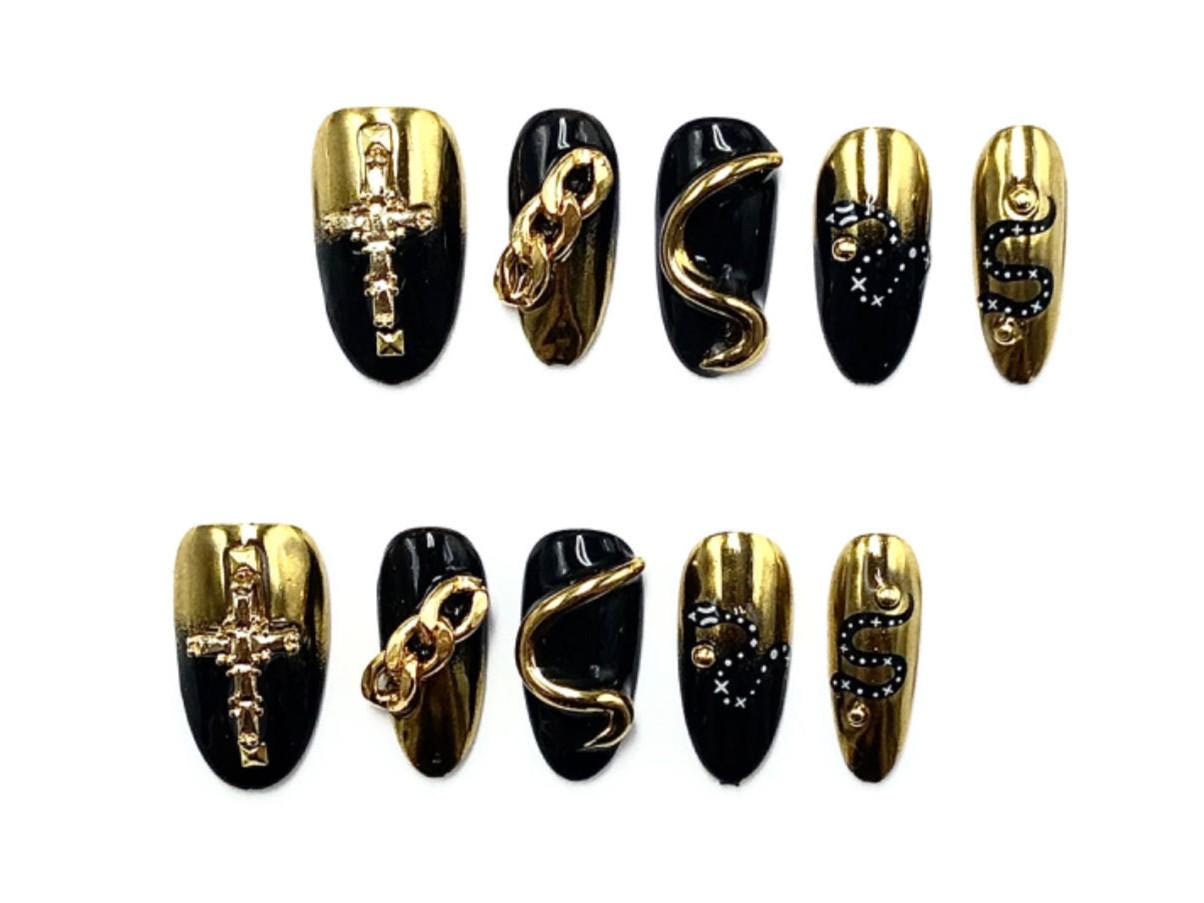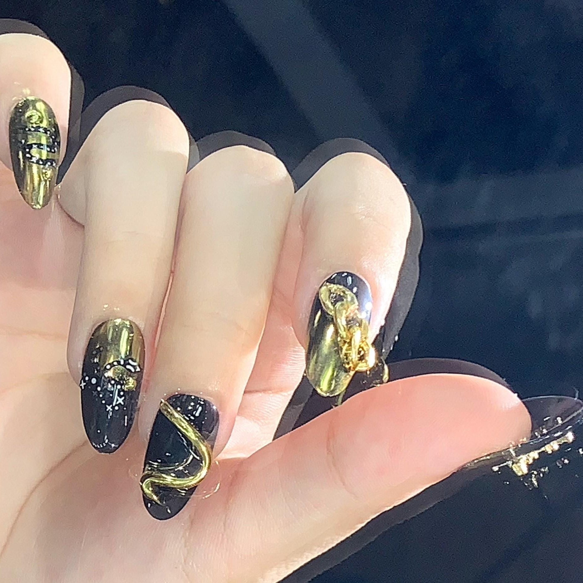 Elevate your style with this ultra-glamorous black and gold cat-eye press-on nail set. Featuring a sleek magnetic shimmer effect, gold swirls, celestial star details, and intricate 3D embellishments like chains and gems, this set oozes luxury and mystery. Perfect for formal events, night outs, or anyone obsessed with statement nails that shine from every angle!