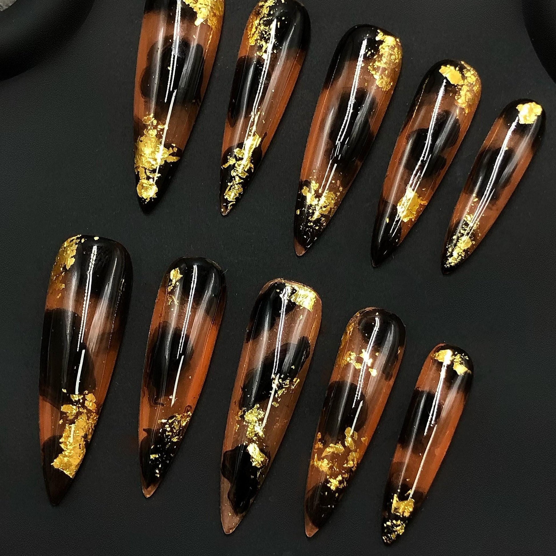 Luxury Black & Gold Foil Abstract Press-On Nails – Coffin Shape Manicure glue on artificial fake faux reusable trendy nail