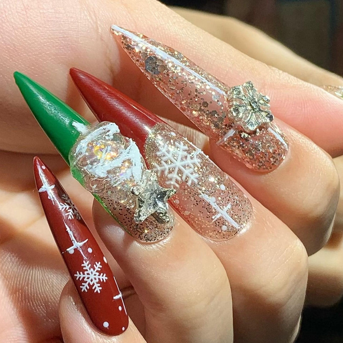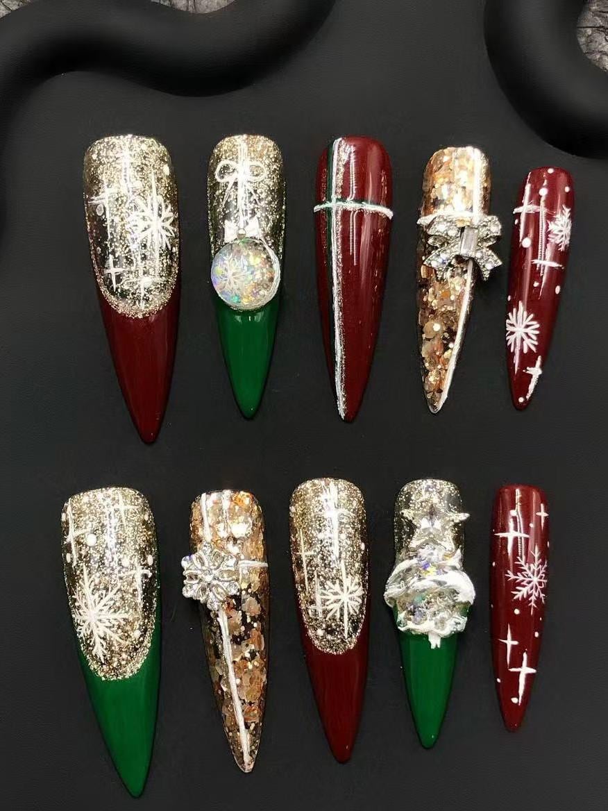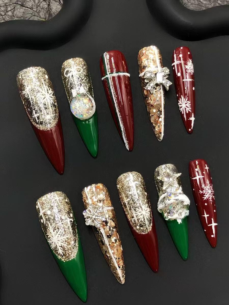 Celebrate the season in style with this dazzling Christmas-inspired press-on nail set. Featuring rich red and emerald green bases, gold glitter, snowflake designs, and 3D holiday charms like bows, ornaments, and a Christmas tree, these long stiletto nails are the perfect blend of festive and glam for your winter looks.