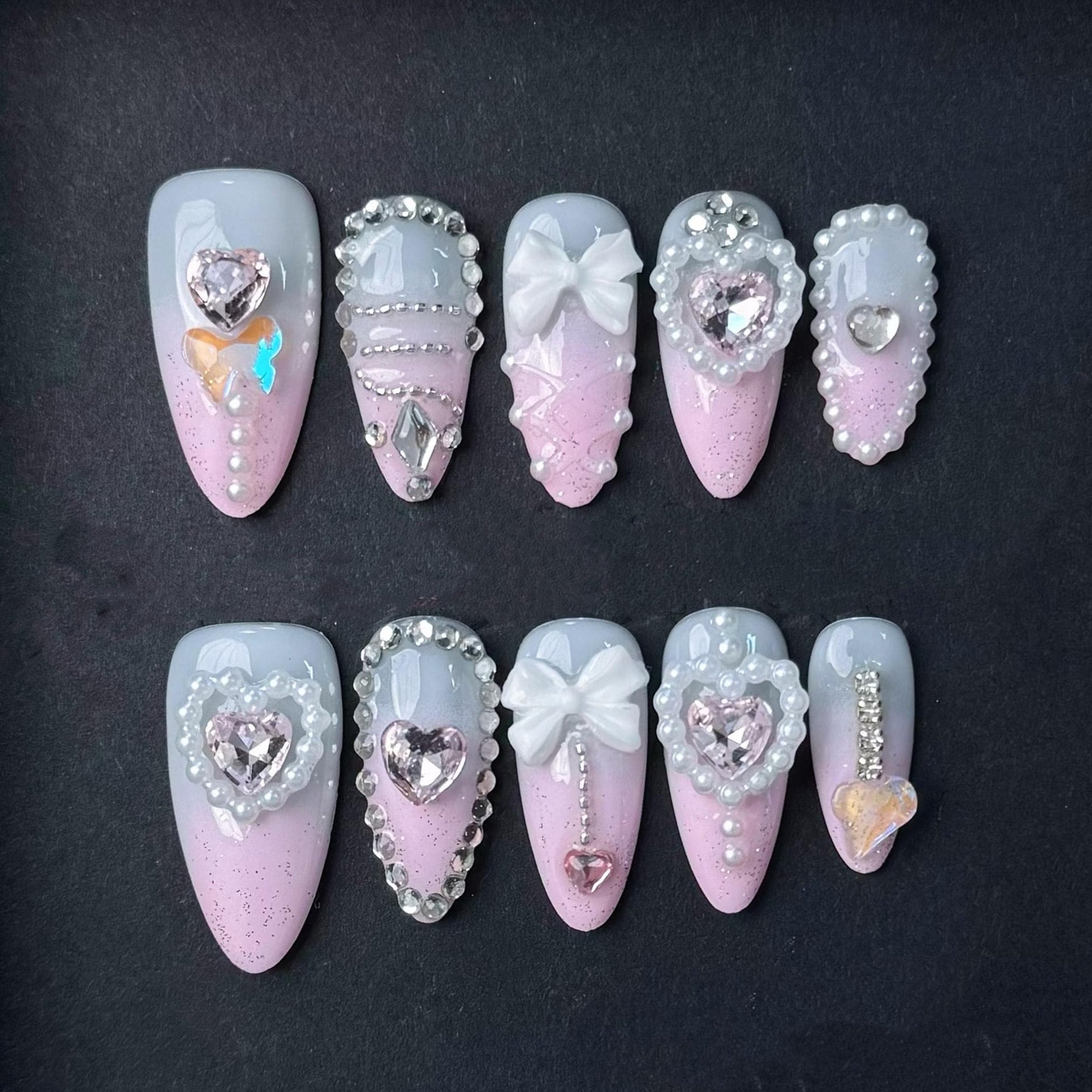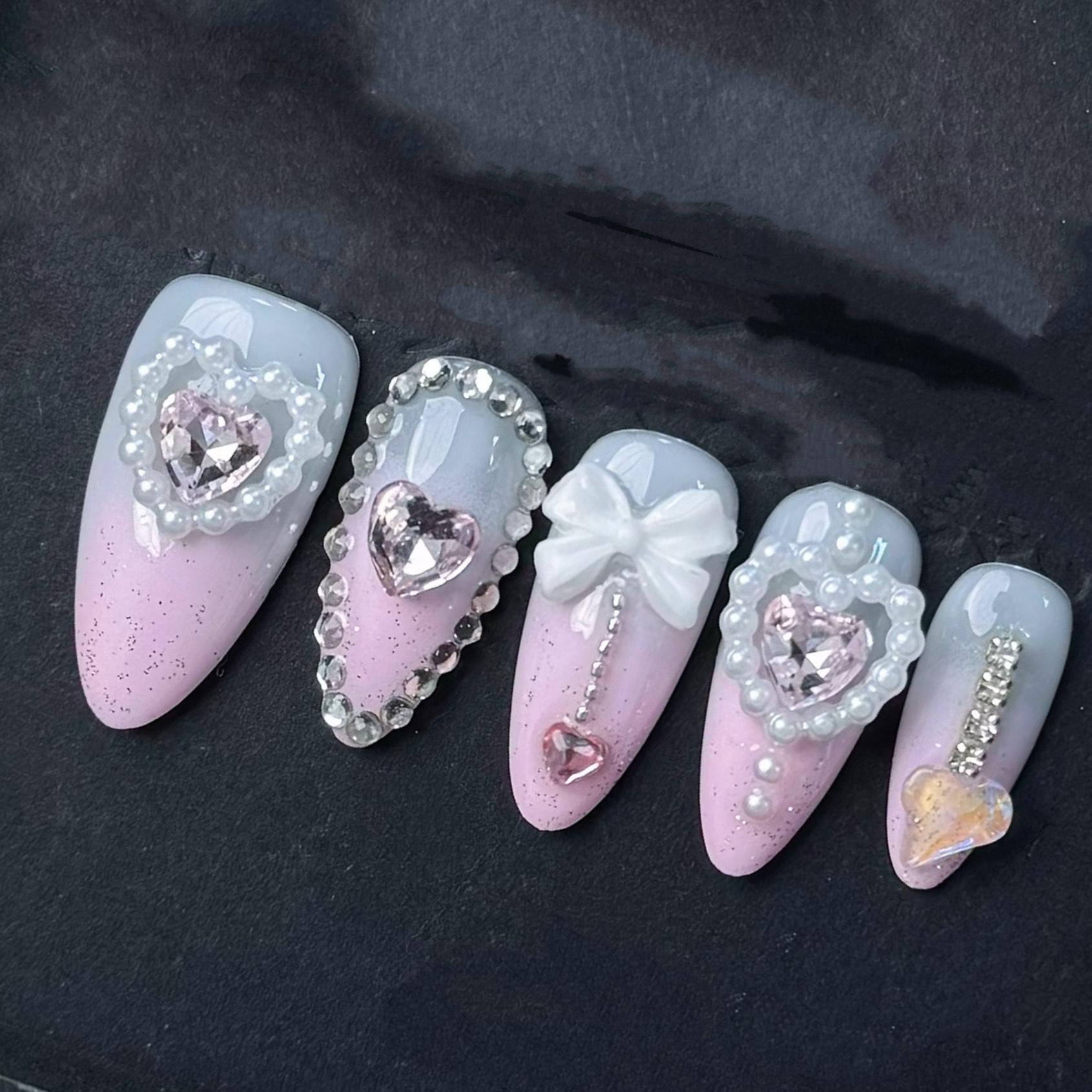 Elevate your look with these luxury pearl bow heart press on nails Featuring soft pink glitter ombre backgrounds 3D bows sparkling rhinestones pearl accents and heart shaped gems this set brings a glamorous princess inspired touch to any outfit Perfect for weddings parties or anyone who loves a soft and elegant vibe Handmade with attention to detail for a stunning long lasting finish