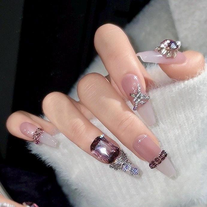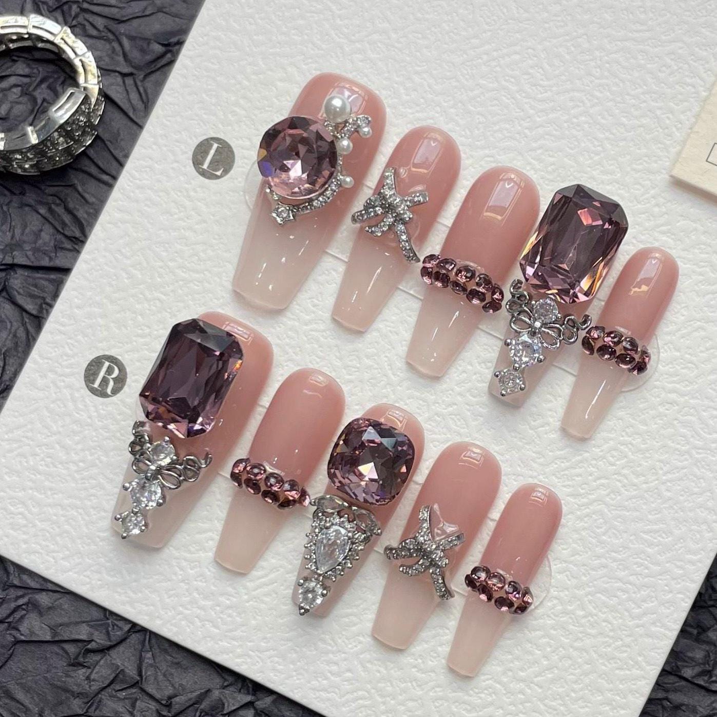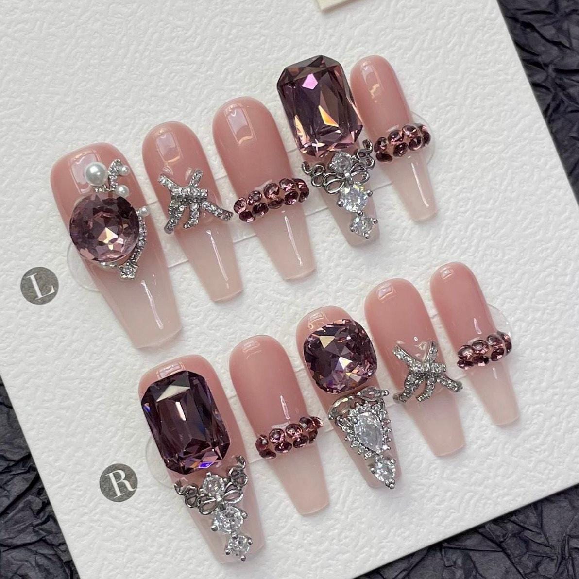 These luxury press on nails feature a nude base with bold rhinestone accents and crystal embellishments for a glamorous and elegant look perfect for special occasions or statement style lovers.