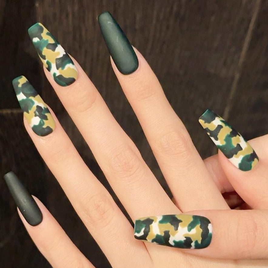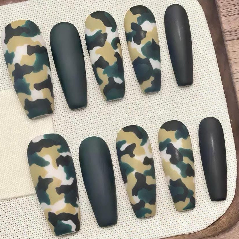 This edgy press-on nail set features a bold matte camouflage design paired with solid deep green accents. The long coffin shape gives it a sleek, modern look, perfect for anyone who loves a military-inspired vibe with a fashion-forward twist. Great for streetwear lovers and bold style statements.