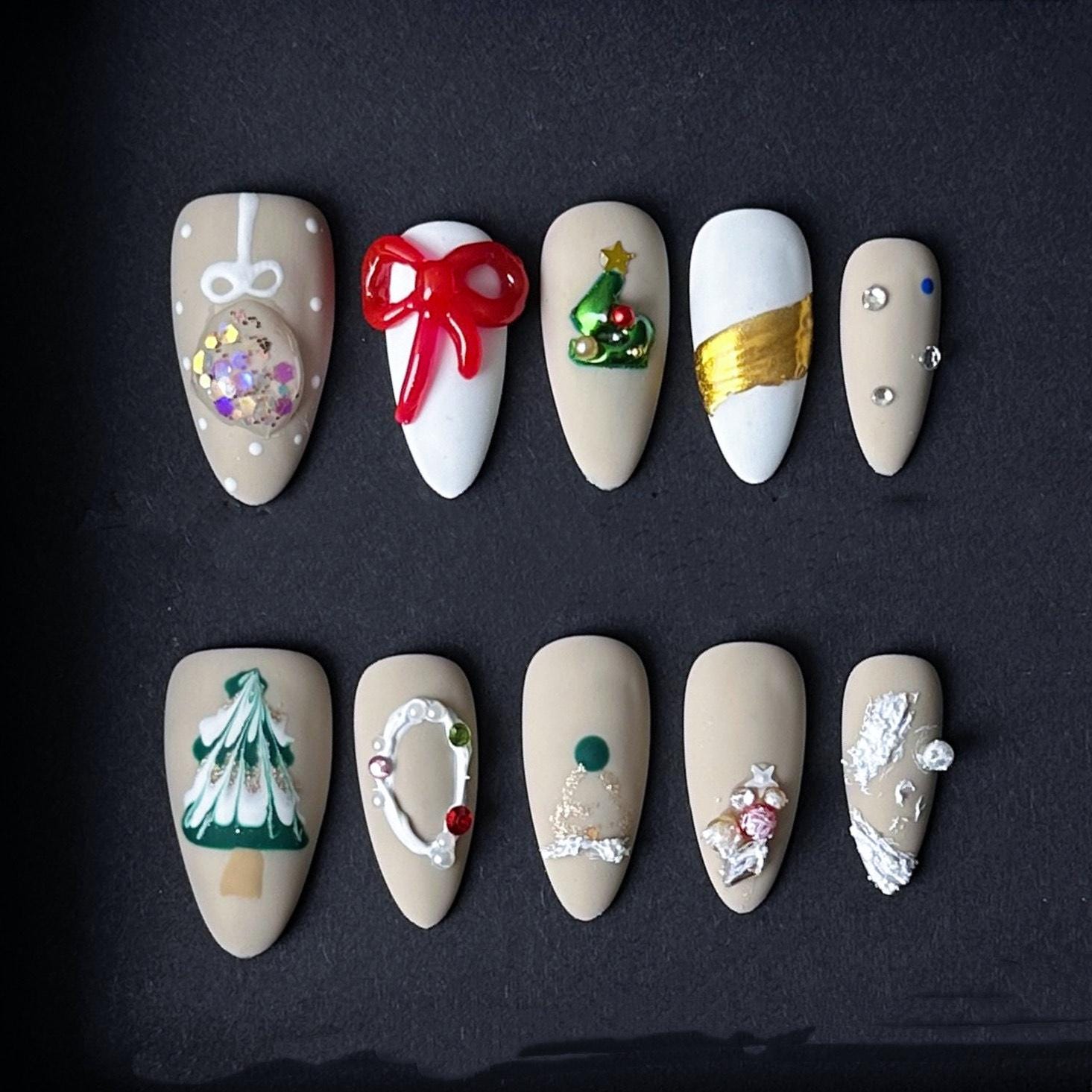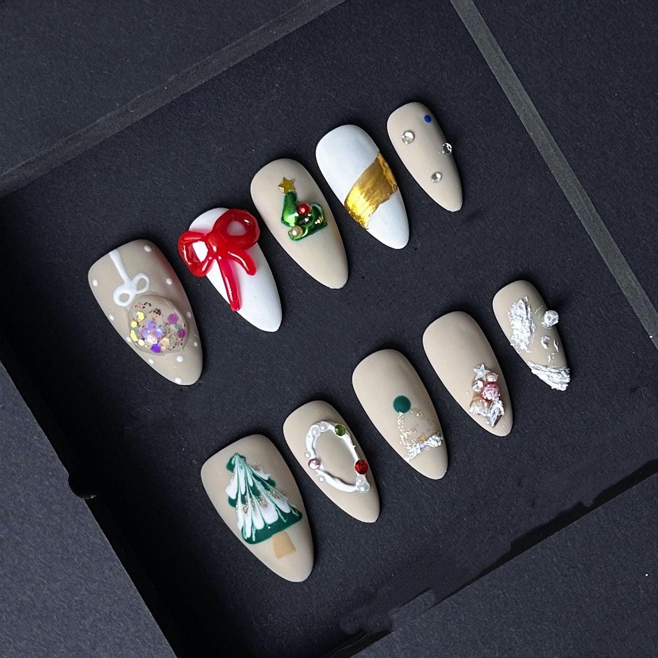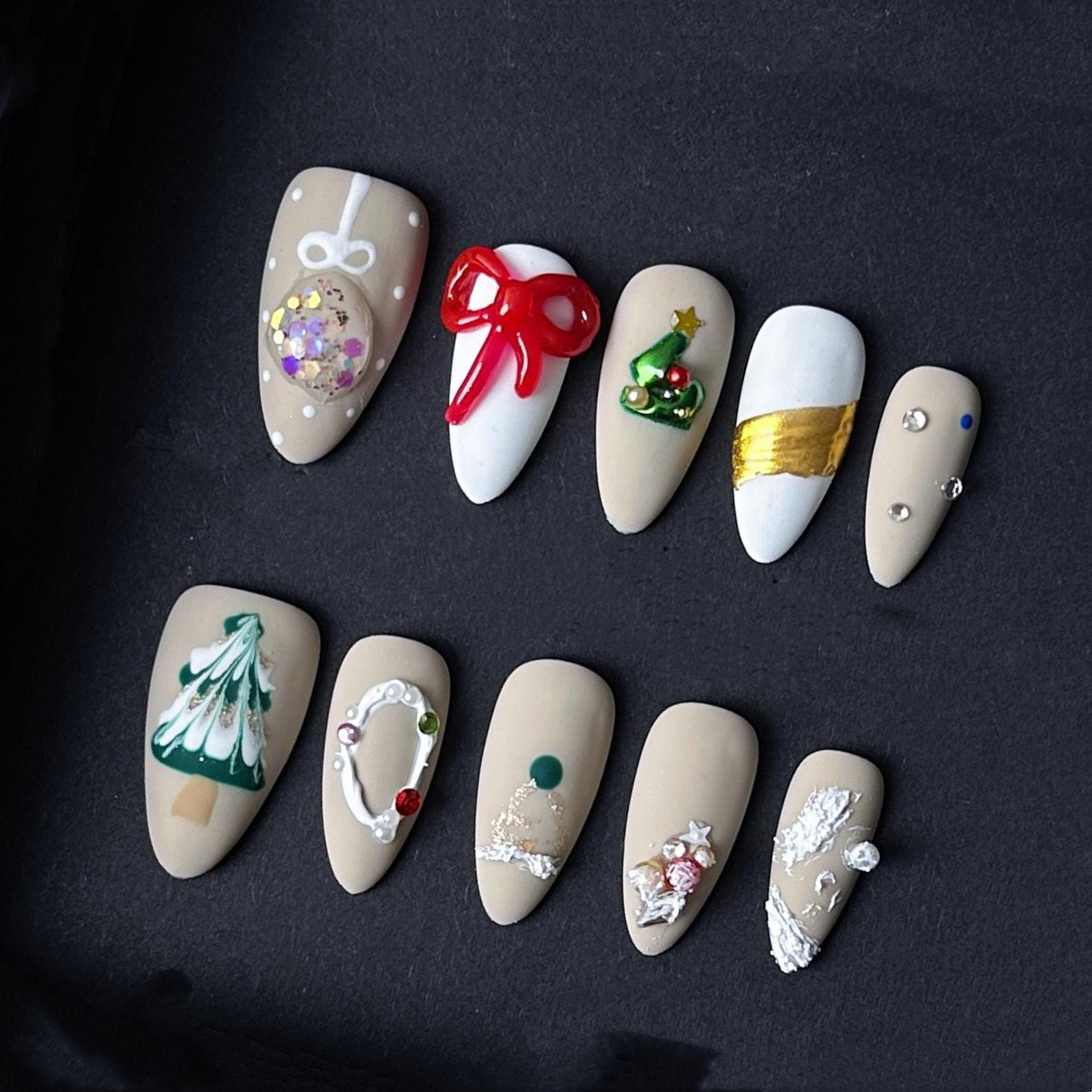 Celebrate the magic of the season with this stunning set of matte Christmas-themed press-on nails. Featuring neutral beige and ivory bases, each nail is adorned with charming 3D holiday icons—like gift bows, ornaments, sparkling gold ribbons, decorated Christmas trees, and snowy textures. Subtle sparkle and hand-crafted details bring this festive set to life while maintaining a modern matte finish. Whether you're dressing up for a holiday party or cozying in with cocoa, these nails are the perfect merry accent for winter celebrations.
