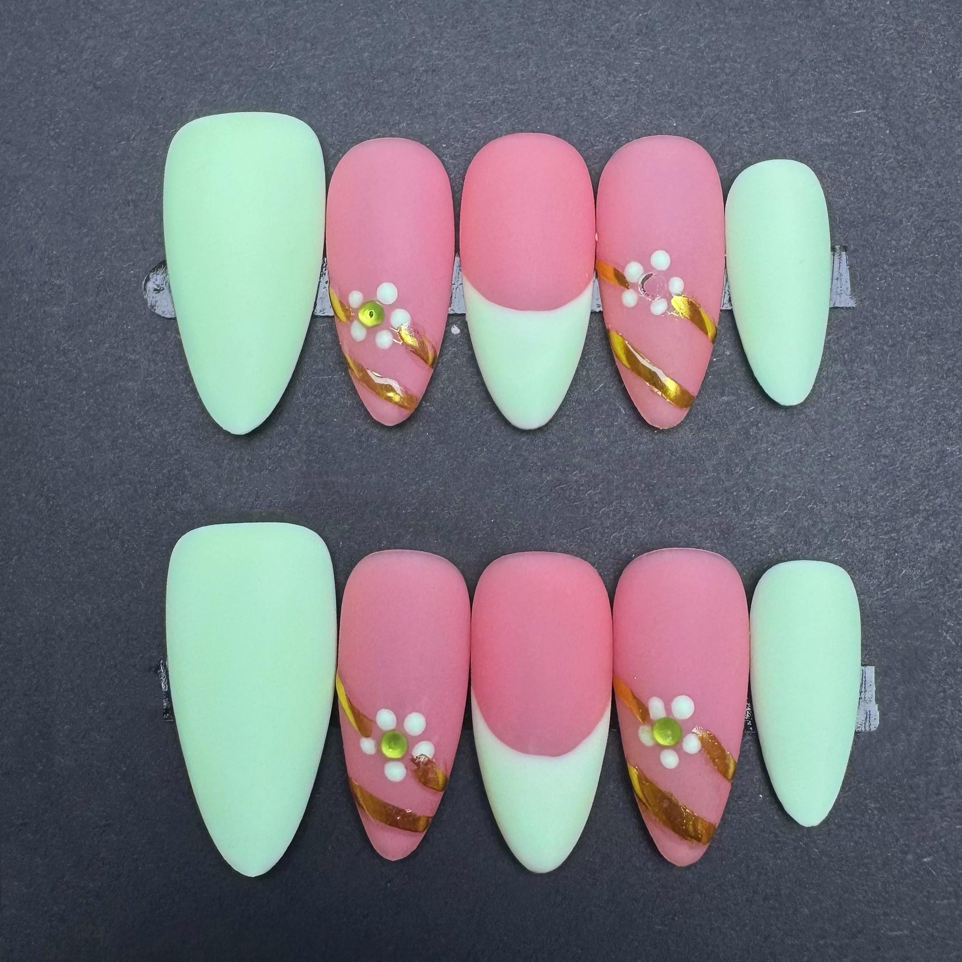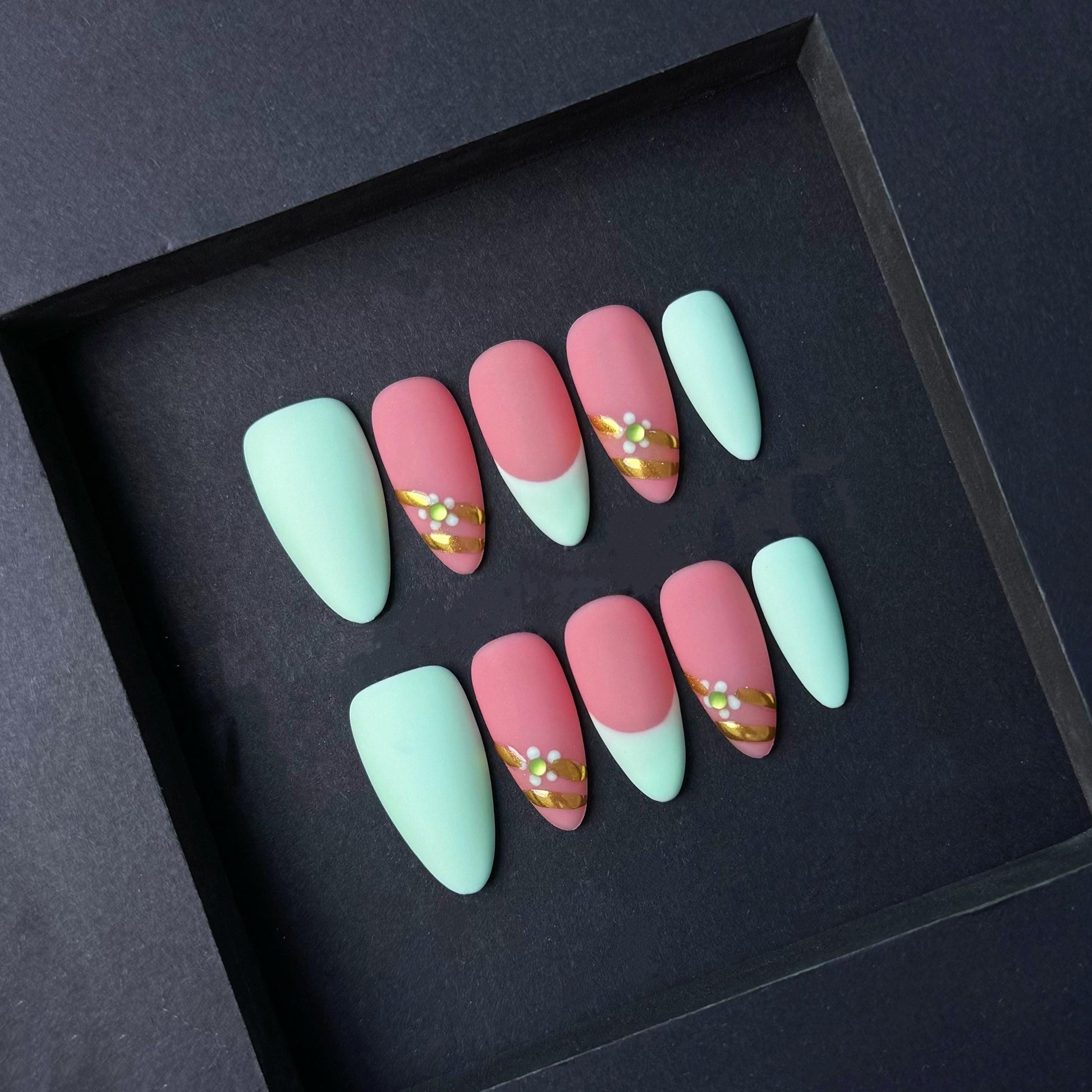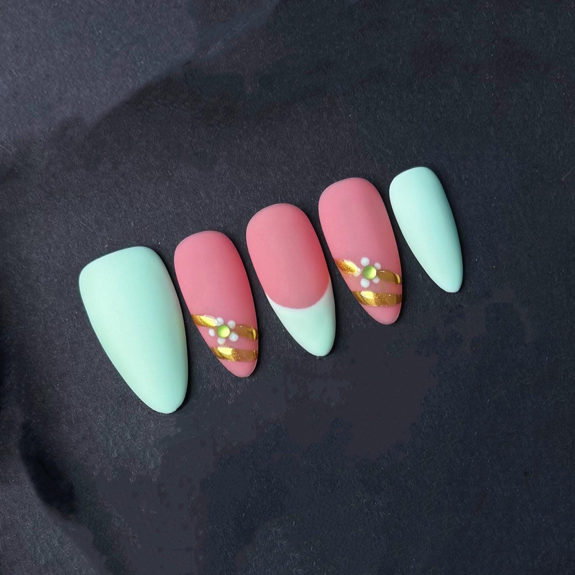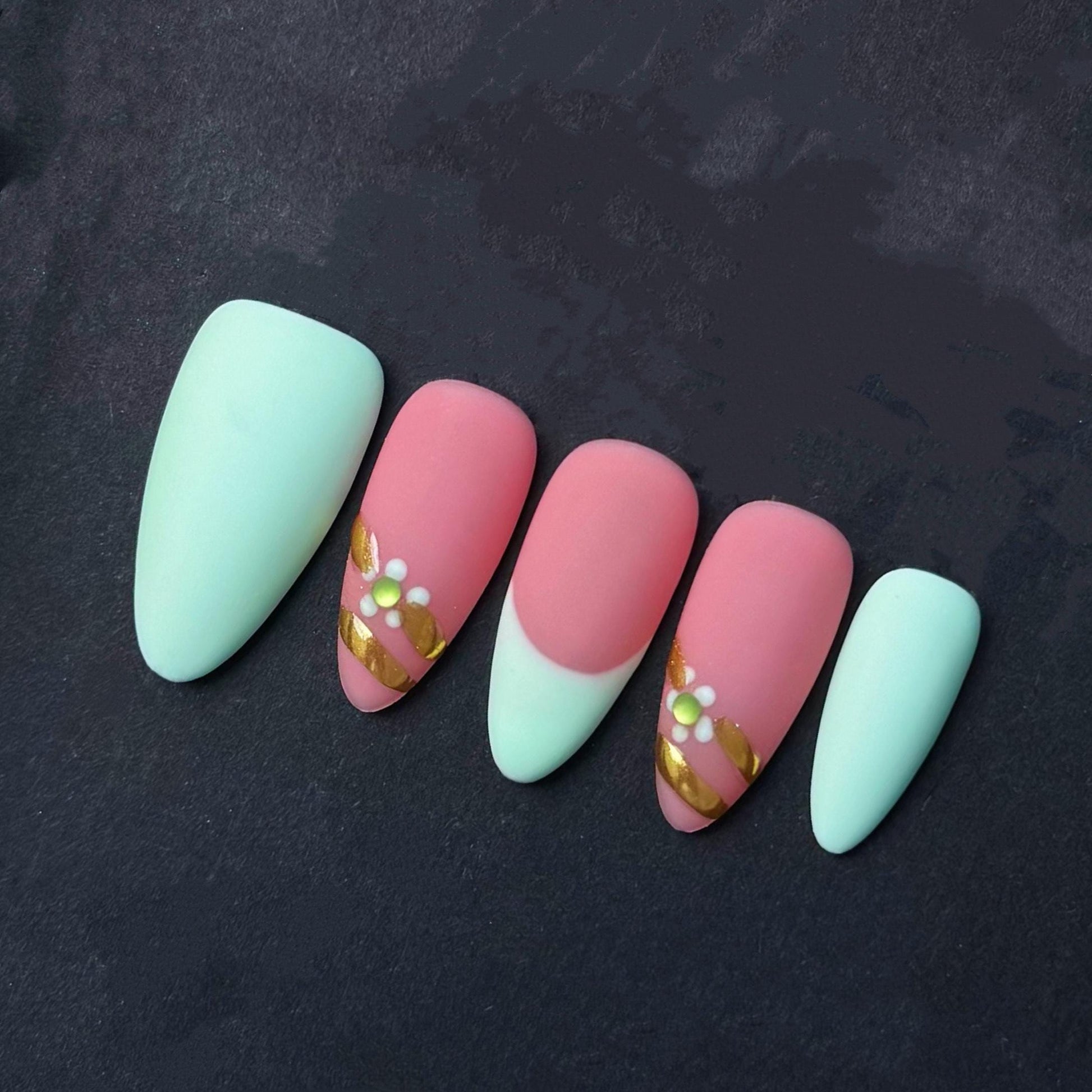 This matte press-on nail set radiates soft spring charm with its delicate combination of mint green and peachy pink tones. The alternating design features full mint nails, two-toned French tips, and floral accent nails adorned with miniature white daisies, gold foil swirls, and subtle 3D bead embellishments. The matte finish gives a velvety, refined look, perfect for seasonal events, garden parties, or a refreshing everyday style. Lightweight, reusable, and easy to apply, this set delivers fresh elegance in every detail.
