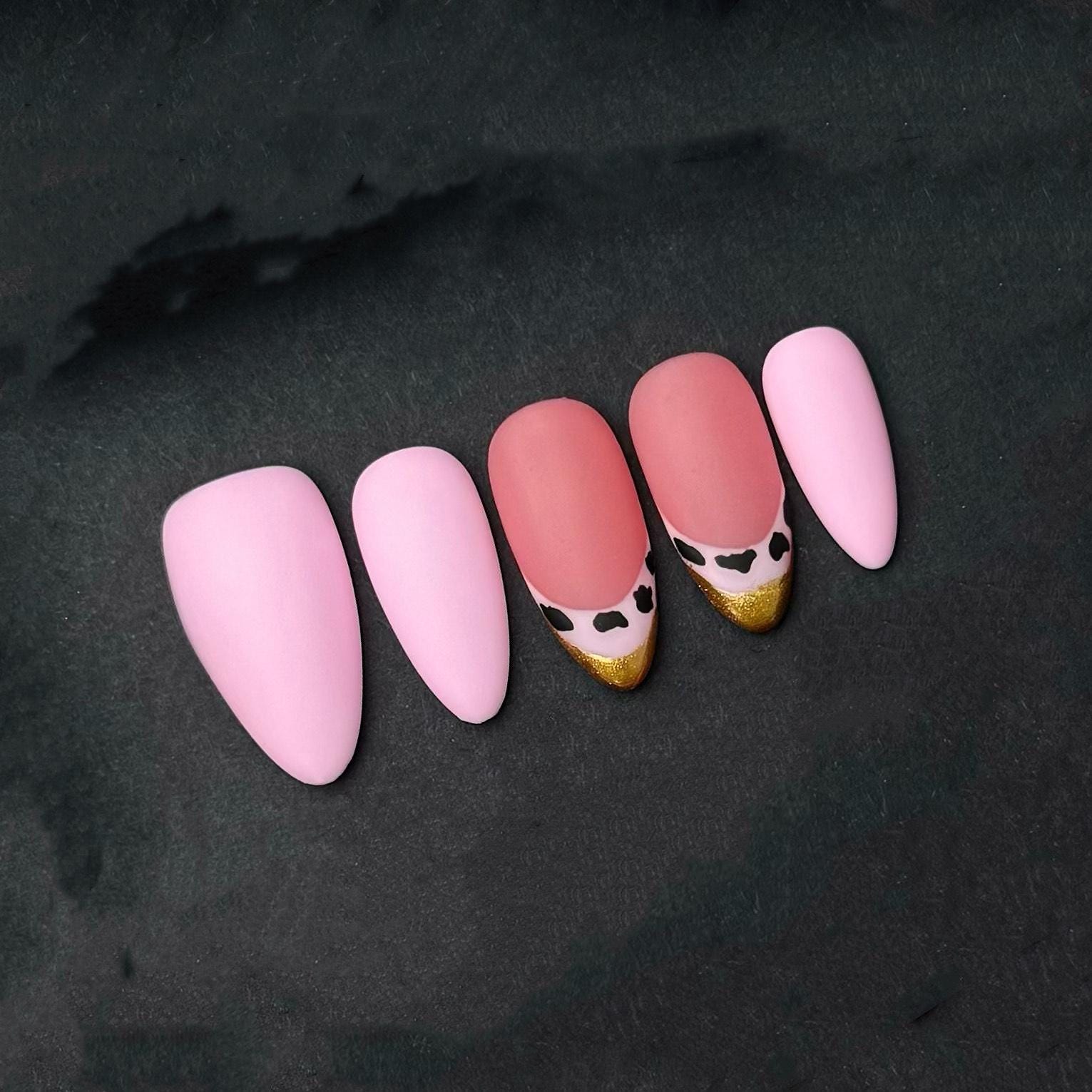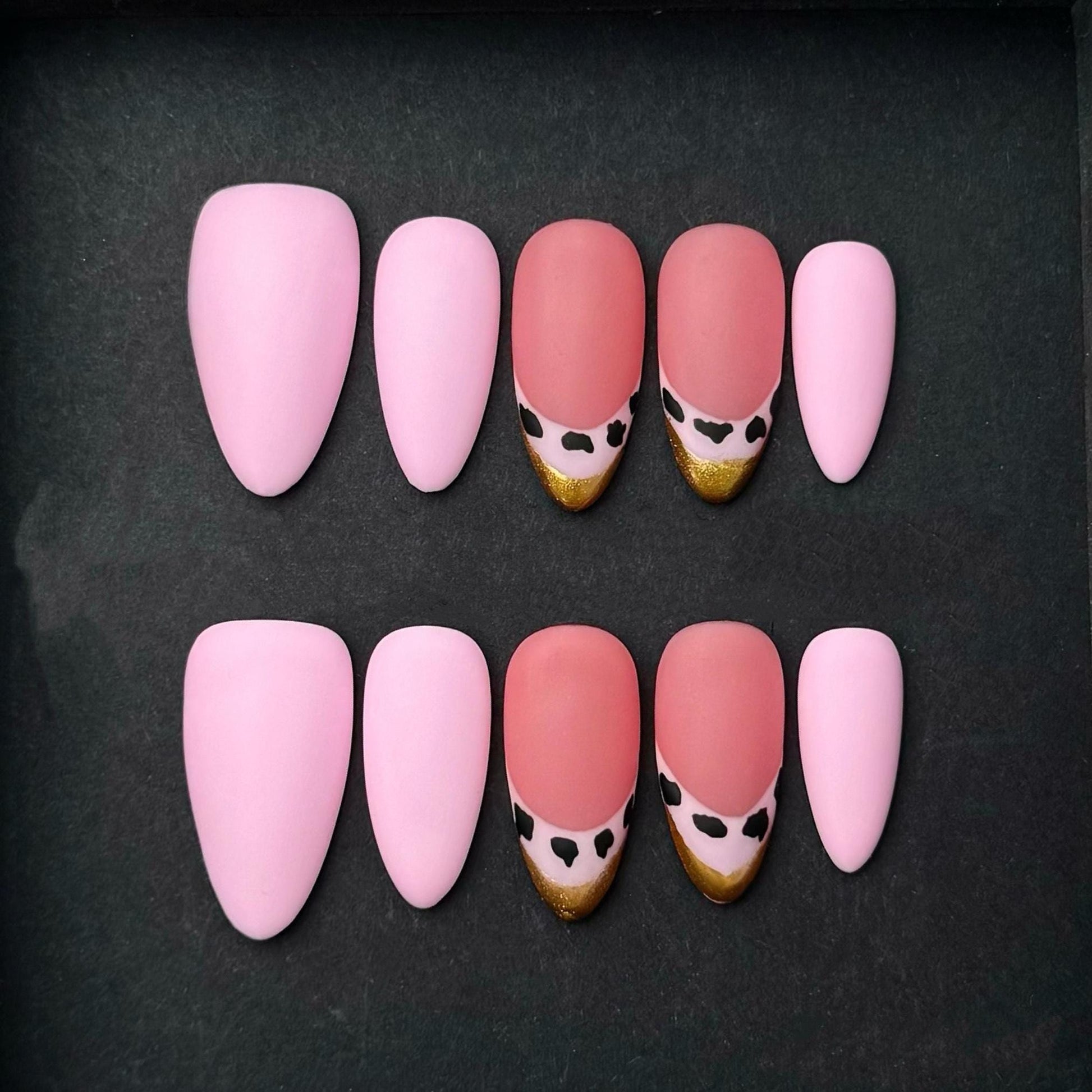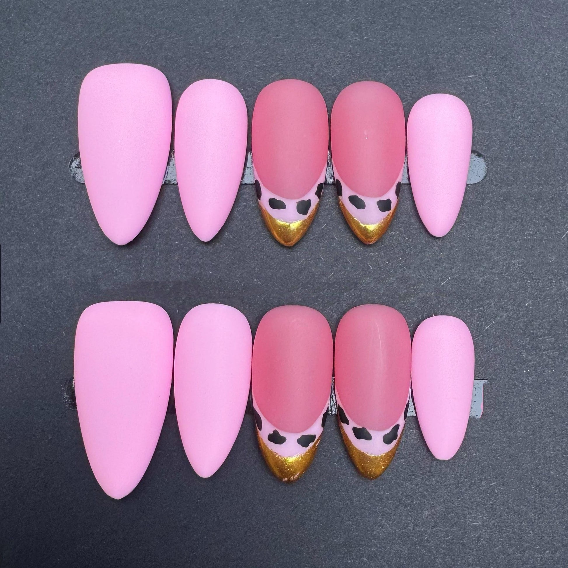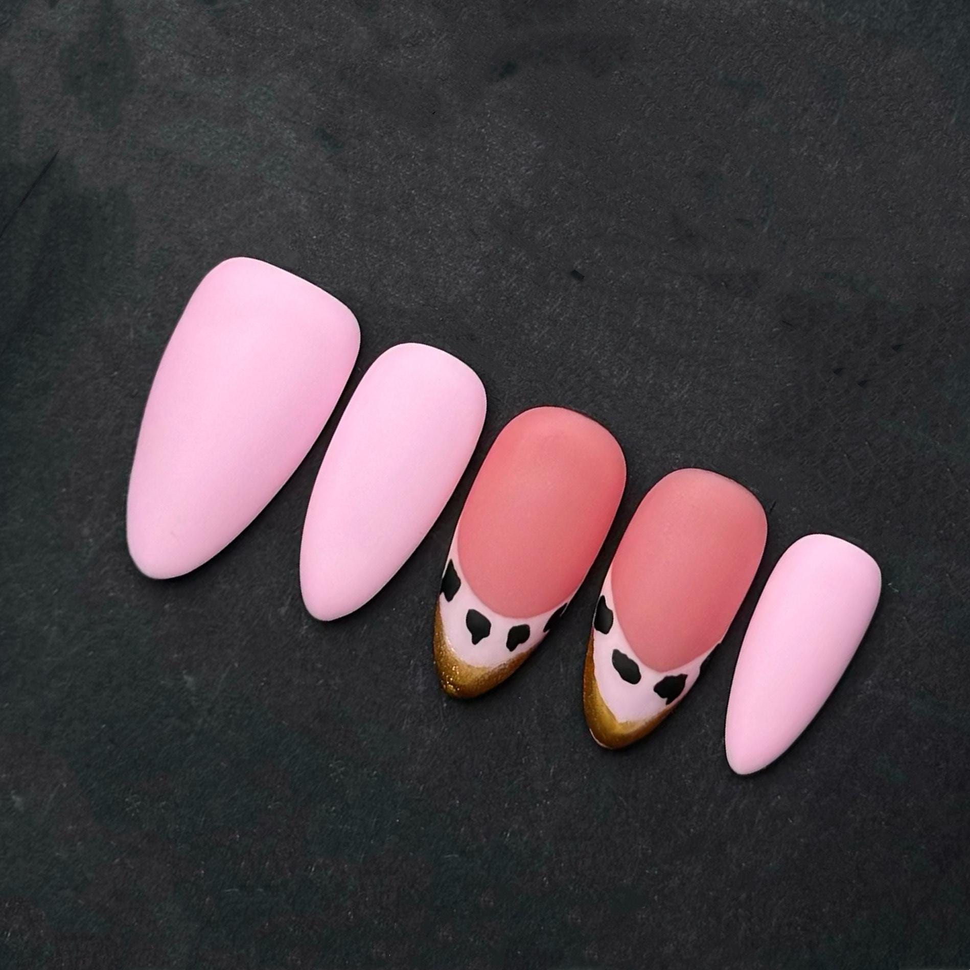 Turn heads with this edgy yet playful press-on nail set blending soft matte pink with bold leopard print accents. Featuring alternating nails in pastel pink and deeper rose pink, the standout detail is the gold-tipped French design with a black leopard pattern overlay — giving each fingertip a pop of personality. Perfect for those who love a mix of sweet and wild. Lightweight and reusable, these nails offer easy salon-quality style with fierce feminine flair.