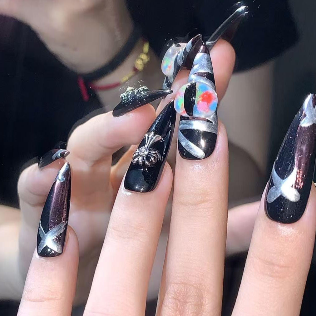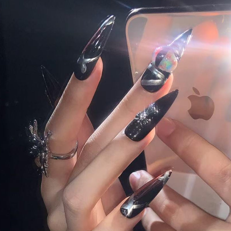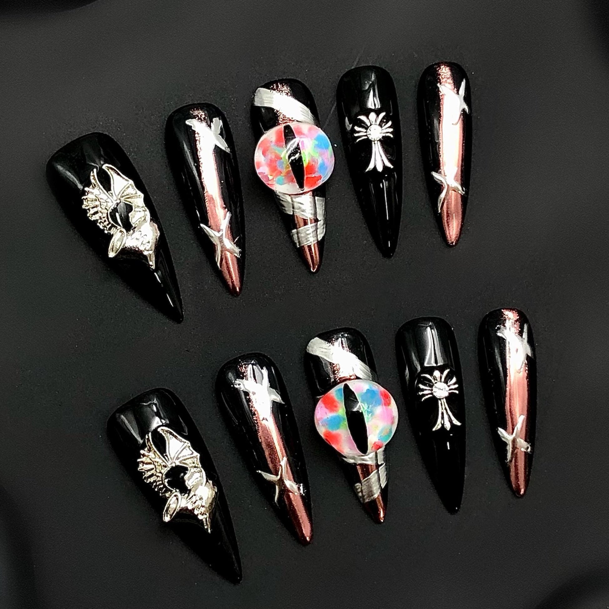 medium stiletto press on nails glue on black chrome gothic 3d metallic holographic edgy spiked avant garde nails rose gold high fashion arty