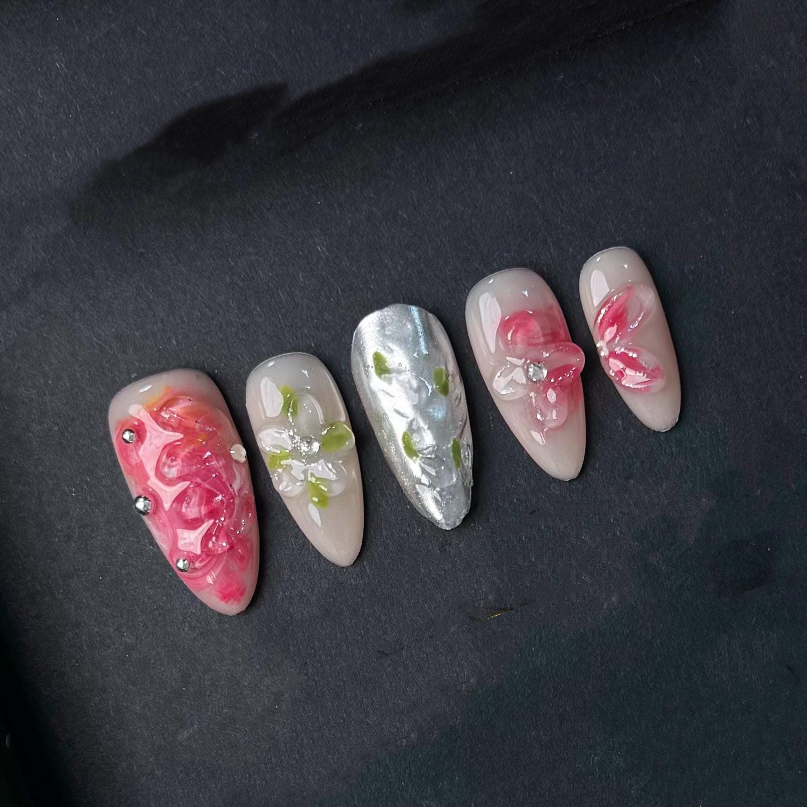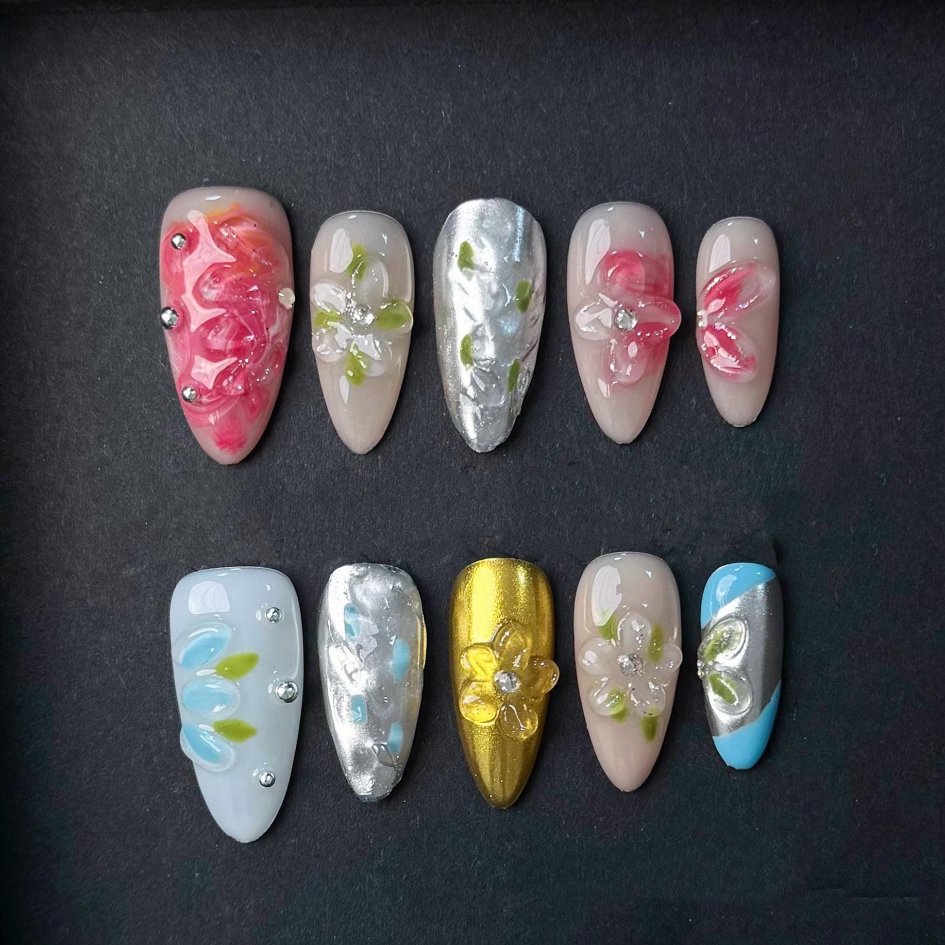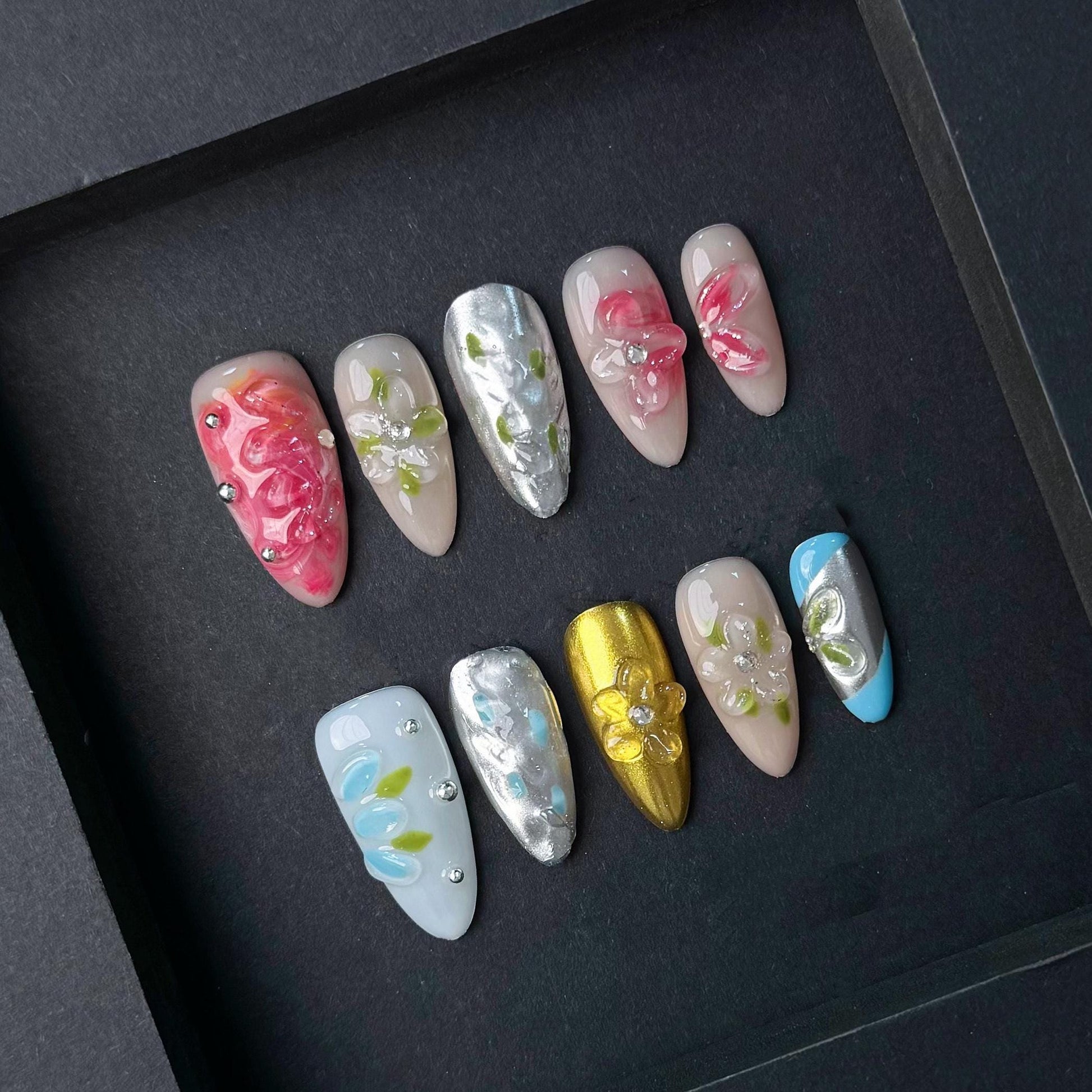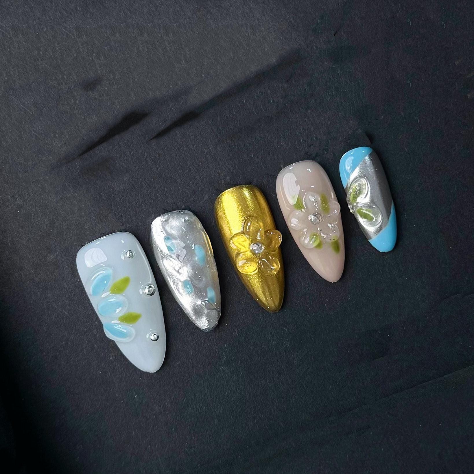 This elegant and playful nail set blends soft neutrals with bold metallics and 3d floral accents in shades of pink blue green gold and silver. A perfect combination of delicate garden charm and high shine glam for spring events or artistic everyday wear.
