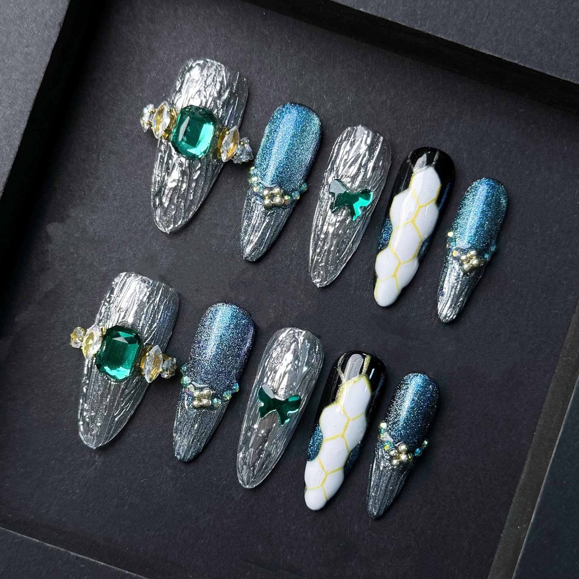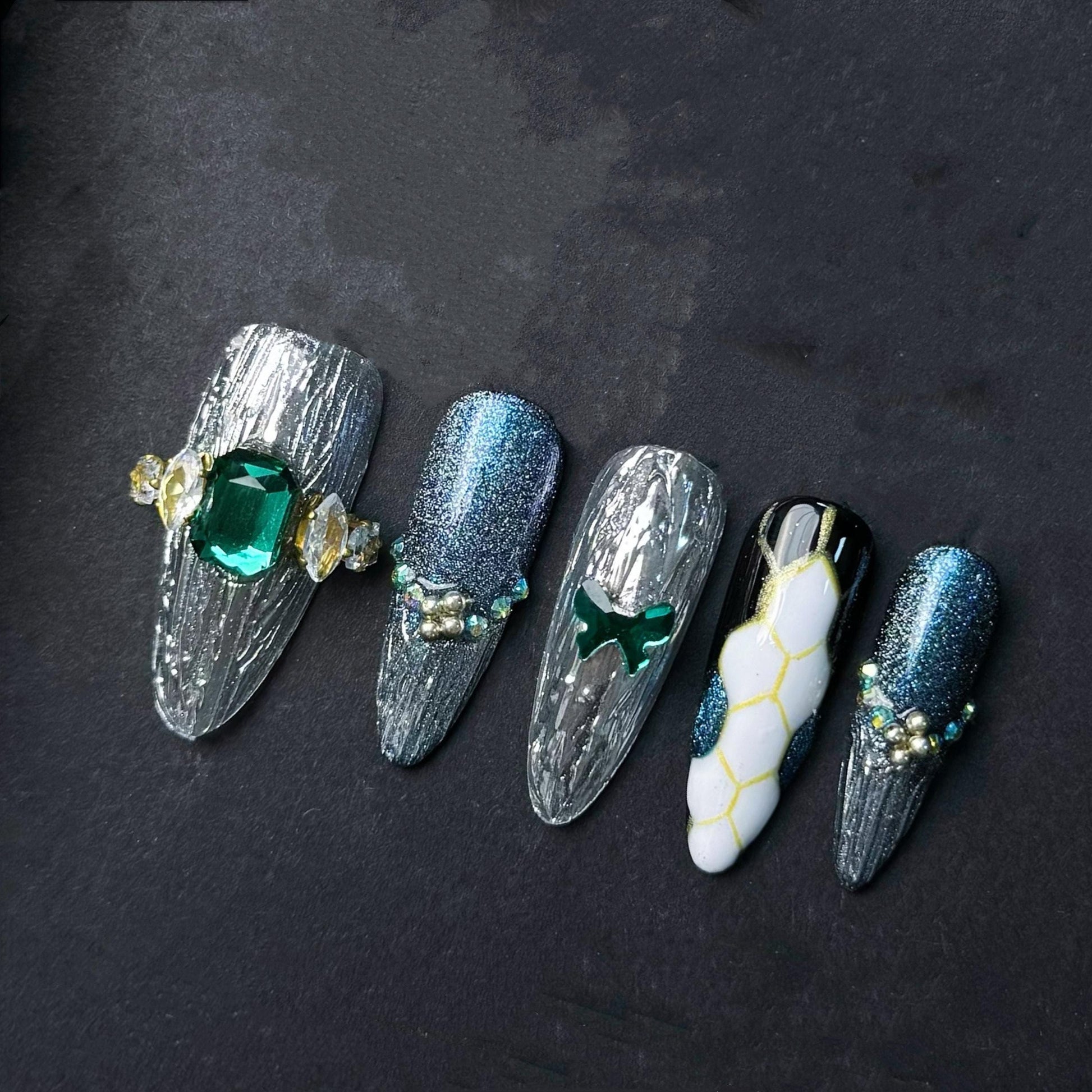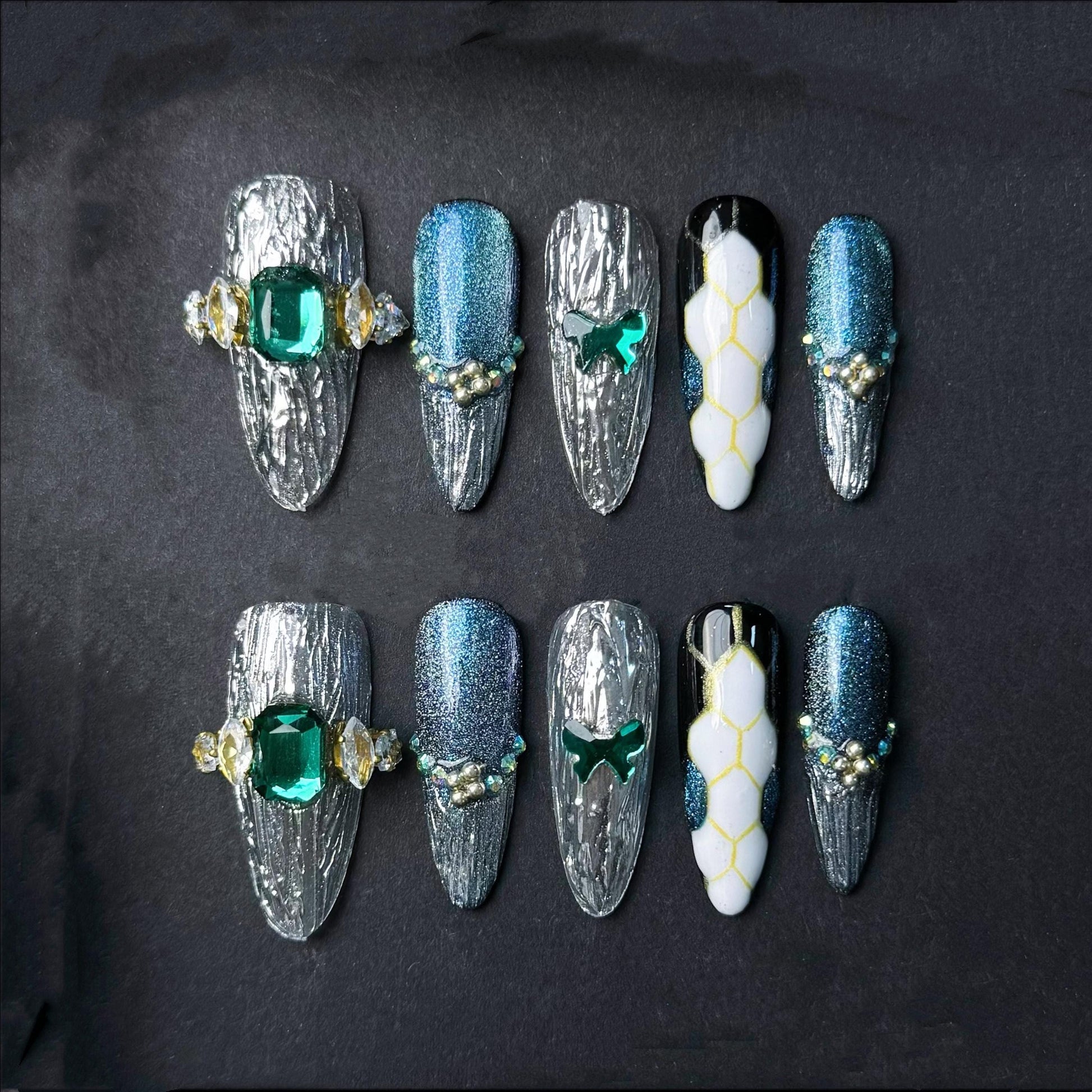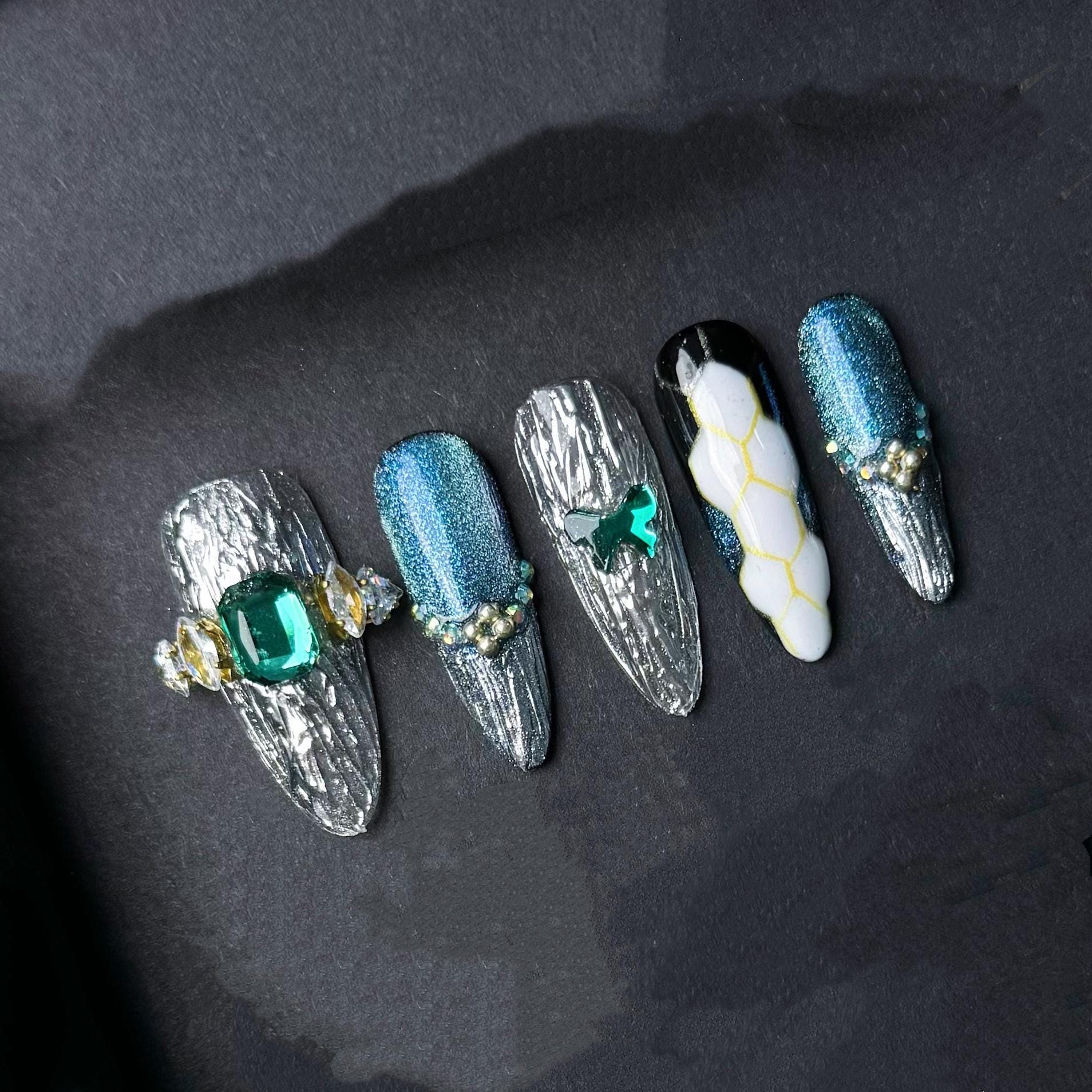 Command attention with this futuristic glam press-on nail set featuring a stunning blend of textures and sparkle. The set includes cracked chrome silver designs with emerald green gem accents metallic blue glitter shimmer and a unique white honeycomb snake-skin print. Perfect for bold fashionistas who crave statement nails with luxury detail.