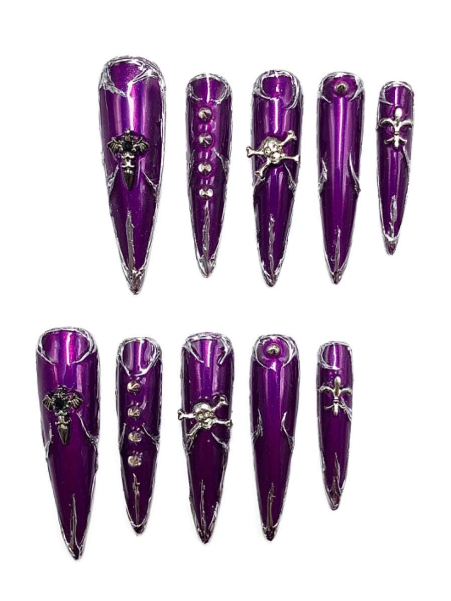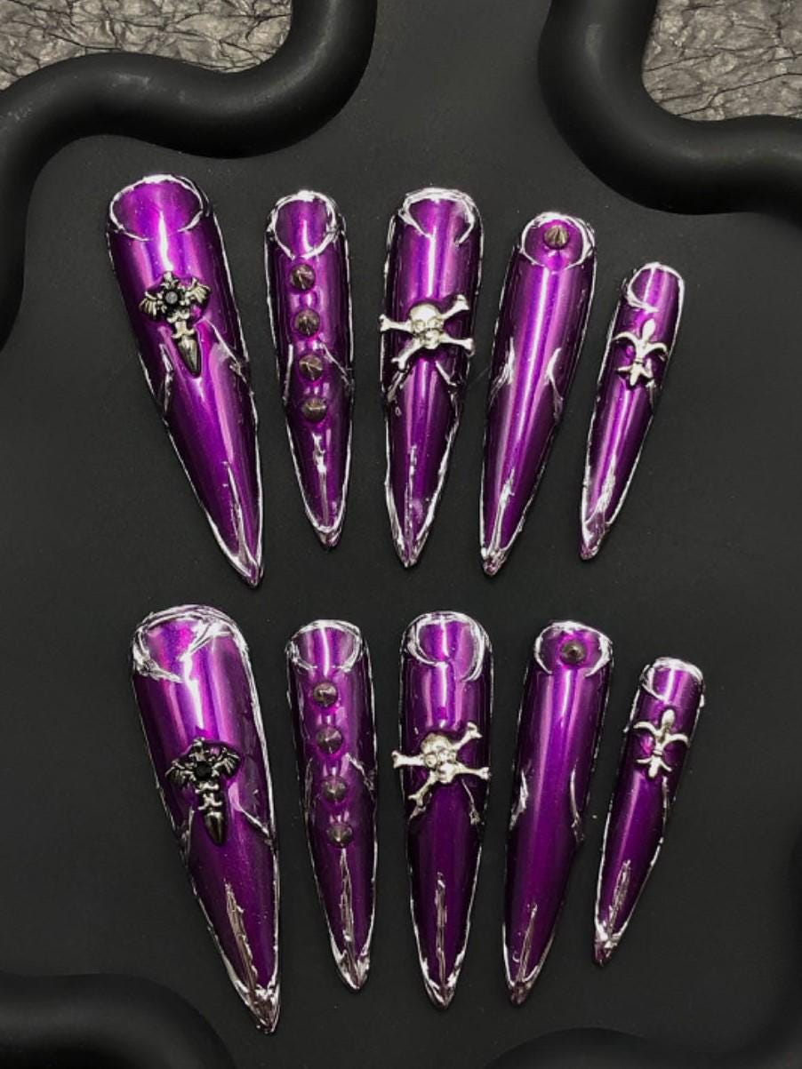 Metallic Gothic Press-On Nails – Purple Chrome with Skulls & Cross Charms Manicure glue on artificial fake faux reusable trendy nail