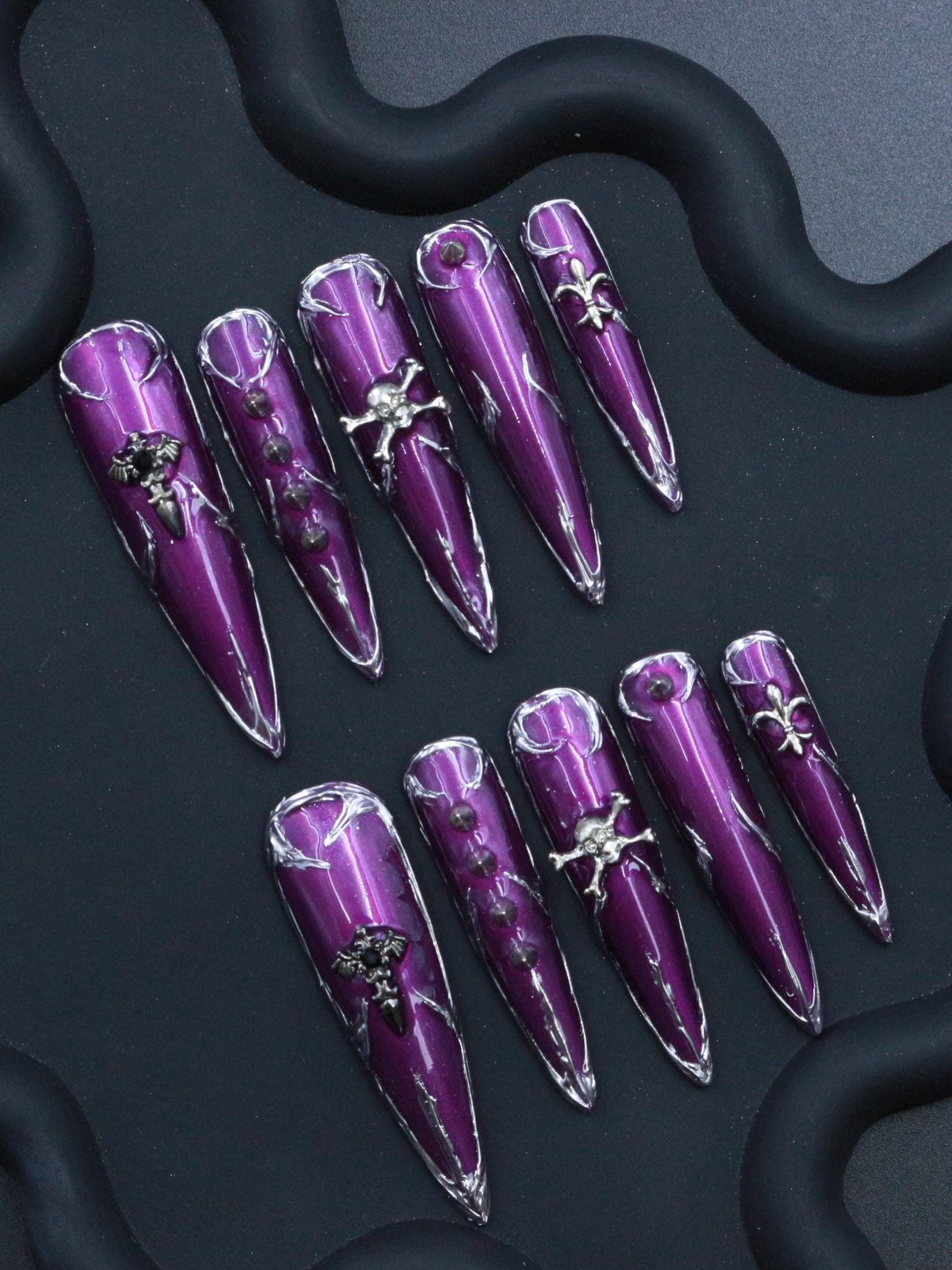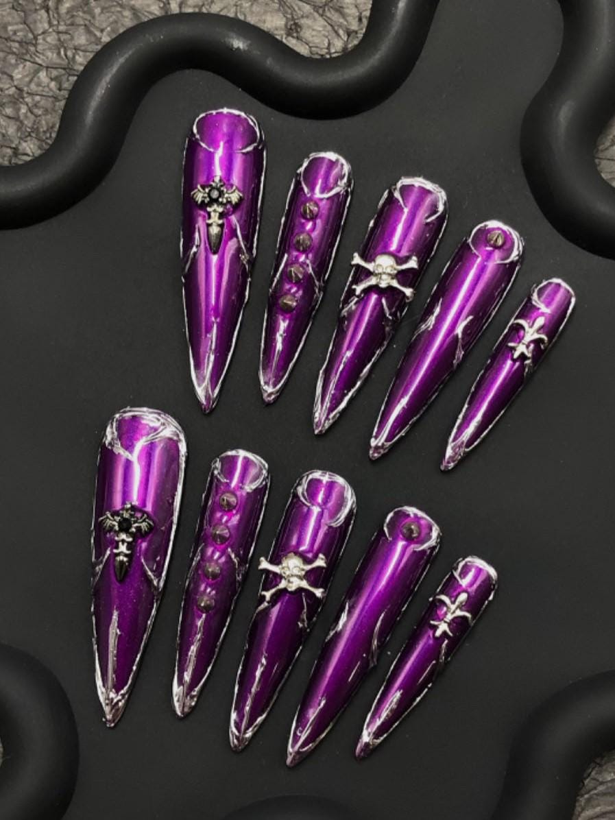 Channel fierce and fearless vibes with these Metallic Gothic press-on nails. Designed with high-shine purple chrome, distressed silver edging, and adorned with skulls, spikes, and gothic cross charms, this set is perfect for edgy fashion lovers. Long and dramatic, these stiletto nails make a bold statement for parties, concerts, or everyday rebellion.