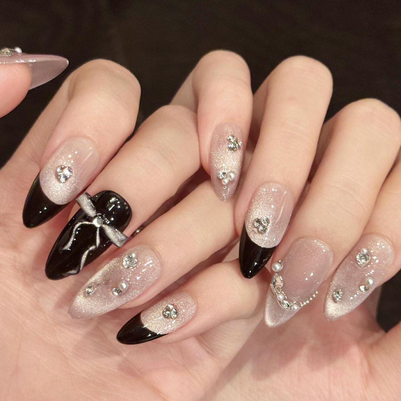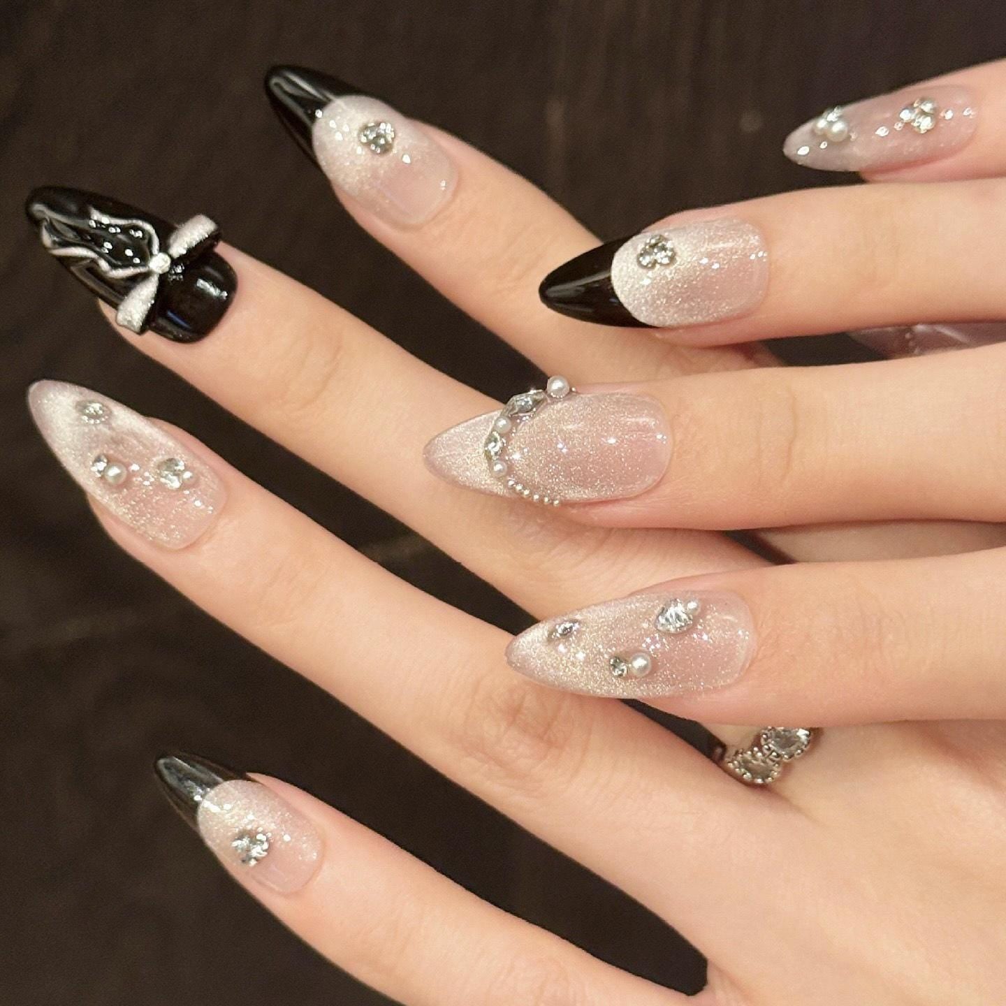 Midnight Glam Press-On Nails Black & Silver Sparkle short almond Bow Accent glue on artificial 3d embellished studs bows elegant nail art