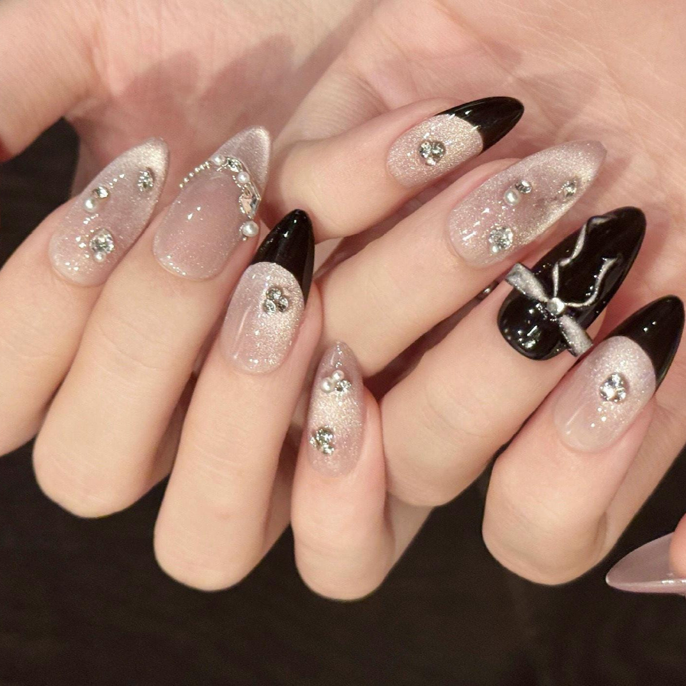 Turn heads with these dazzling midnight glam press-on nails, featuring a mix of glossy black, silver shimmer, and rhinestone-studded accents. The elegant stiletto shape and statement 3D bow design bring drama and sophistication—perfect for parties, formal events, or a bold everyday look.
