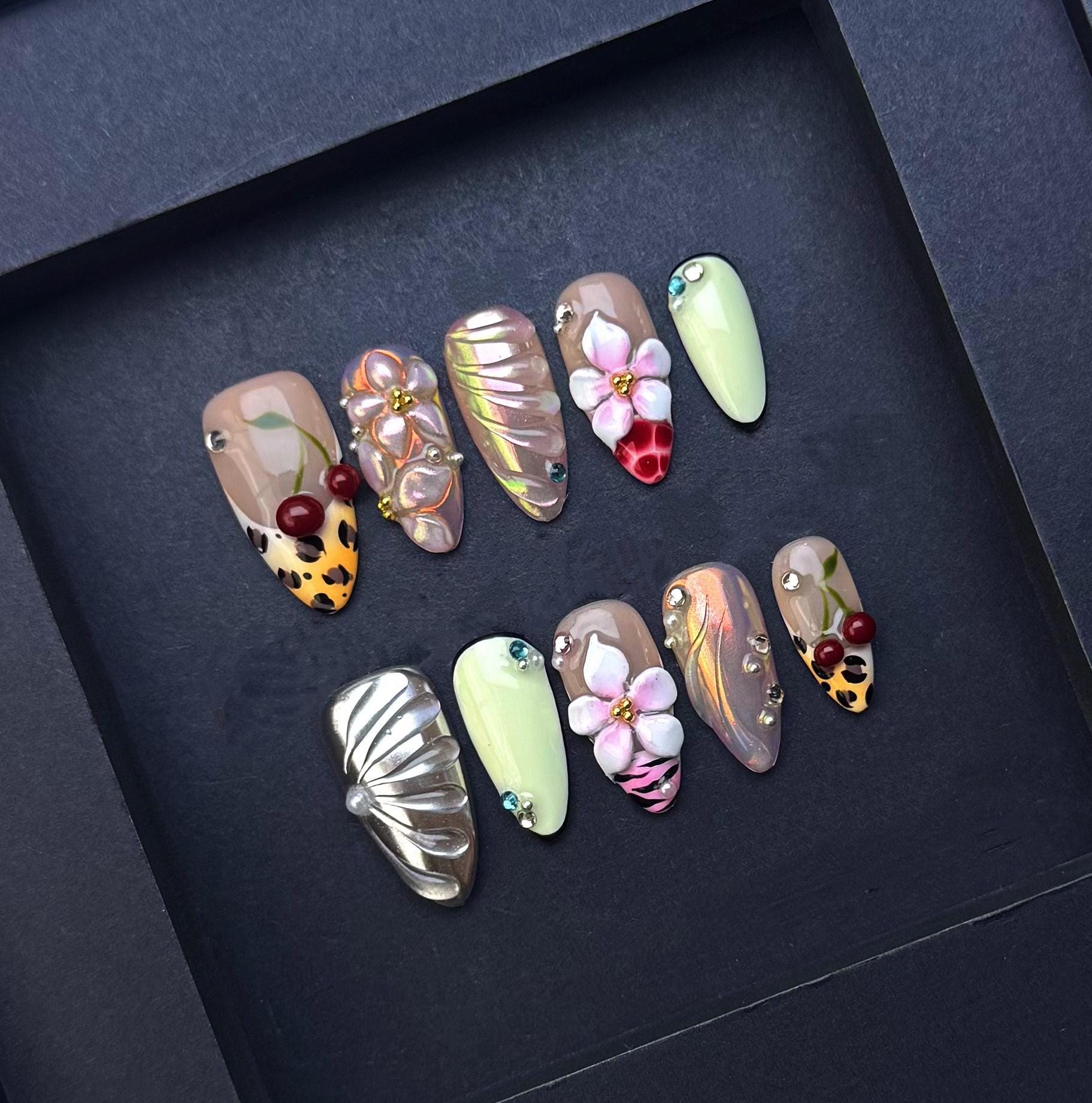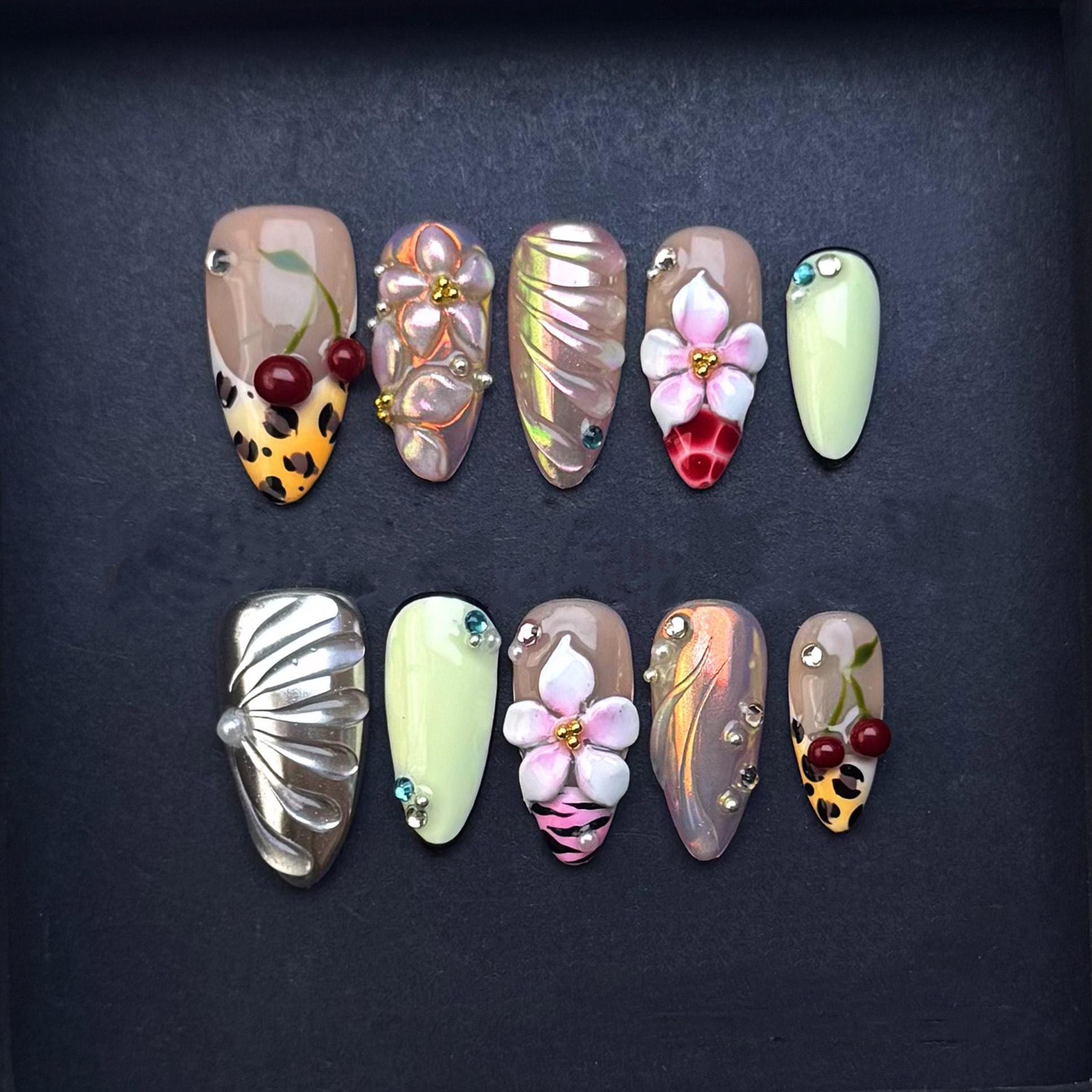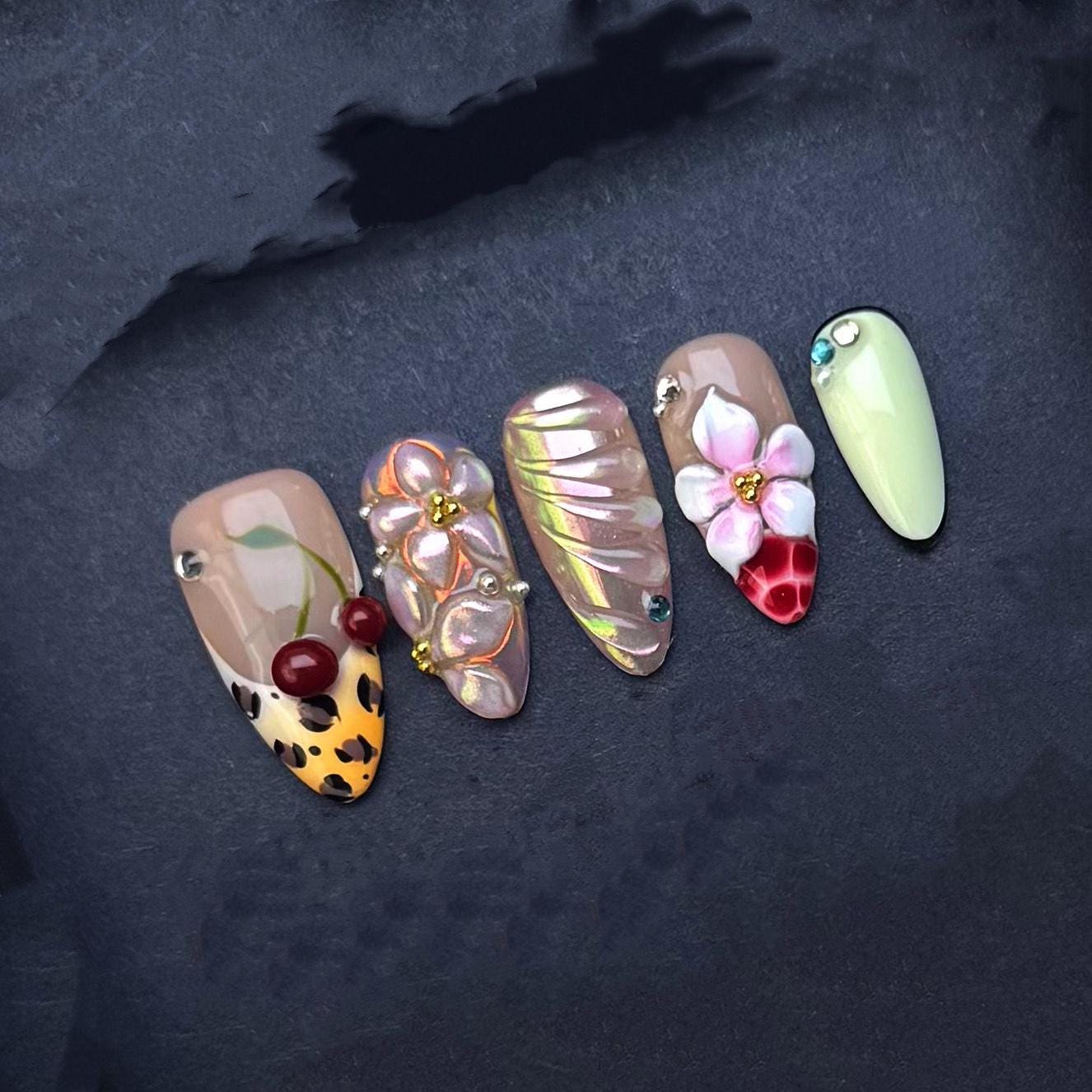 This playful and bold press on nail set features a vibrant mix of 3D cherries leopard print iridescent petals and sculpted floral accents Balanced with nude and pale green tones each nail is handcrafted with detailed embellishments metallic finishes and crystal touches for a fierce and fun statement look