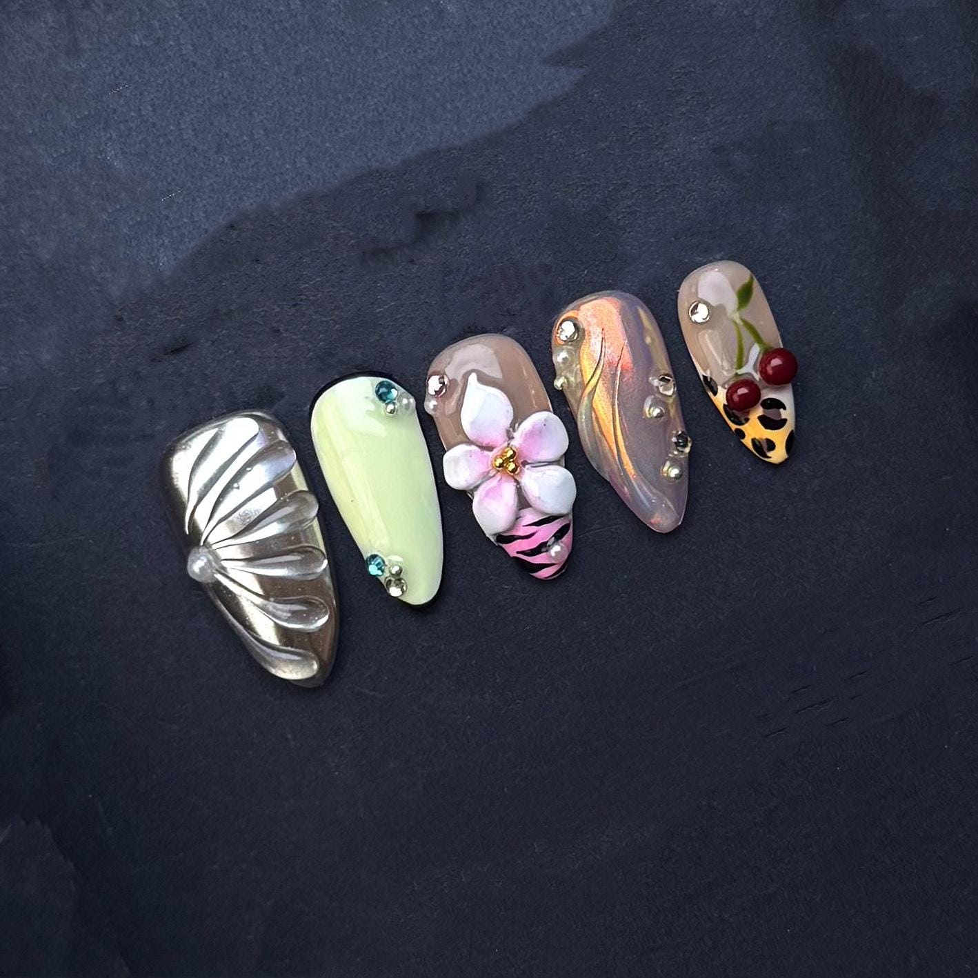 Mixed Design Press On Nails Cherries Leopard Print Flowers Metallic Accents artificial reusable fake glue on faux manicure nails trendy art