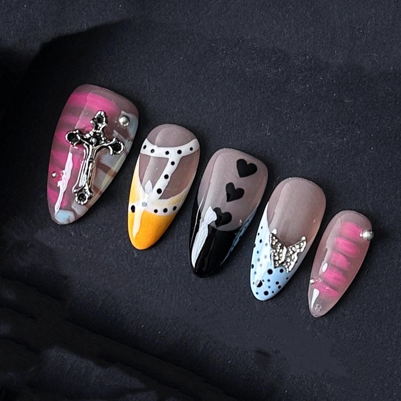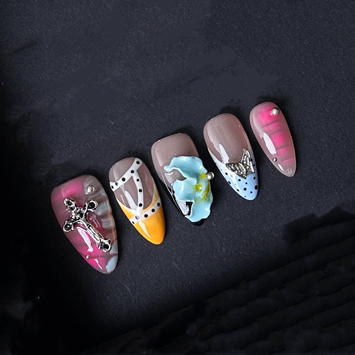 This eclectic press on nail set features a bold mix of styles including cross charms heart prints butterflies and a 3d flower Each nail offers a unique design with vibrant colors and playful details making it perfect for creative and expressive nail lovers