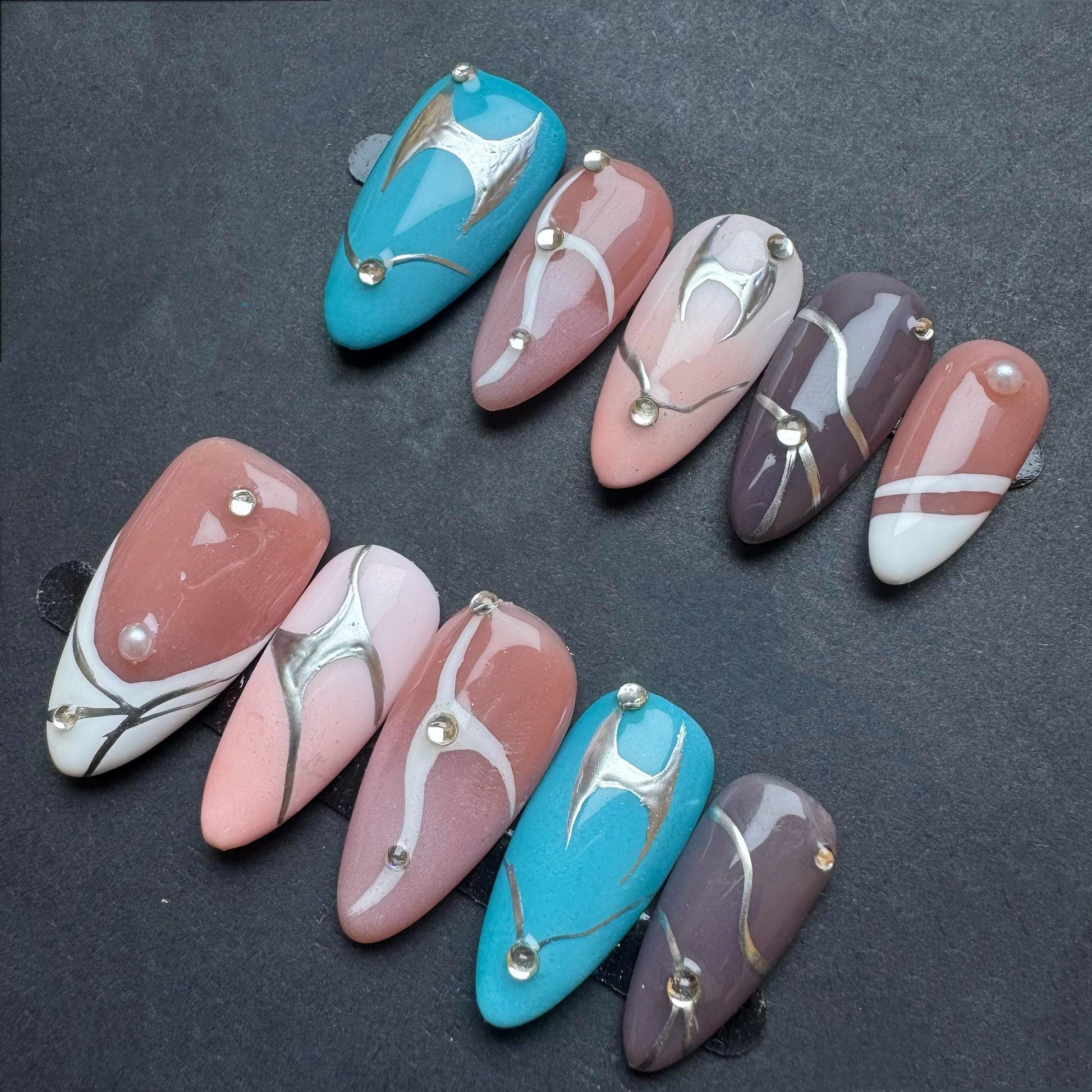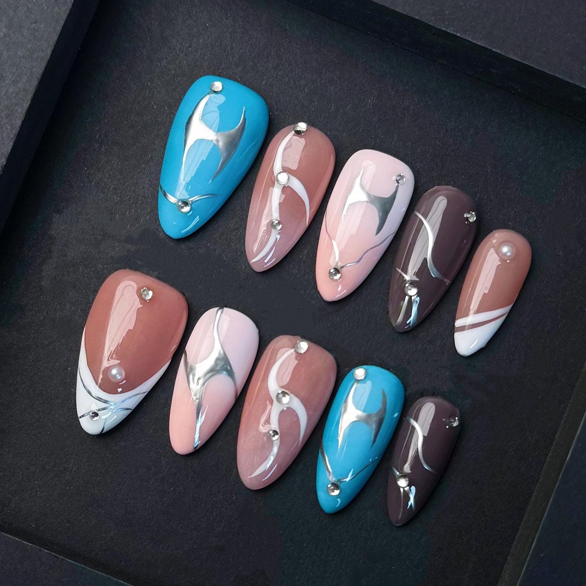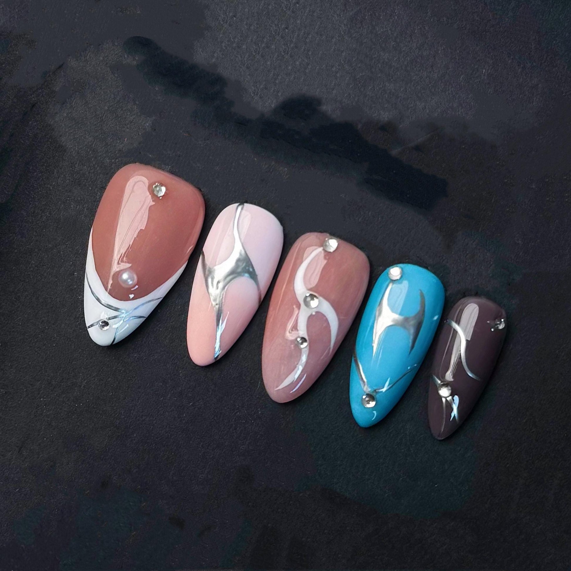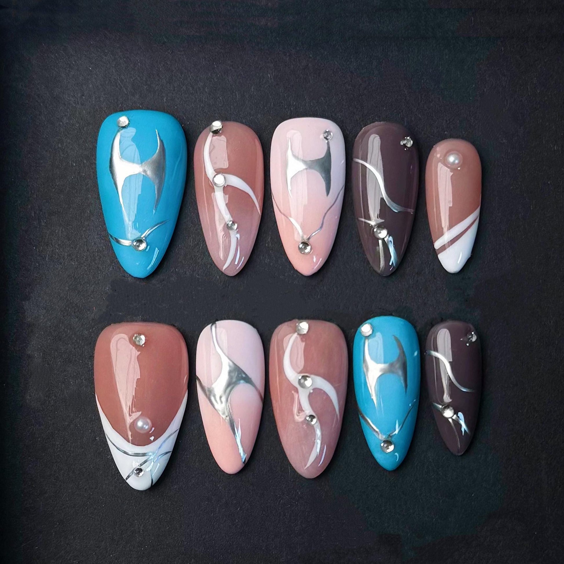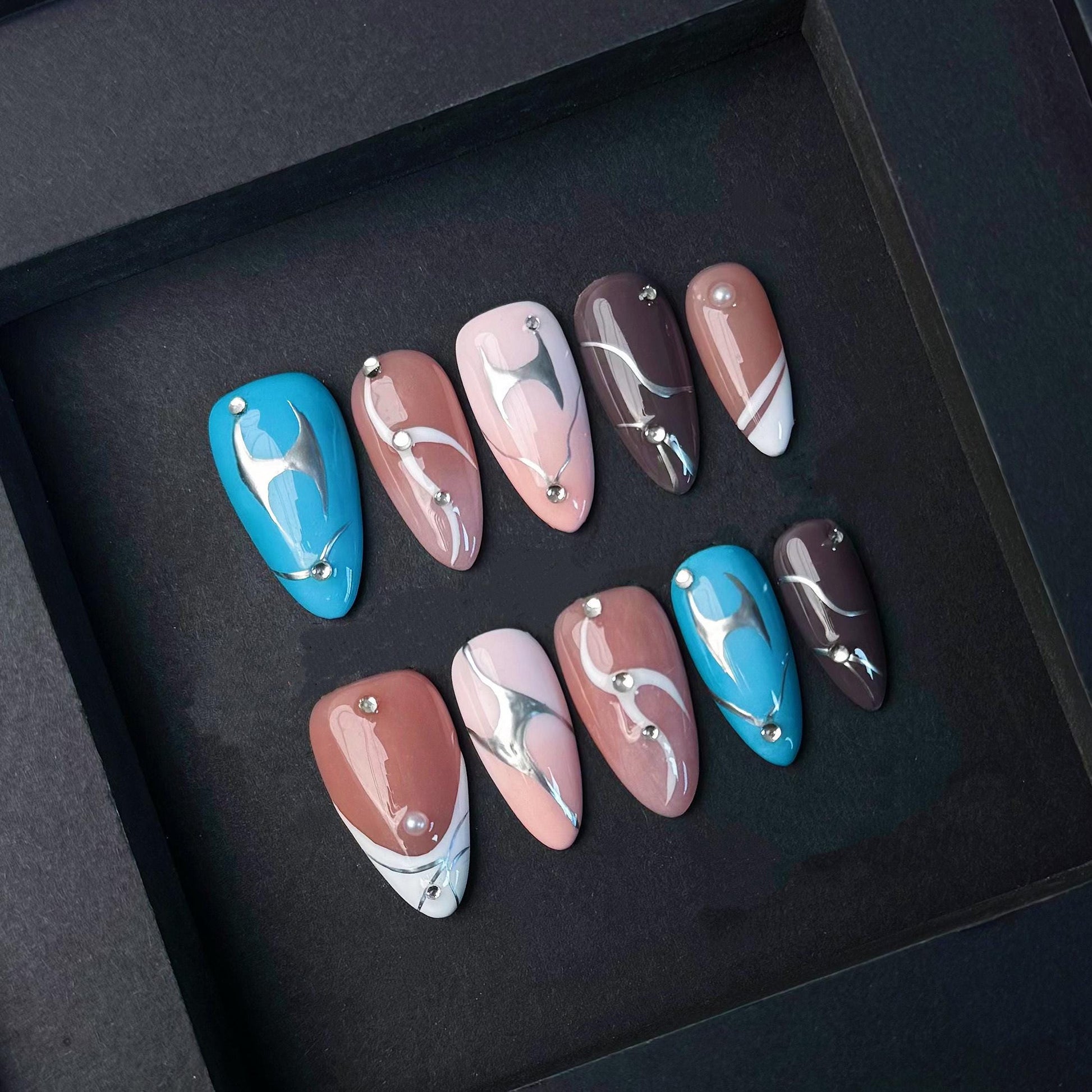 Add a sleek and artistic twist to your look with this modern press-on nail set featuring a curated blend of nude, blue, and brown tones. Each almond-shaped nail is detailed with flowing metallic chrome swirls and minimal gem accents, creating a futuristic abstract vibe. The glossy finish adds dimension while maintaining a clean, polished edge. Perfect for fashion-forward wearers who want subtle sophistication with a bold design element. Reusable, easy to apply, and ready to elevate any outfit with an understated luxe appeal.