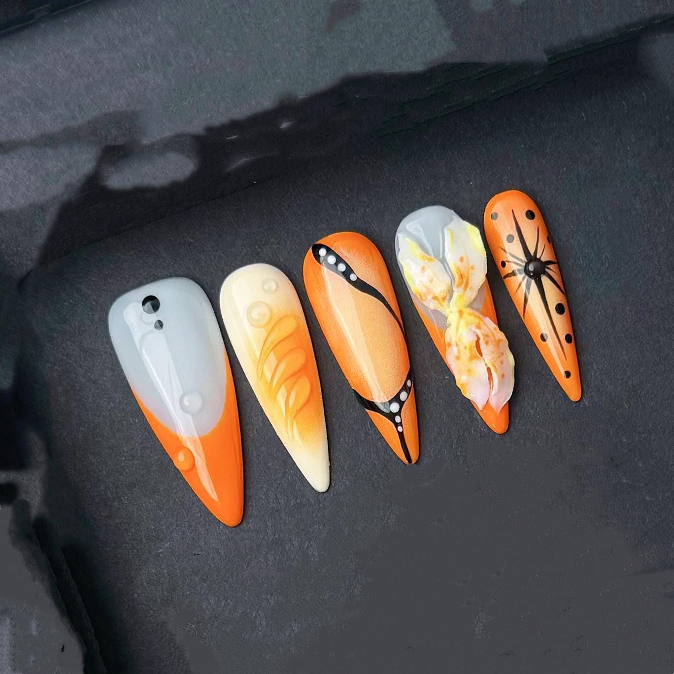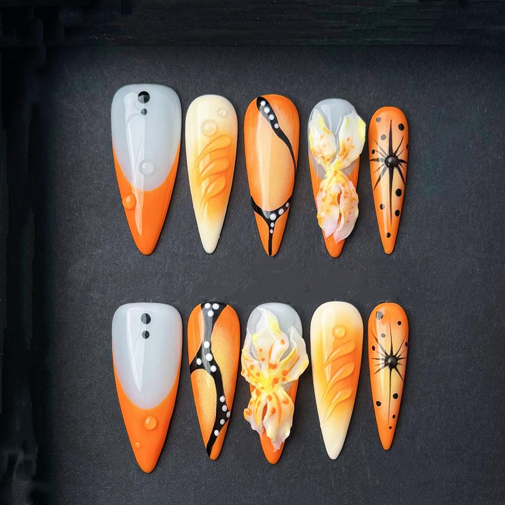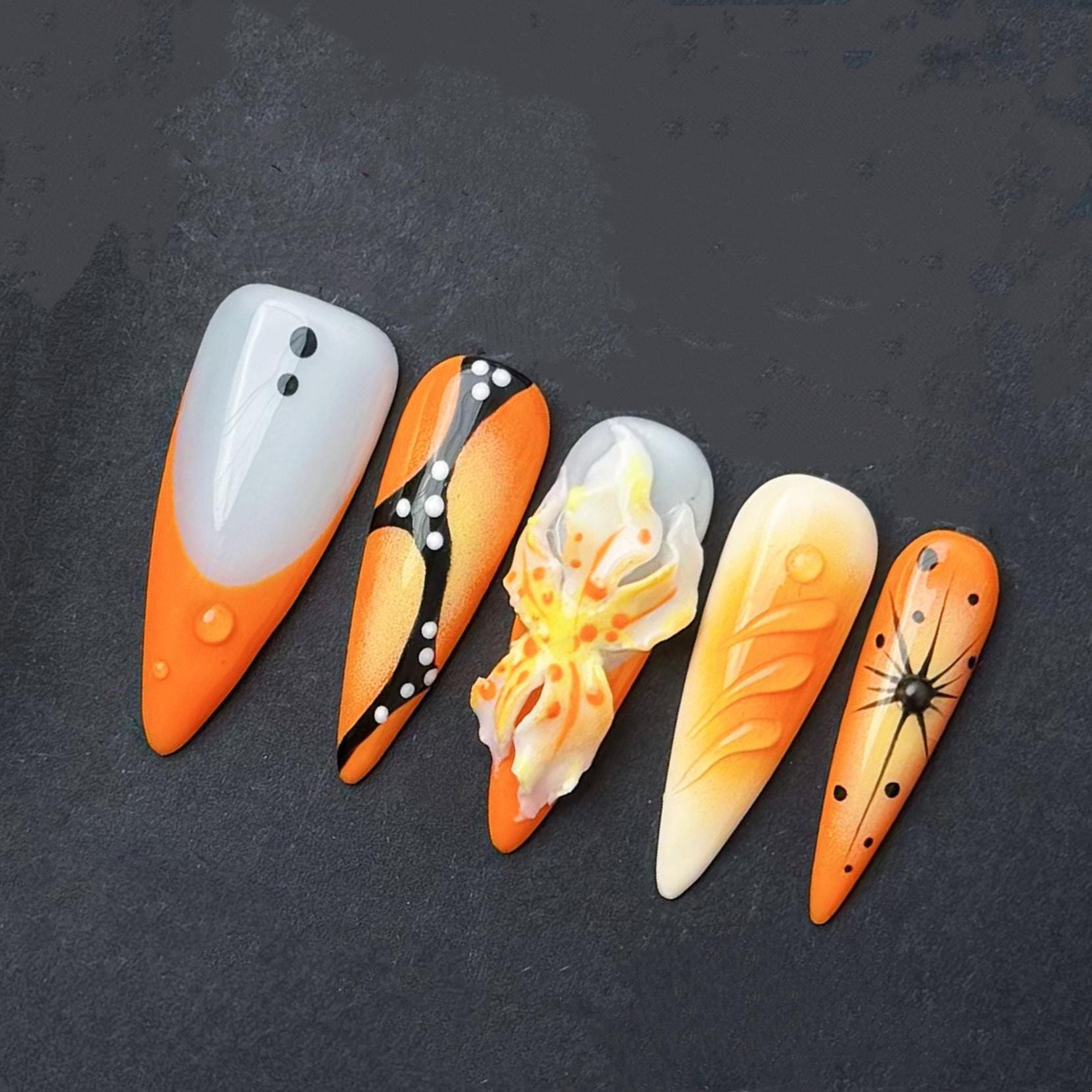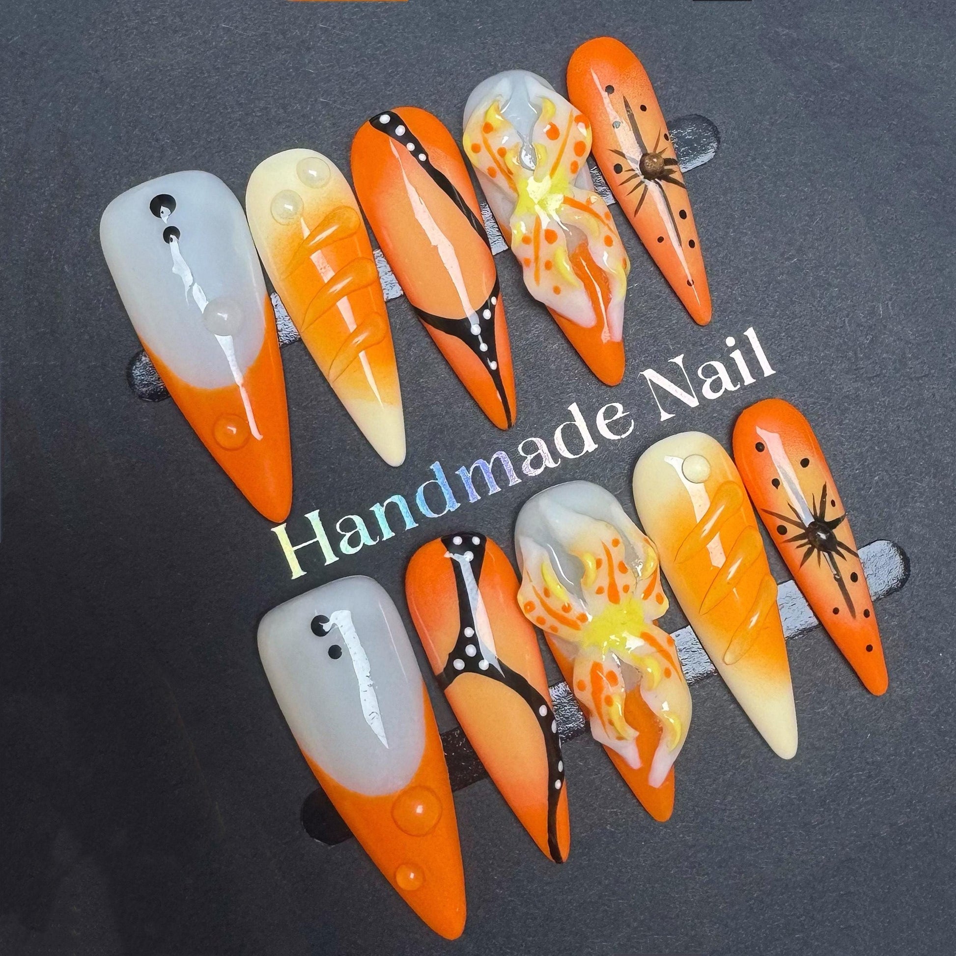 Take flight with this vibrant set of monarch butterfly-inspired press-on nails. Featuring a fiery blend of orange, cream, and soft gray hues, each nail mimics the elegance and motion of butterfly wings. Intricate details include black wing veining with dotted accents, sunburst-style designs, and two bold 3D florals that resemble blooming petals in motion. The stiletto shape enhances the dramatic silhouette, making this set perfect for nature lovers, festival goers, and anyone craving eye-catching glam. Handcrafted and reusable, these nails are a wearable work of art.